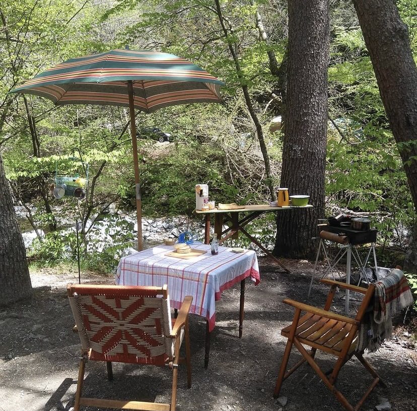 川辺の木陰でパラソルを広げてビンテージキャンプ♪な一枚。