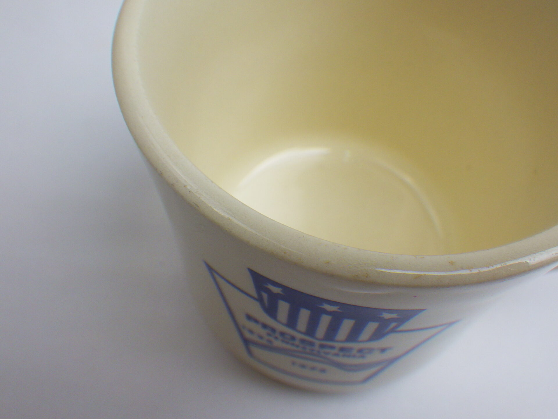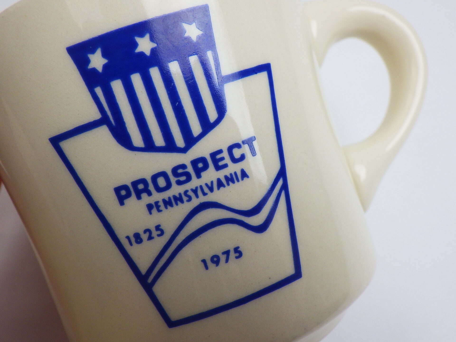 | アメリカで買い付けました。 ペンシルベニア州、プロスペクトとプリントされています。 シンプルですが絵になるデザインです。 コーヒーを飲むのに良いサイズ感ですね。 |
