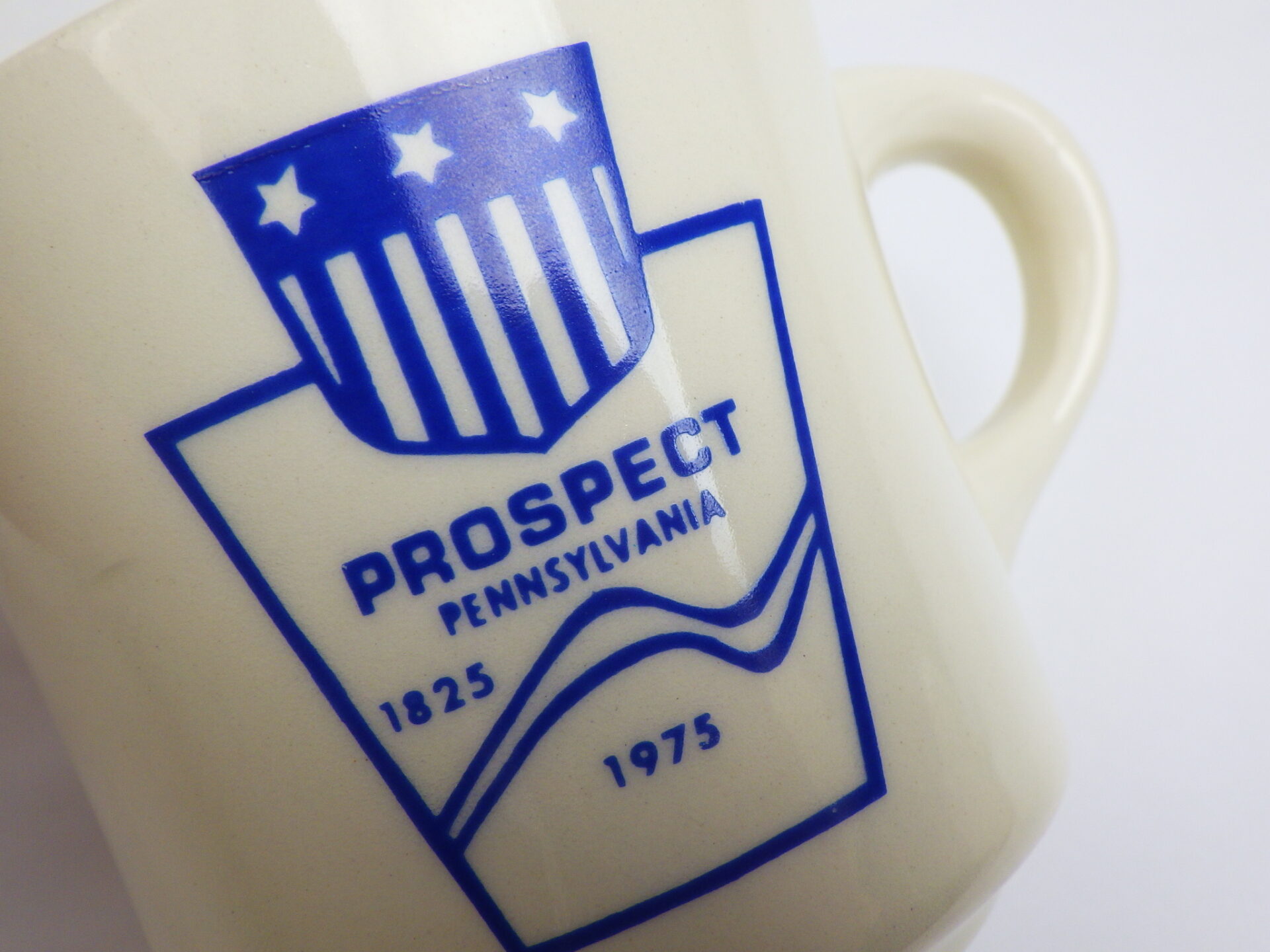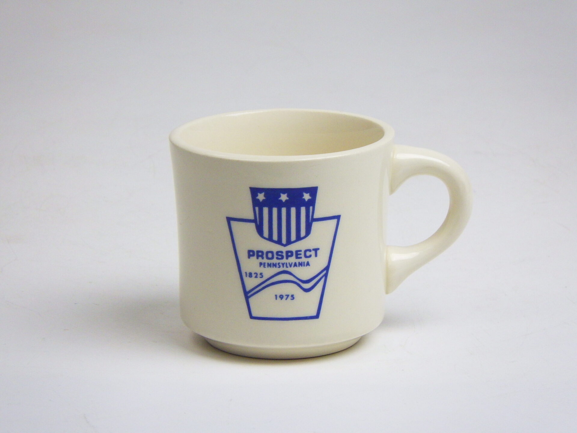 | アメリカで買い付けました。 ペンシルベニア州、プロスペクトとプリントされています。 シンプルですが絵になるデザインです。 コーヒーを飲むのに良いサイズ感ですね。 |