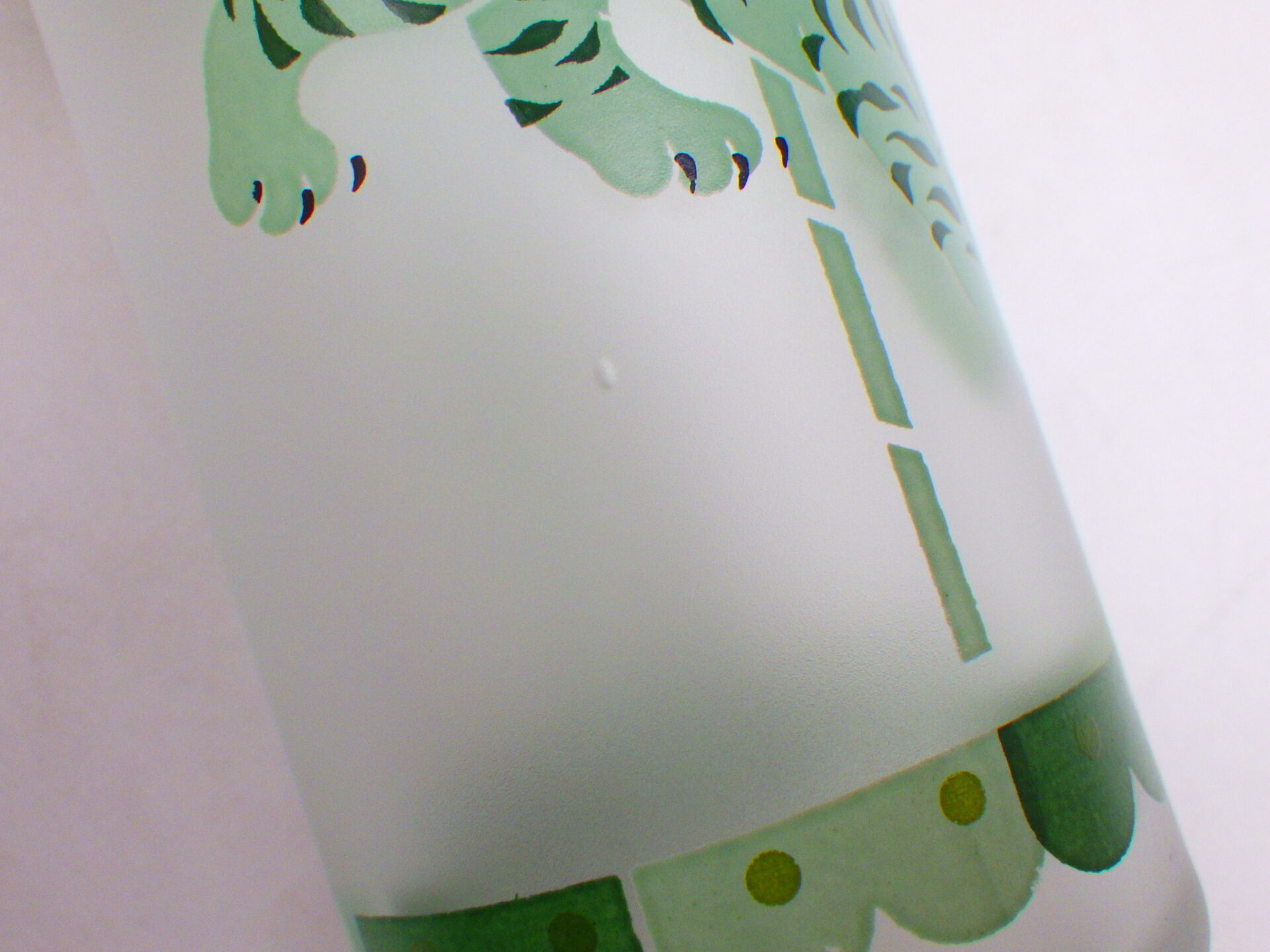 | 可愛いプリントのアイテムが多い、Libbey社のメリーゴーランド・アニマルグラスです。 表面が少し曇ったような加工のフロストガラスで出来ており、「手垢がつきにくい」ということで当時は重宝されていたようです。 いくつか揃えて飾ってみても可愛いですし、ロングタンブラーサイズなので氷を入れてコールドドリンクもたっぷり飲める、オススメのアイテムです。 |