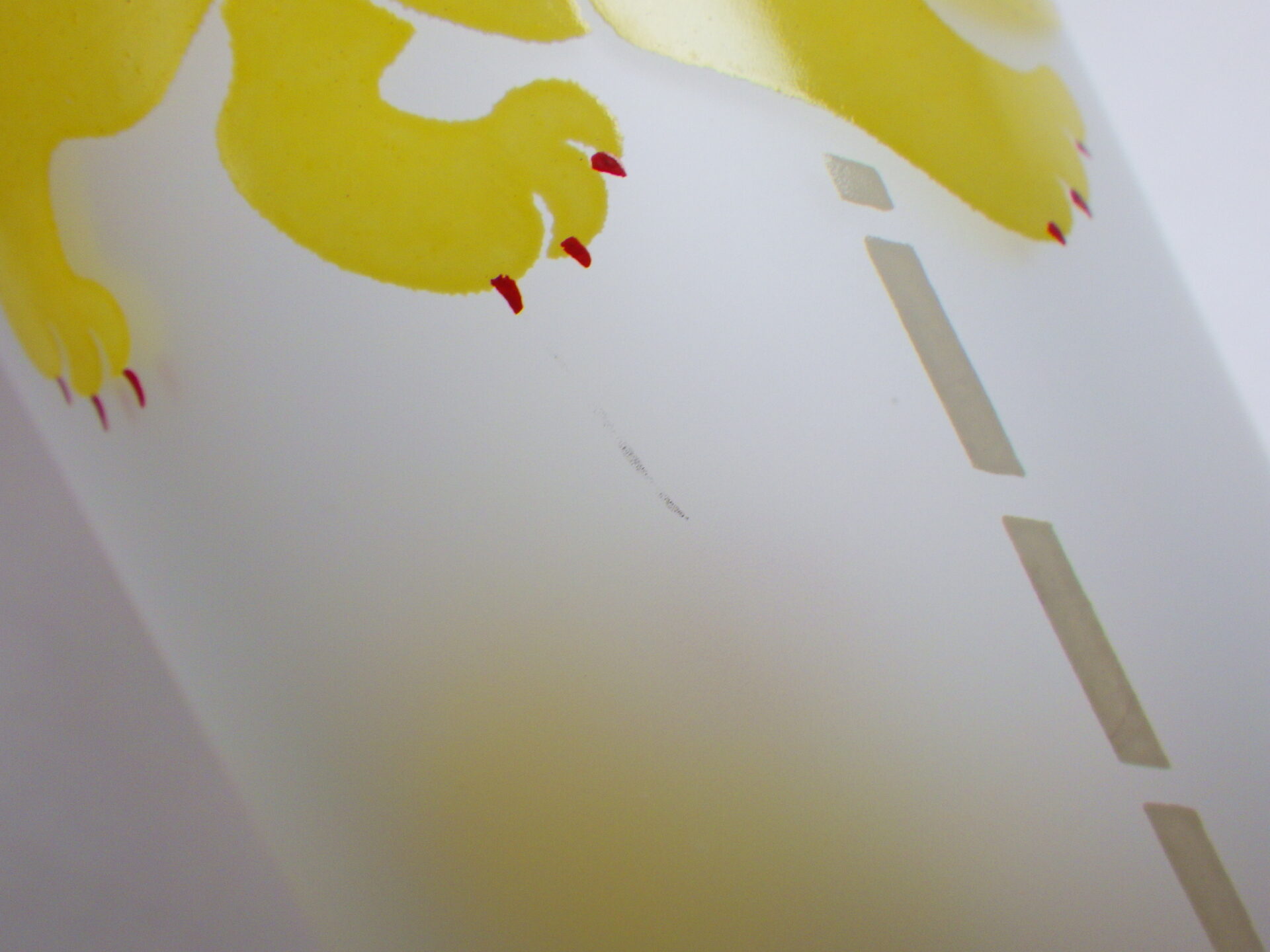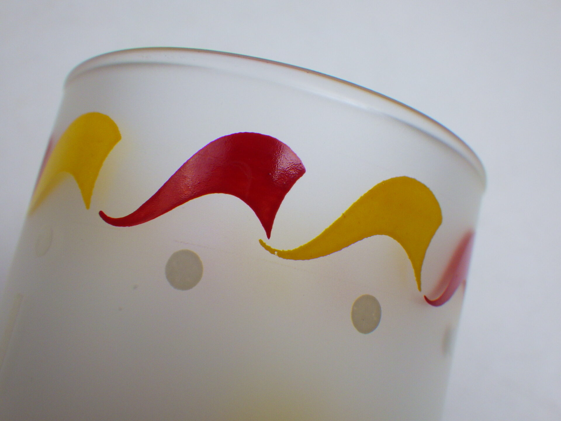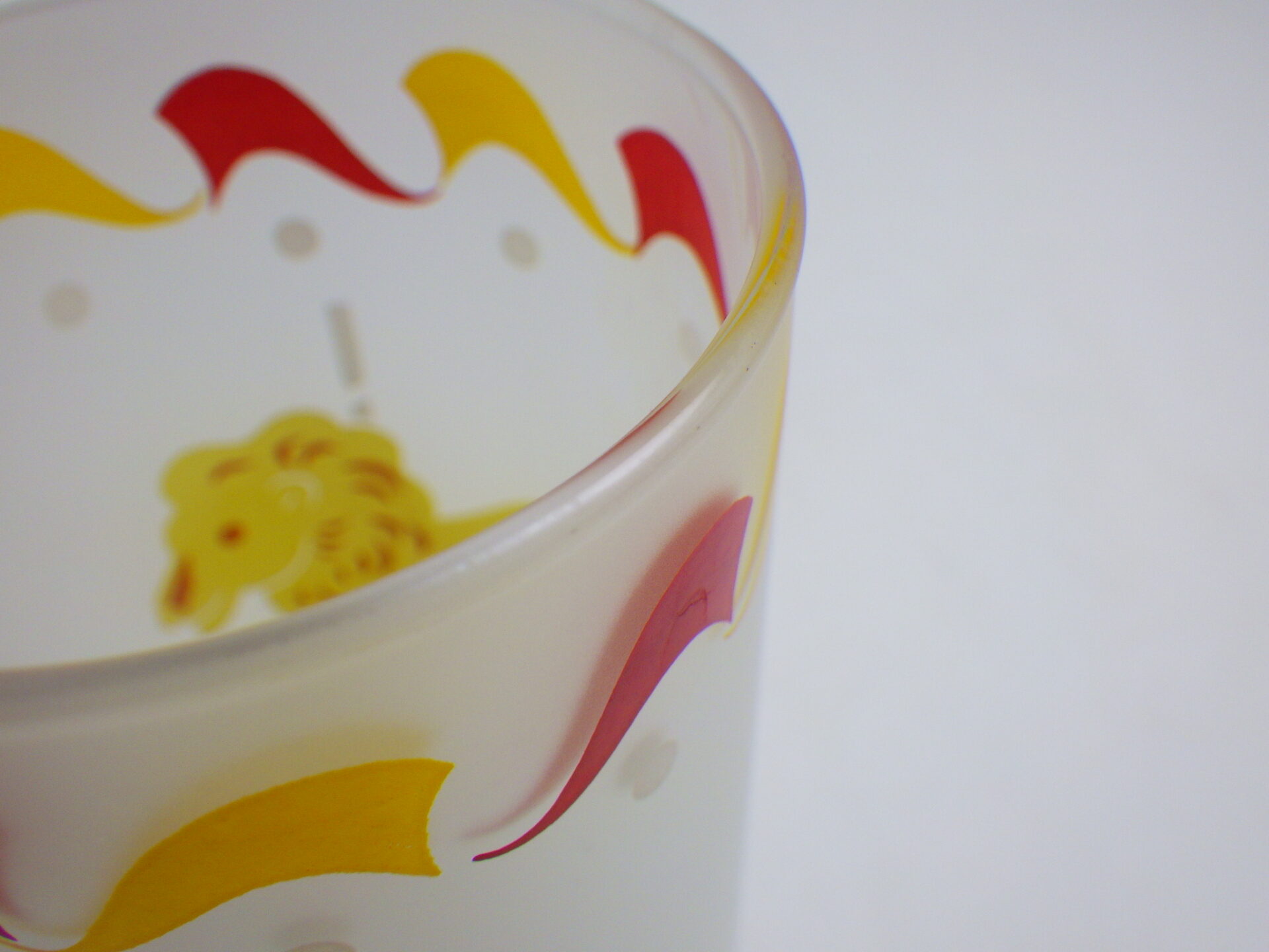 | 可愛いプリントのアイテムが多い、Libbey社のメリーゴーランド・アニマルグラスです。 表面が少し曇ったような加工のフロストガラスで出来ており、「手垢がつきにくい」ということで当時は重宝されていたようです。 いくつか揃えて飾ってみても可愛いですし、ロングタンブラーサイズなので氷を入れてコールドドリンクもたっぷり飲める、オススメのアイテムです。 |