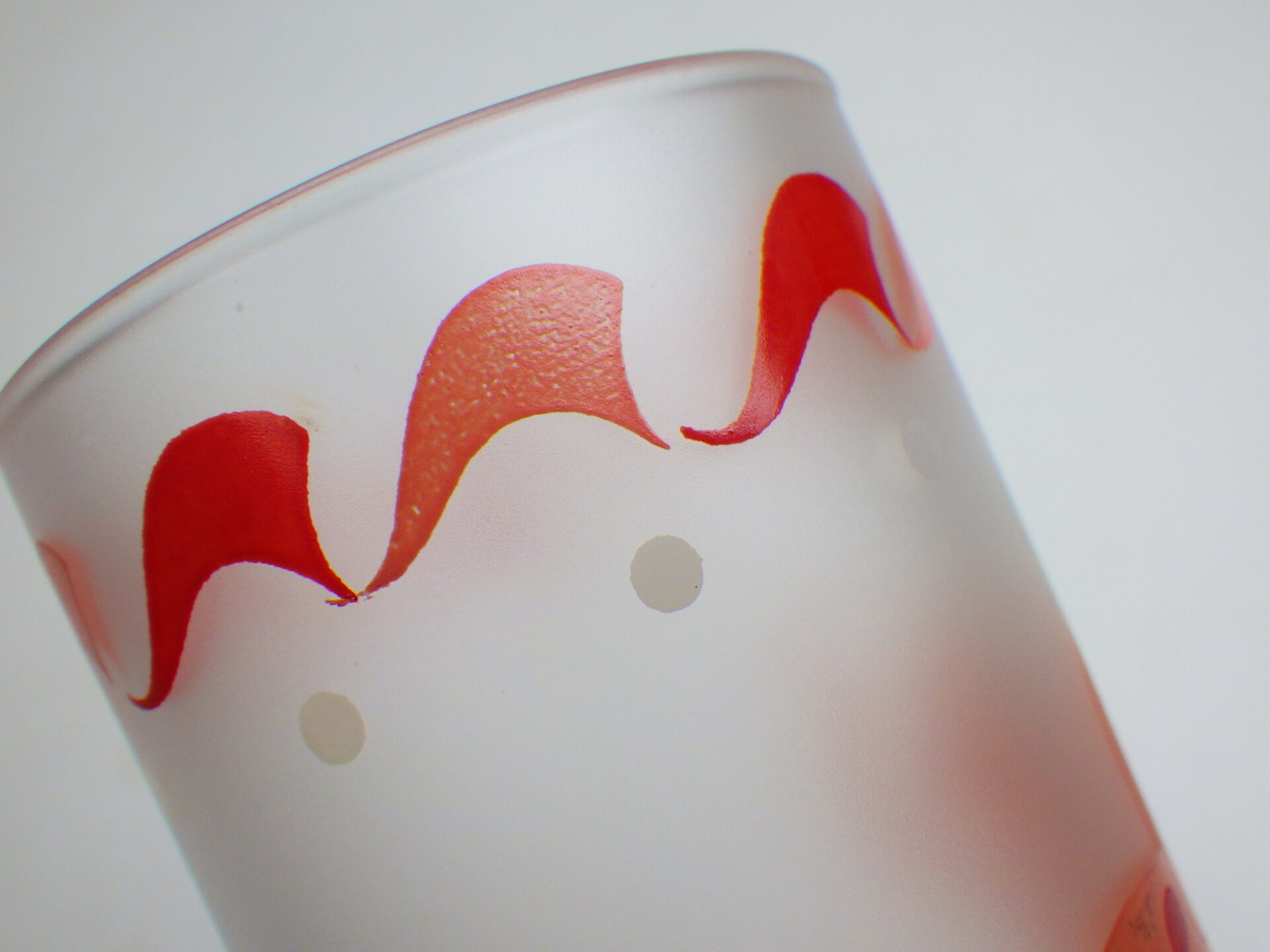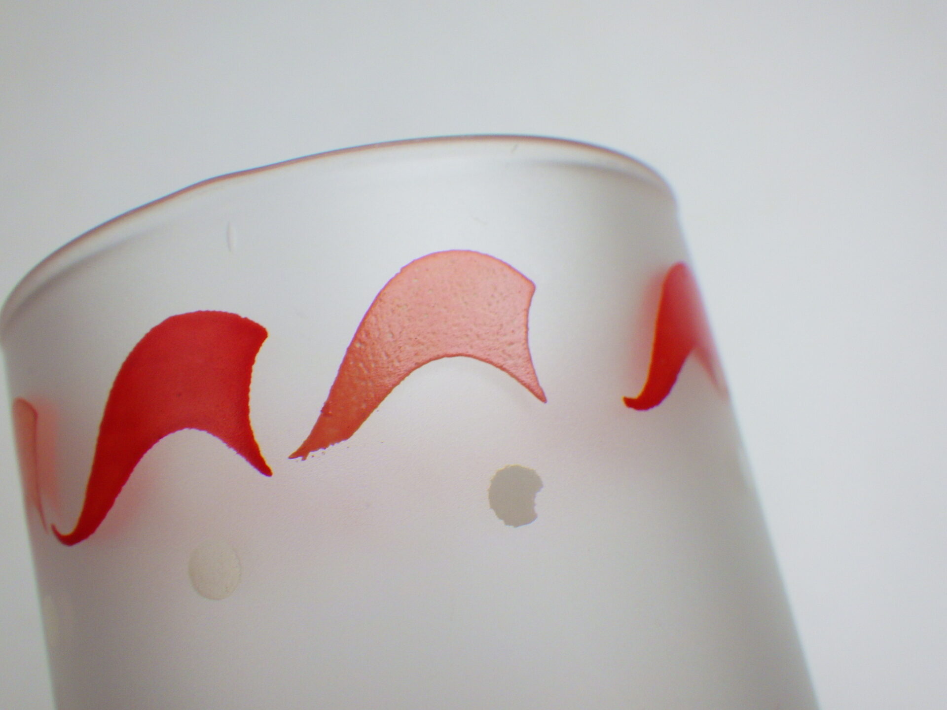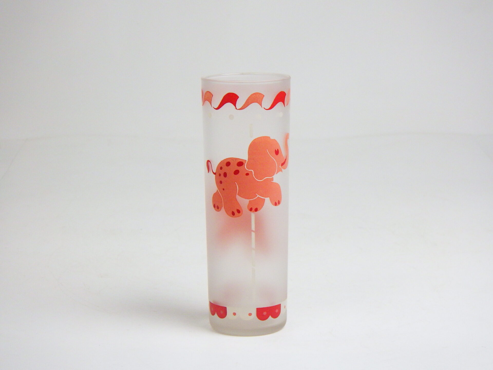 | 可愛いプリントのアイテムが多い、Libbey社のメリーゴーランド・アニマルグラスです。 表面が少し曇ったような加工のフロストガラスで出来ており、「手垢がつきにくい」ということで当時は重宝されていたようです。 いくつか揃えて飾ってみても可愛いですし、ロングタンブラーサイズなので氷を入れてコールドドリンクもたっぷり飲める、オススメのアイテムです。 |