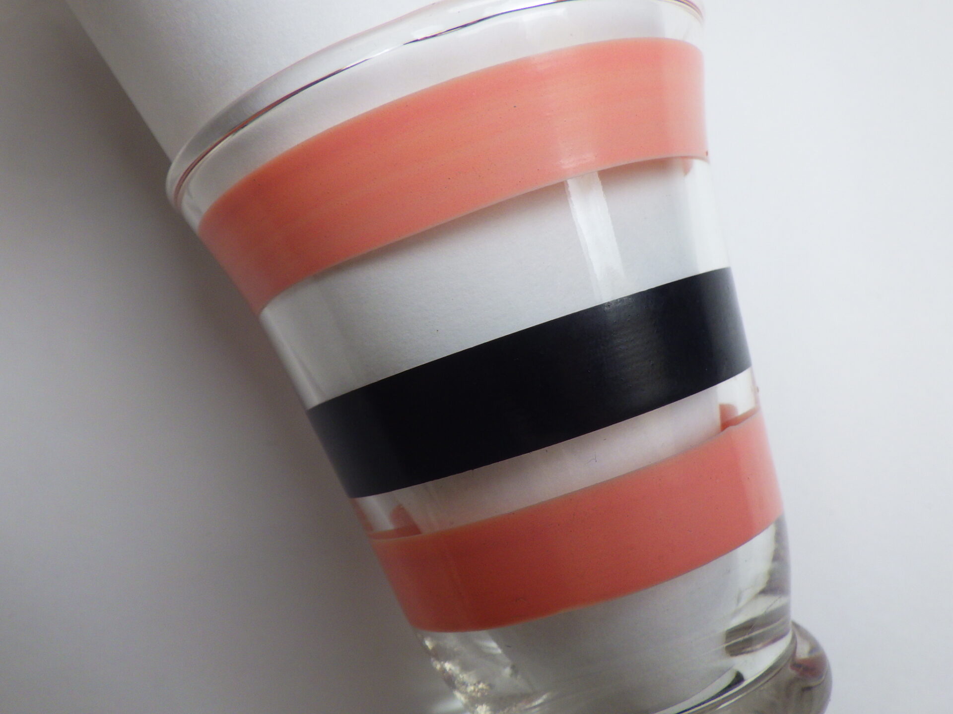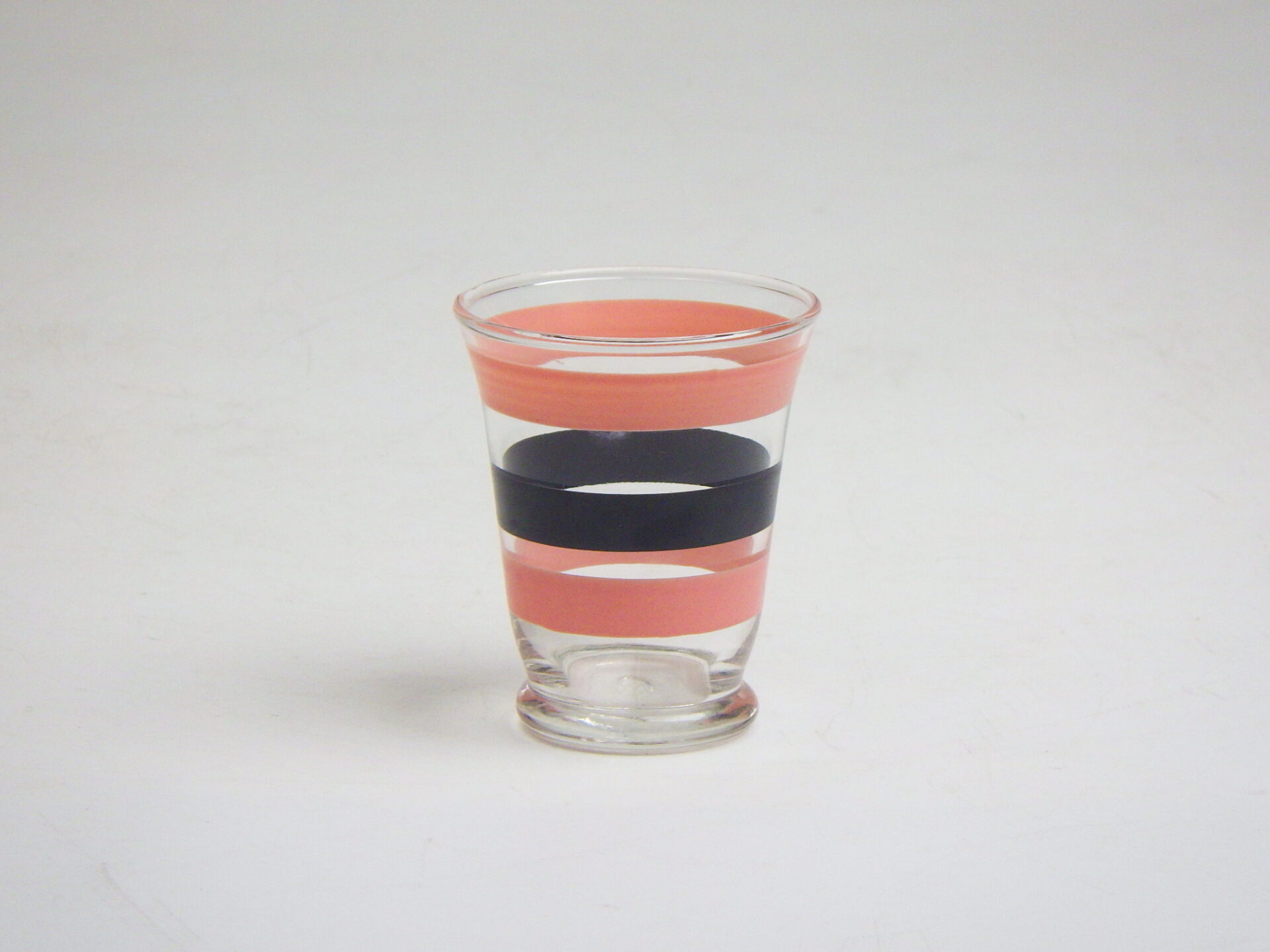 | 1950年代に人気のあった「ピンク×ブラック」の配色のビンテージグラス。 当時は洋服など様々なアイテムがこの配色で製造されました。 フィフティーズ好きな方にオススメのアイテムです。 こちらはかなり小ぶりなサイズ。ショットグラスとして使ったり、小さな草花を活けて花瓶にしても良さそうですね。 ※裏面に刻印(アンカーマーク)があります。 |