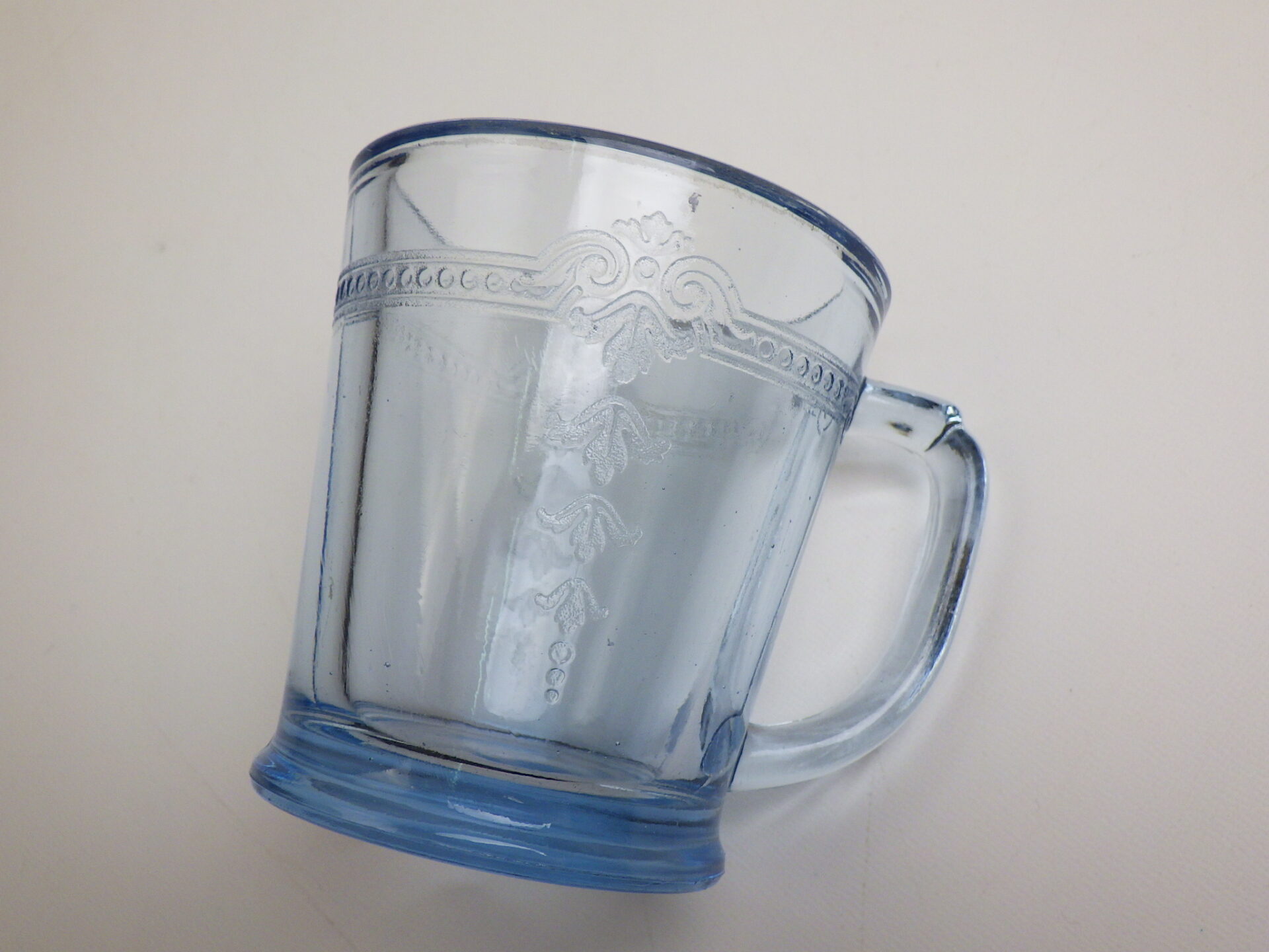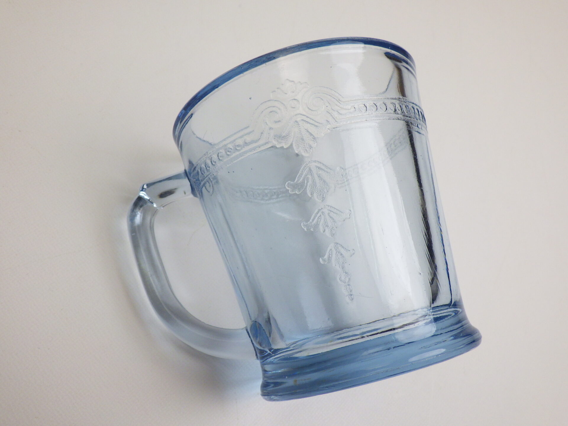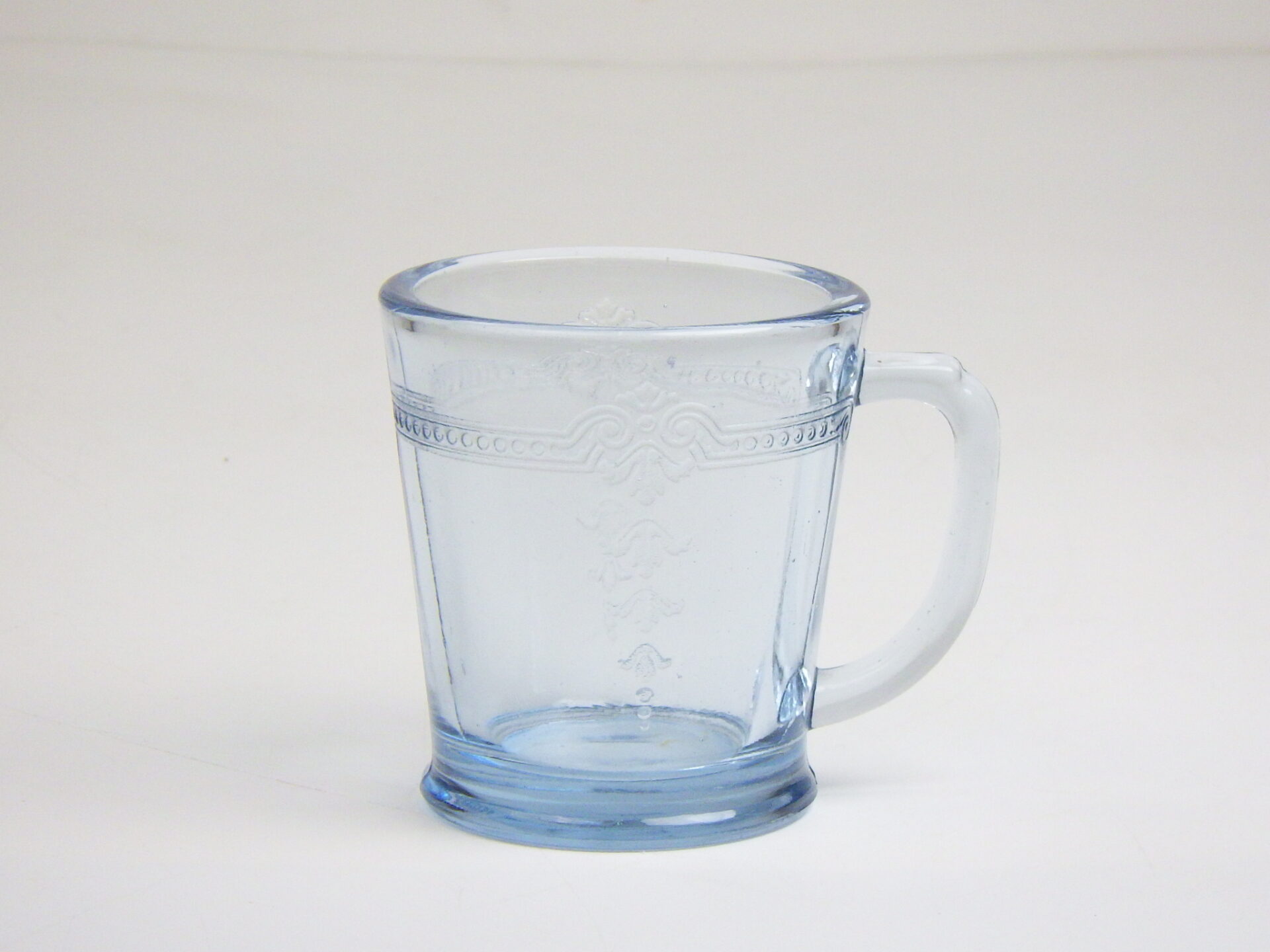 | エンボス加工が施された美しいDハンドルマグ。 サファイヤブルーのフィルビーシリーズは、ファイヤーキングブランドがスタートするより前に製造が始まっているため、Fire-king刻印が入っていないものが多く存在します。 ※こちらは刻印なしです。 |