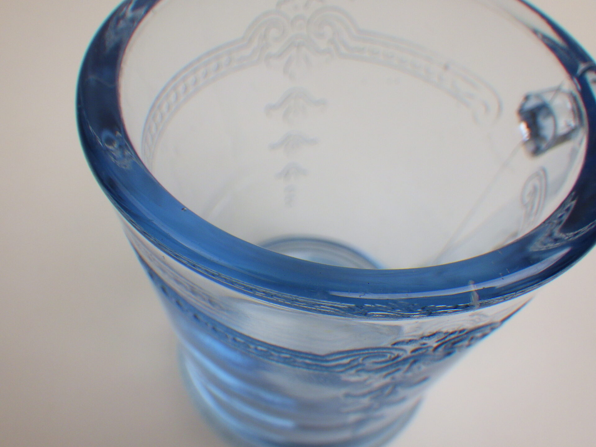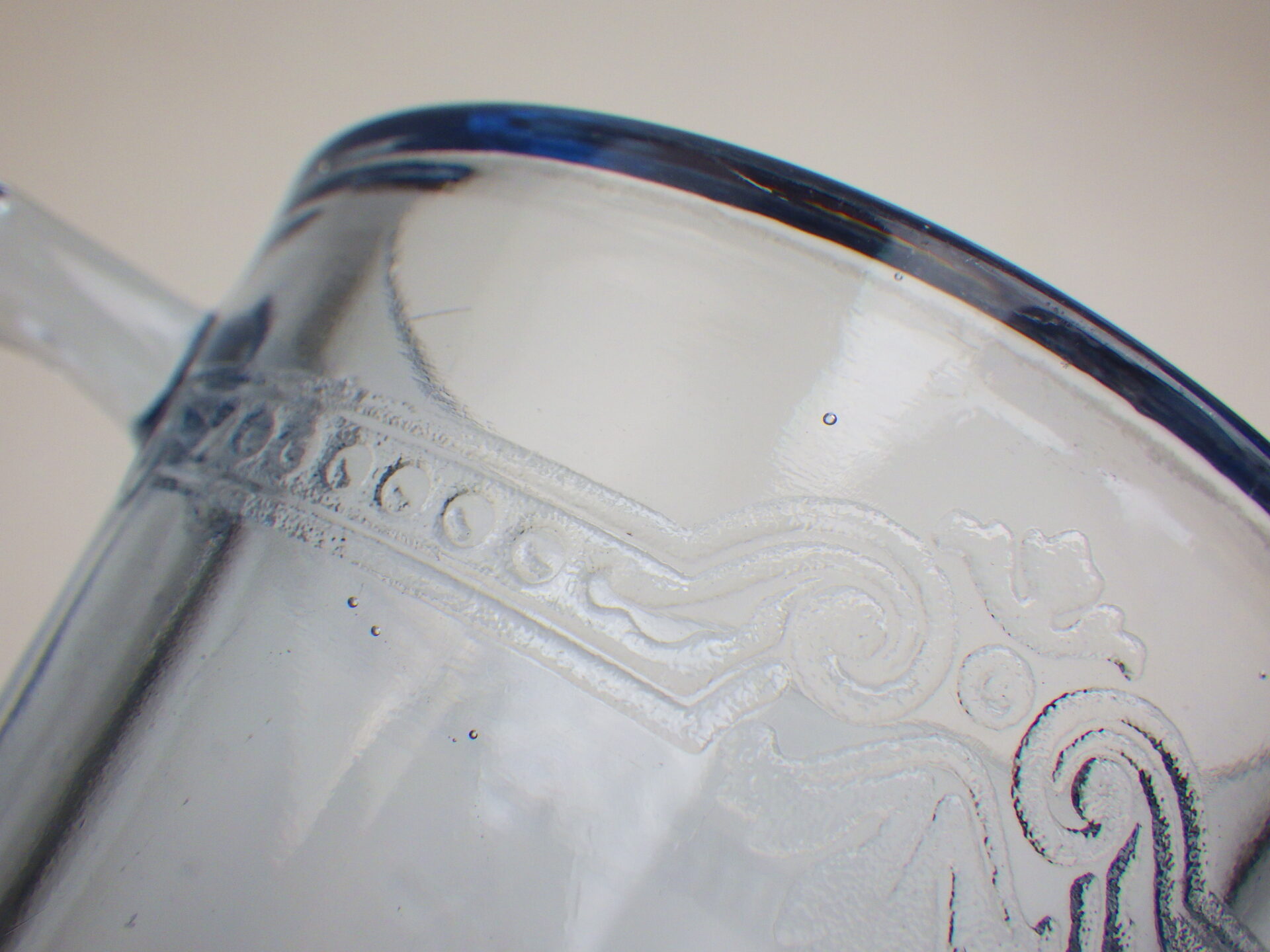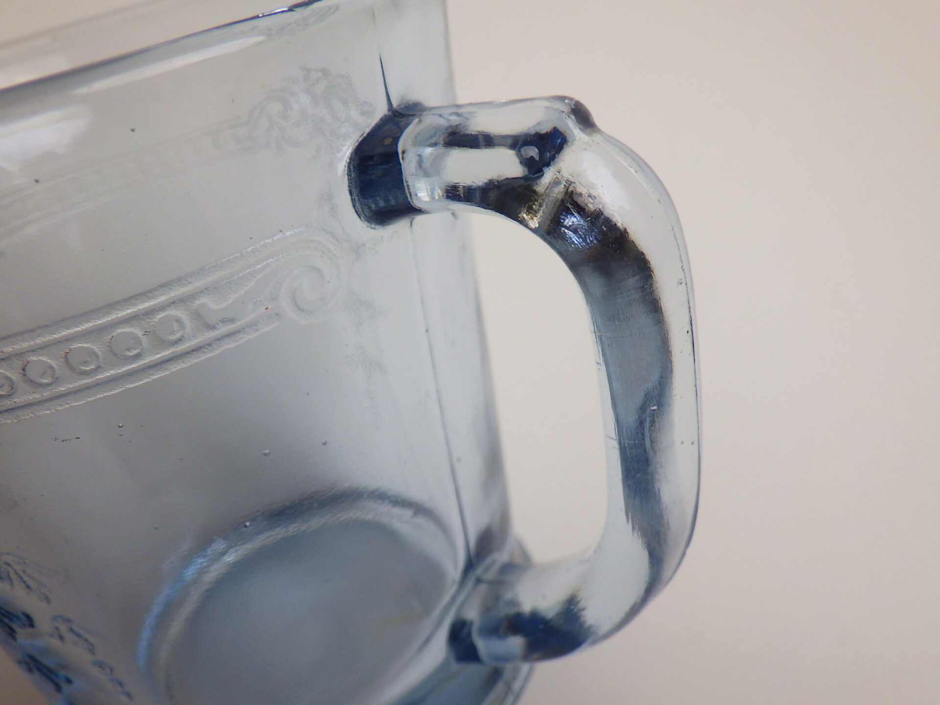 | エンボス加工が施された美しいDハンドルマグ。 サファイヤブルーのフィルビーシリーズは、ファイヤーキングブランドがスタートするより前に製造が始まっているため、Fire-king刻印が入っていないものが多く存在します。 ※こちらは刻印なしです。 |