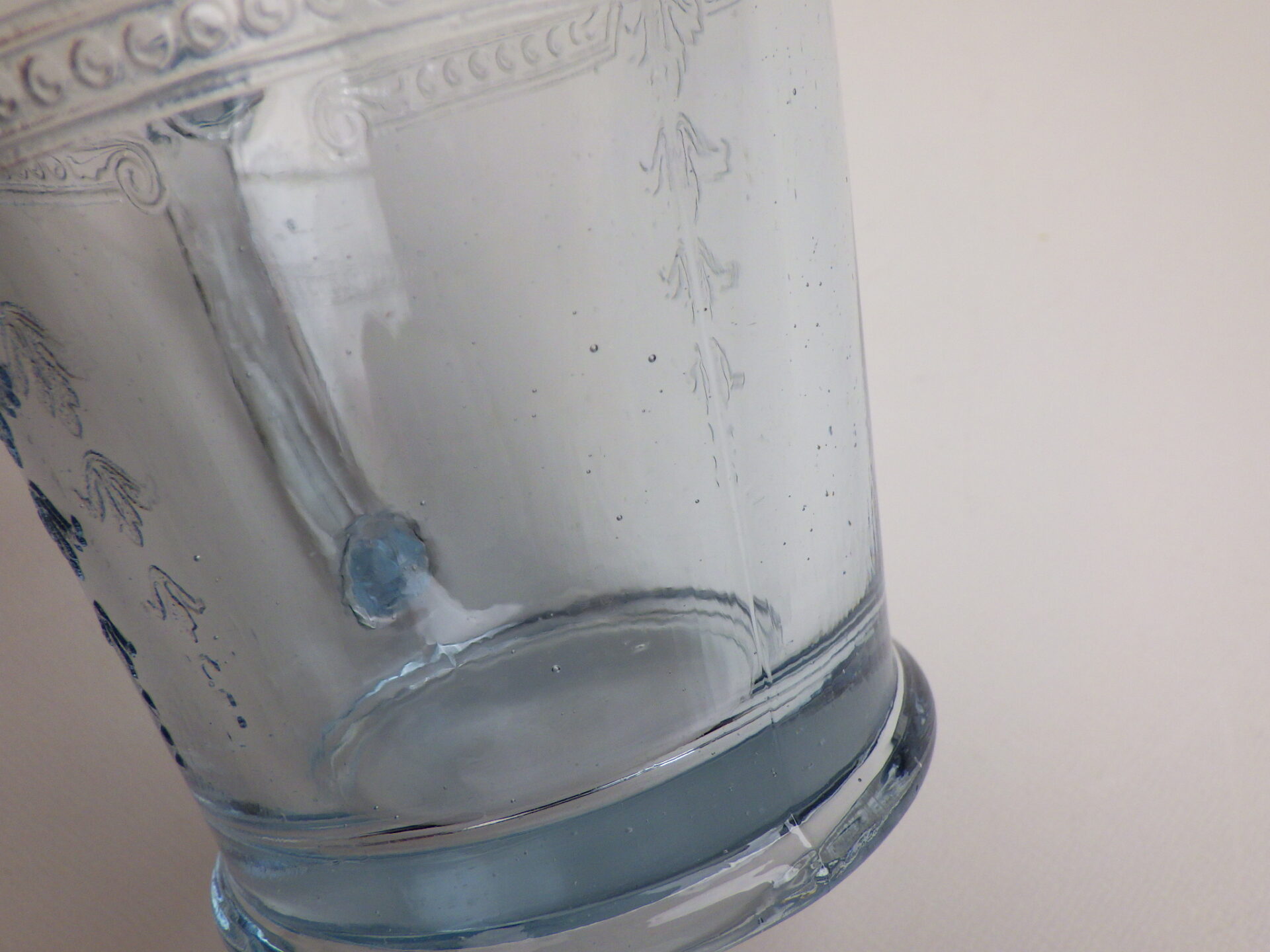 | エンボス加工が施された美しいDハンドルマグ。 サファイヤブルーのフィルビーシリーズは、ファイヤーキングブランドがスタートするより前に製造が始まっているため、Fire-king刻印が入っていないものが多く存在します。 ※こちらは刻印なしです。 |