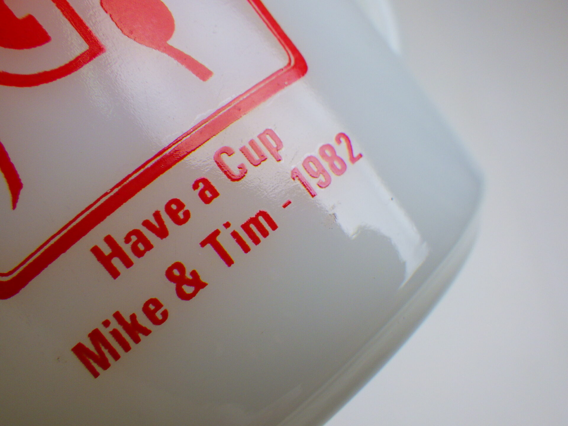 | オハイオ州キドロンの食用鶏肉の会社のアドマグのようです。 ホワイト地に赤のプリントがシンプルながら絵になります。 たっぷり容量なのでココアやスープなどを入れるのにもオススメですよ。 |