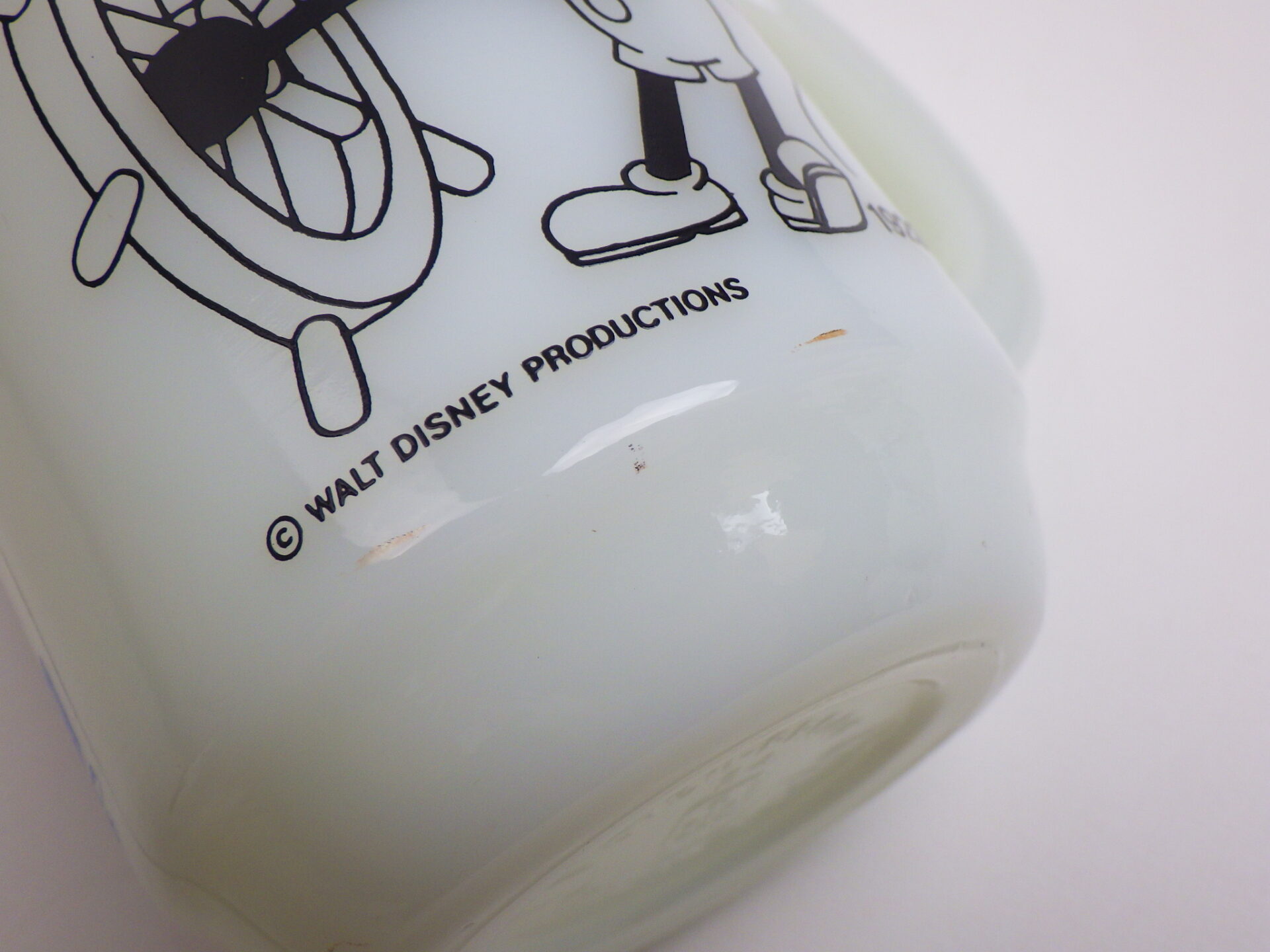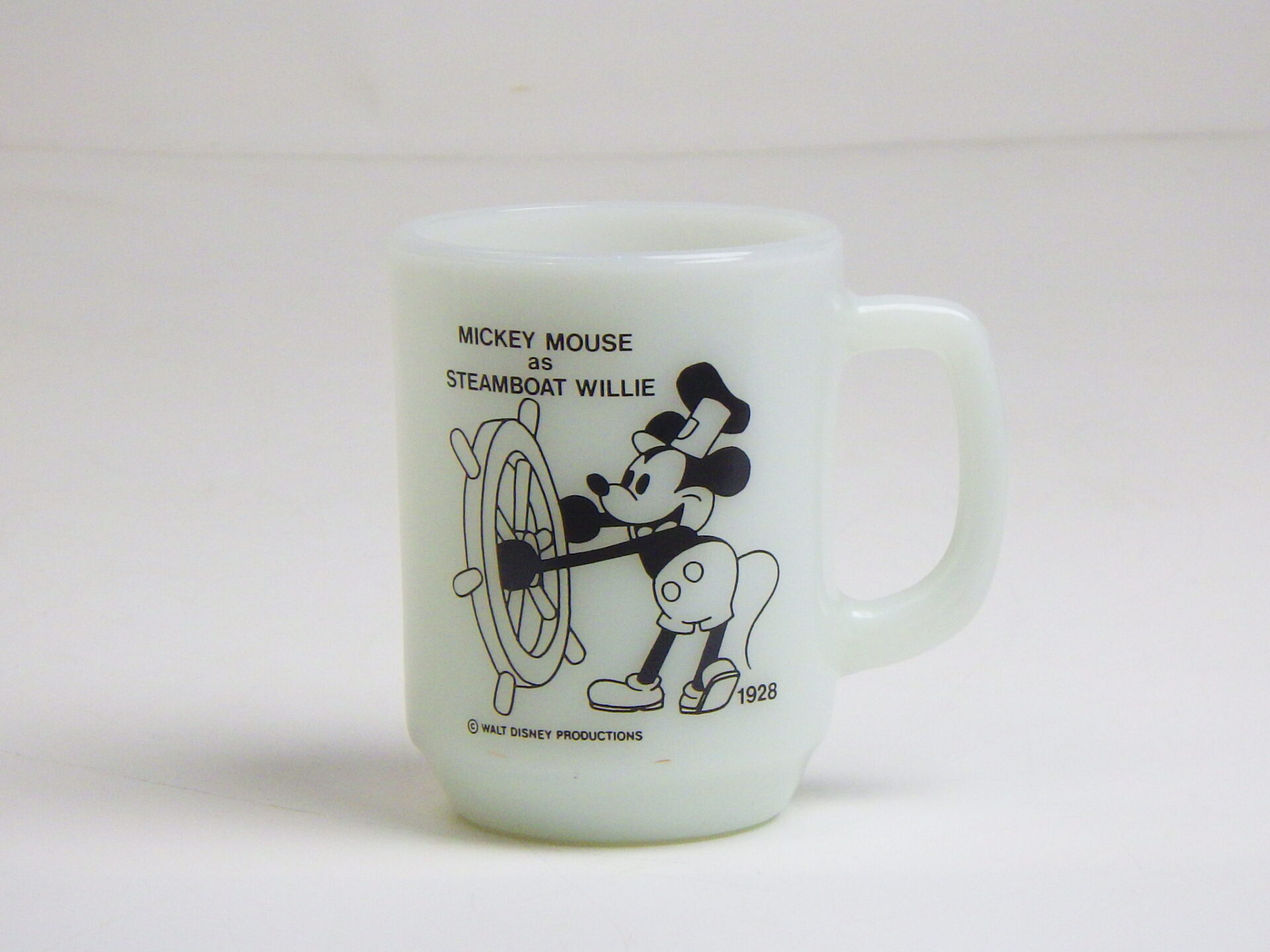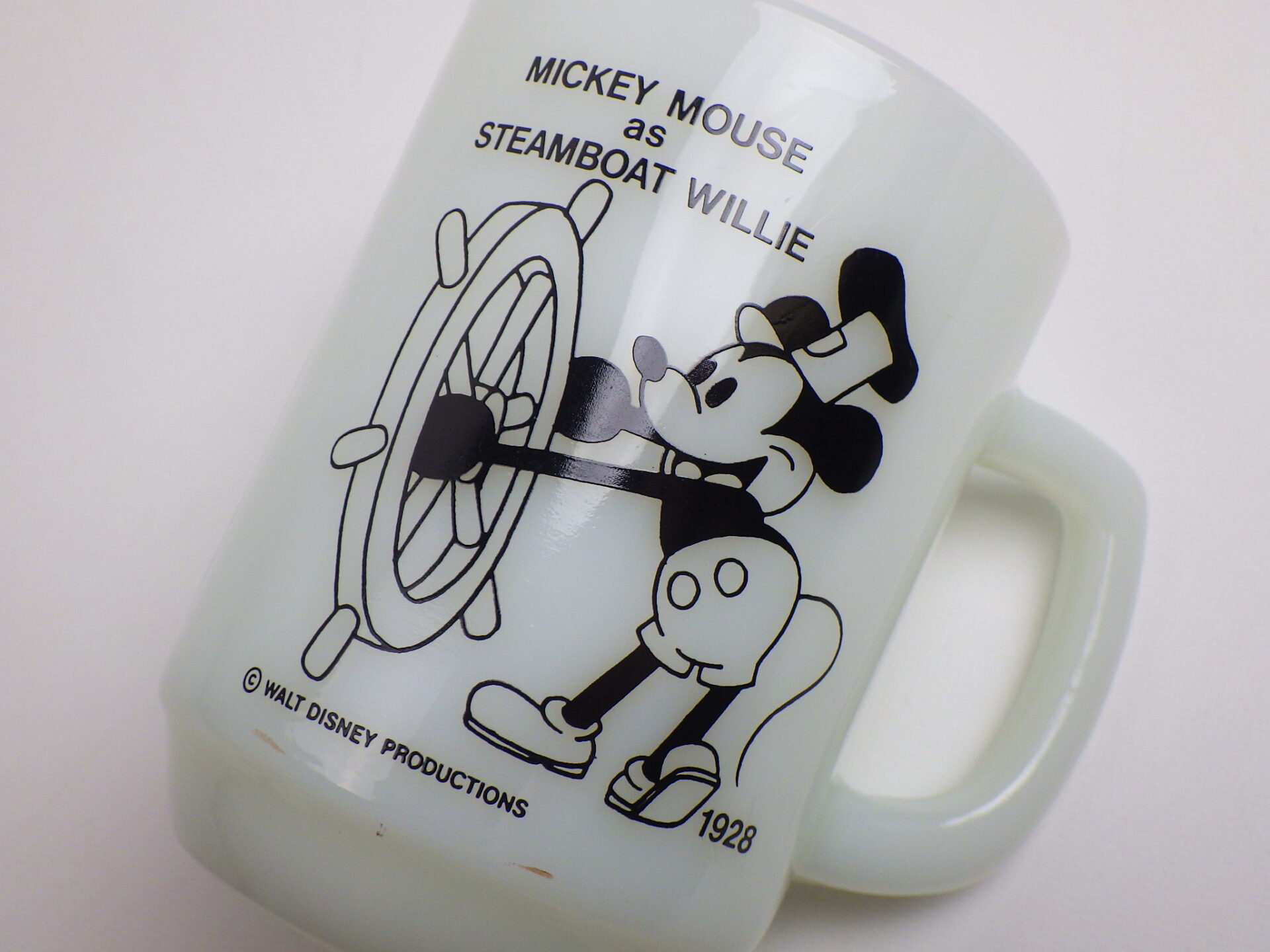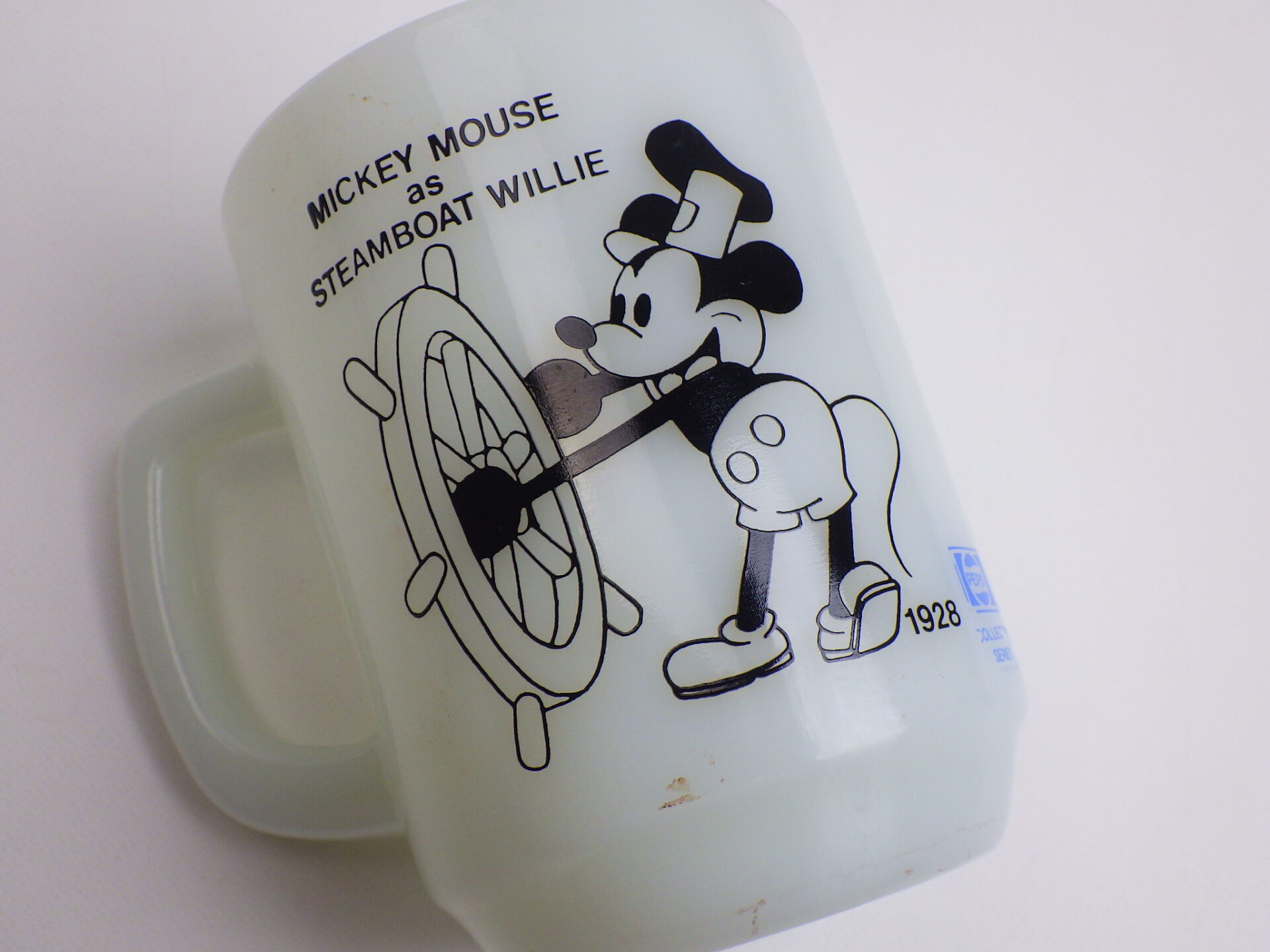 | 1980年にペプシがノベルティで作ったディズニーマグです。 ペプシのロゴもプリントされています。 こちらは1928年11月18日にミッキーがスクリーンデビューを飾った作品「蒸気船ウィリー」がモチーフとなっています。 |