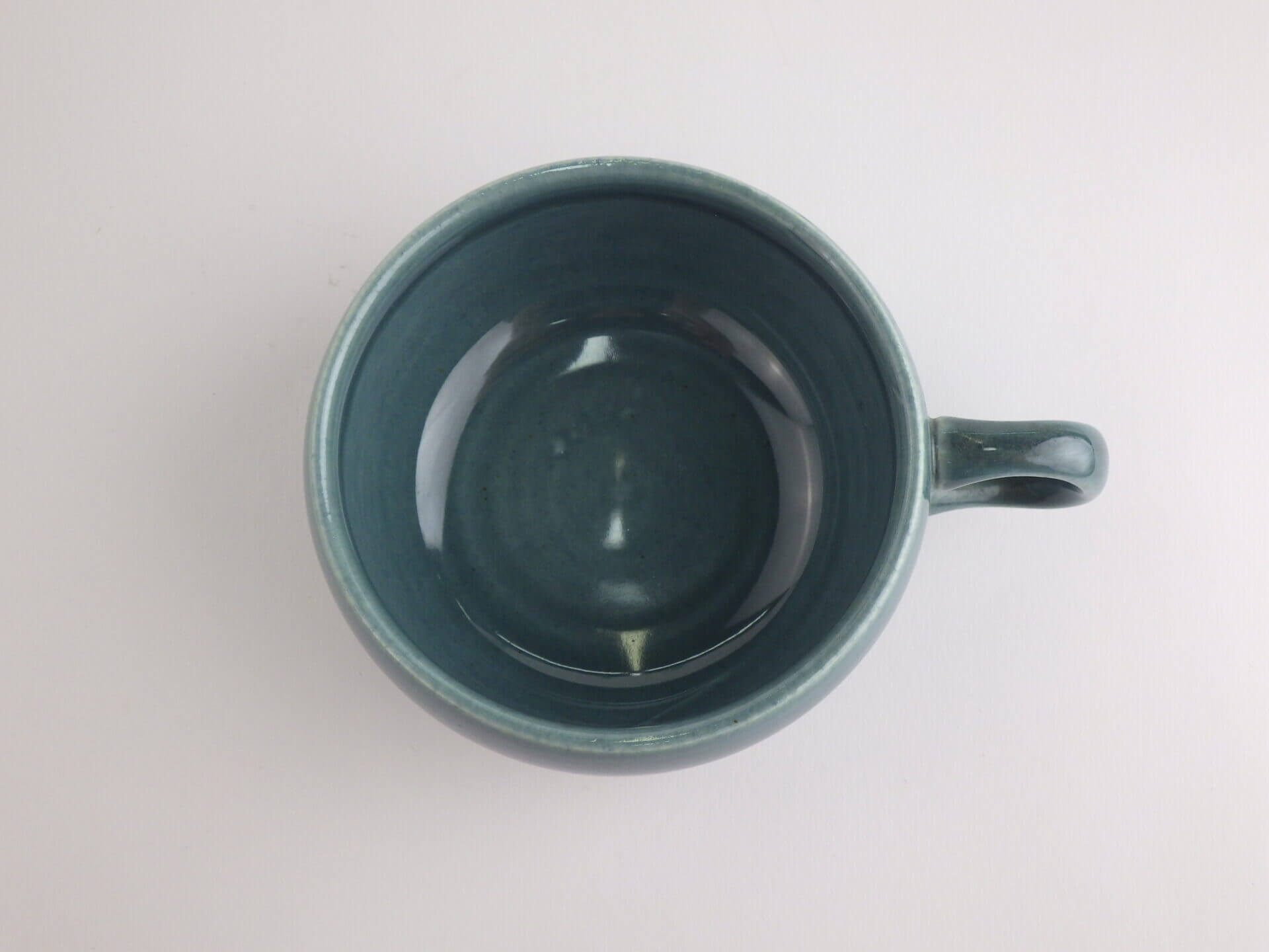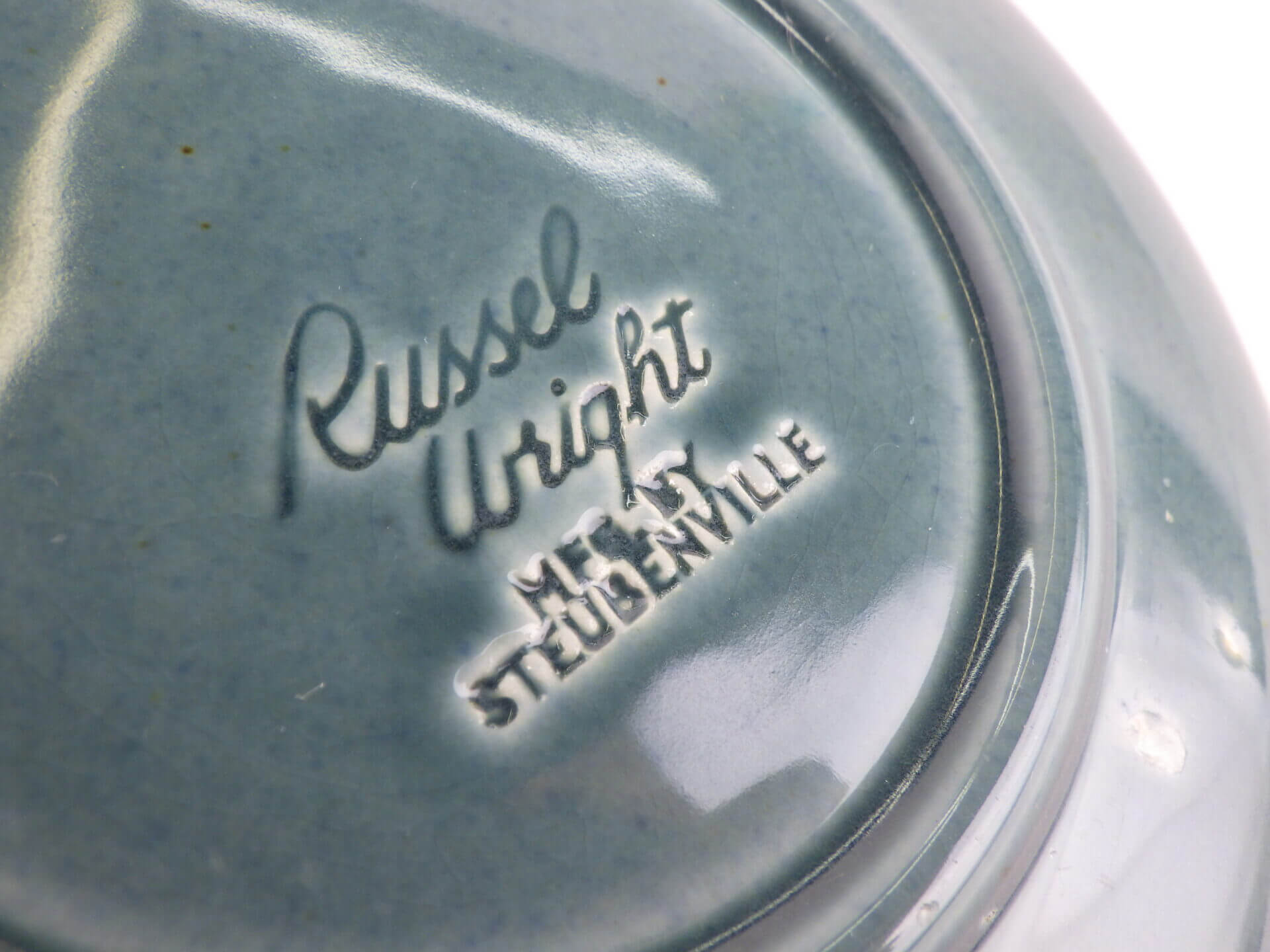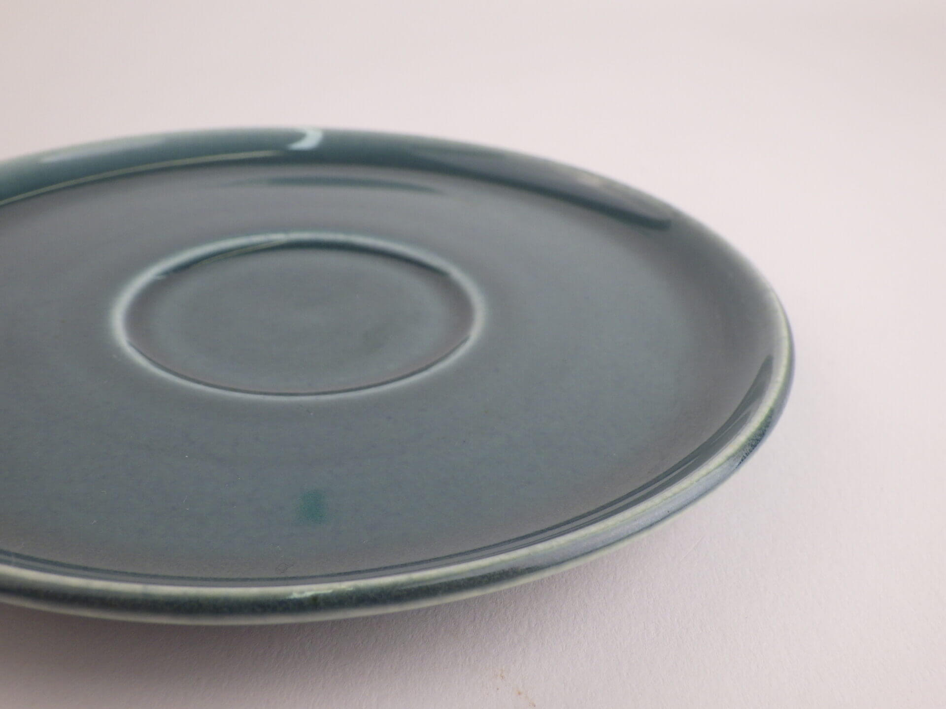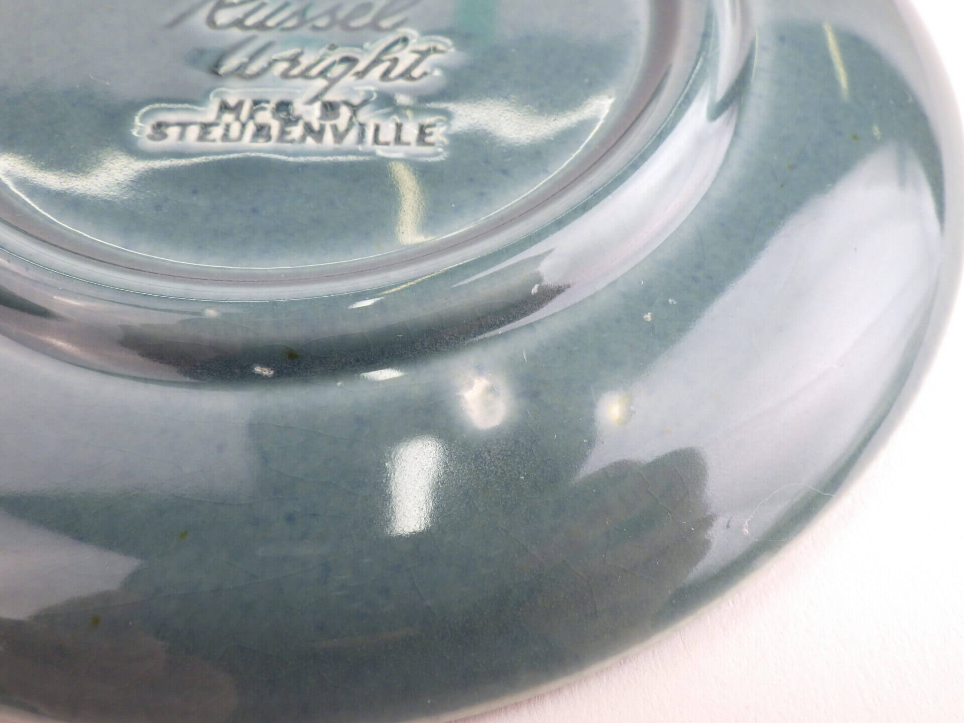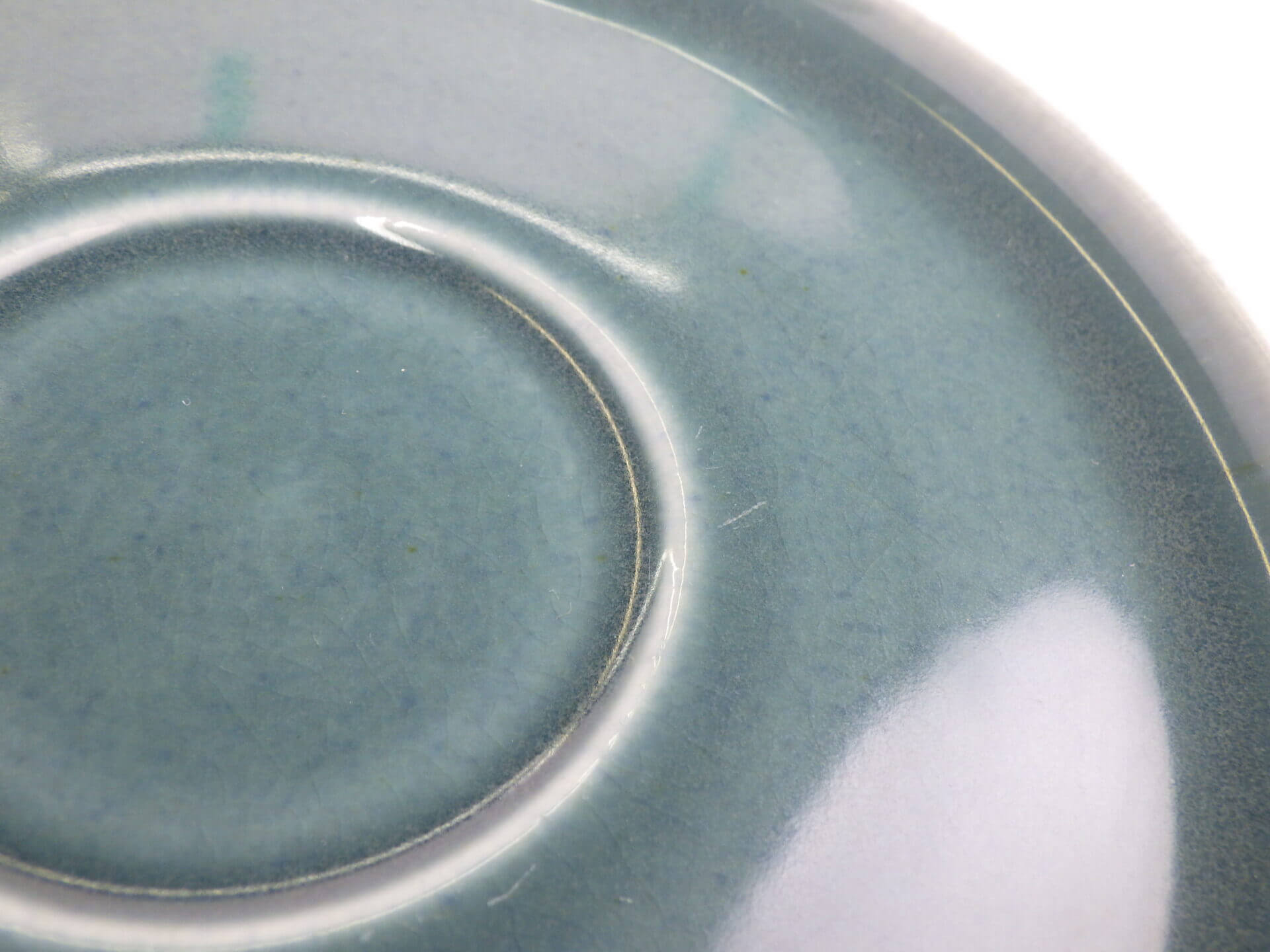 | 1939年から1959年に製造されたSteubenville(スチューベンヴィル)社製のアメリカンモダンシリーズです。 ラッセルライトらしい丸みがあり、縁がぽってりしているデザインで、とても可愛いですね。 シーフォームとは「海の泡」という意味で、深みのある青緑は味わいがあります。 |