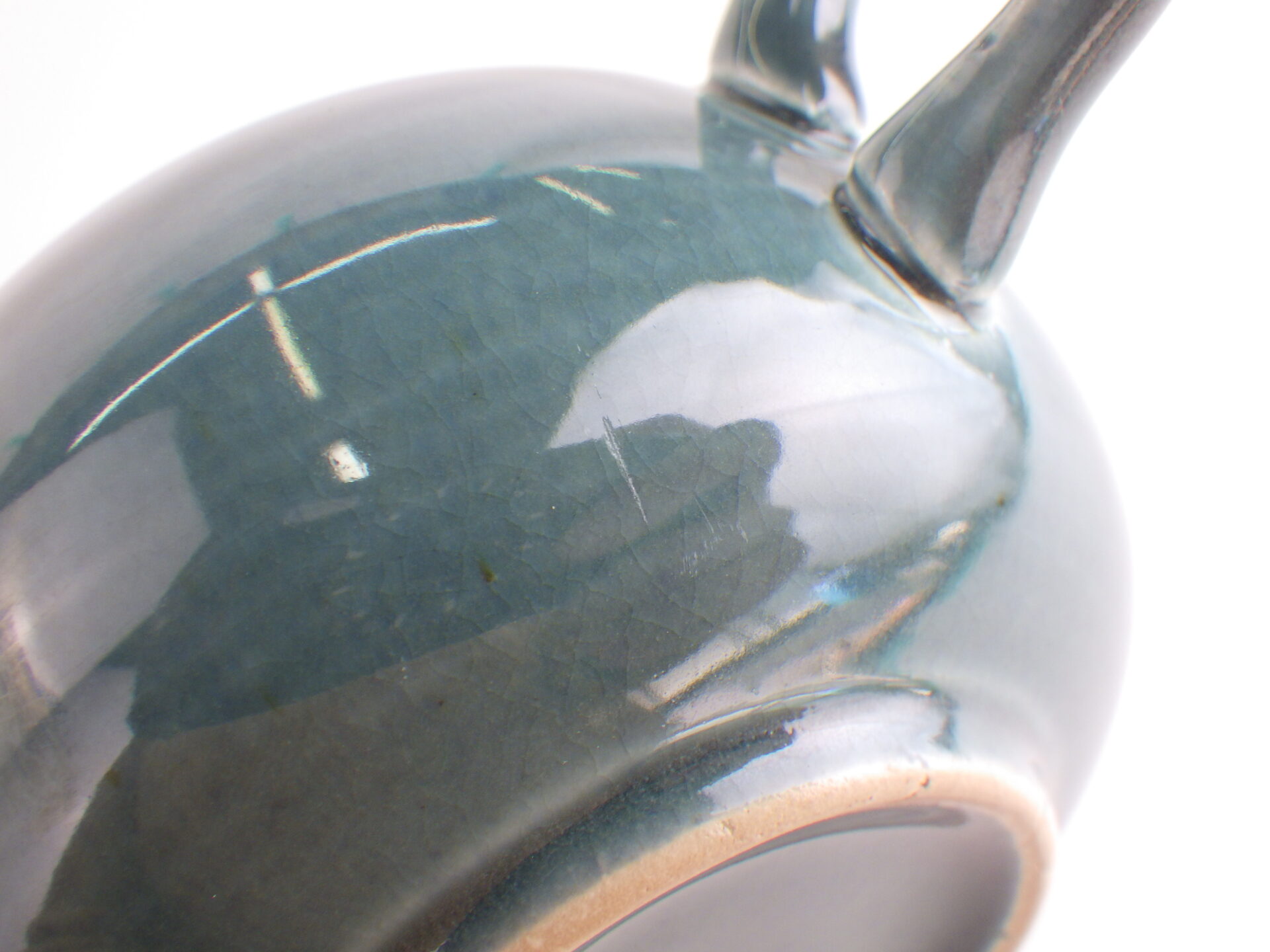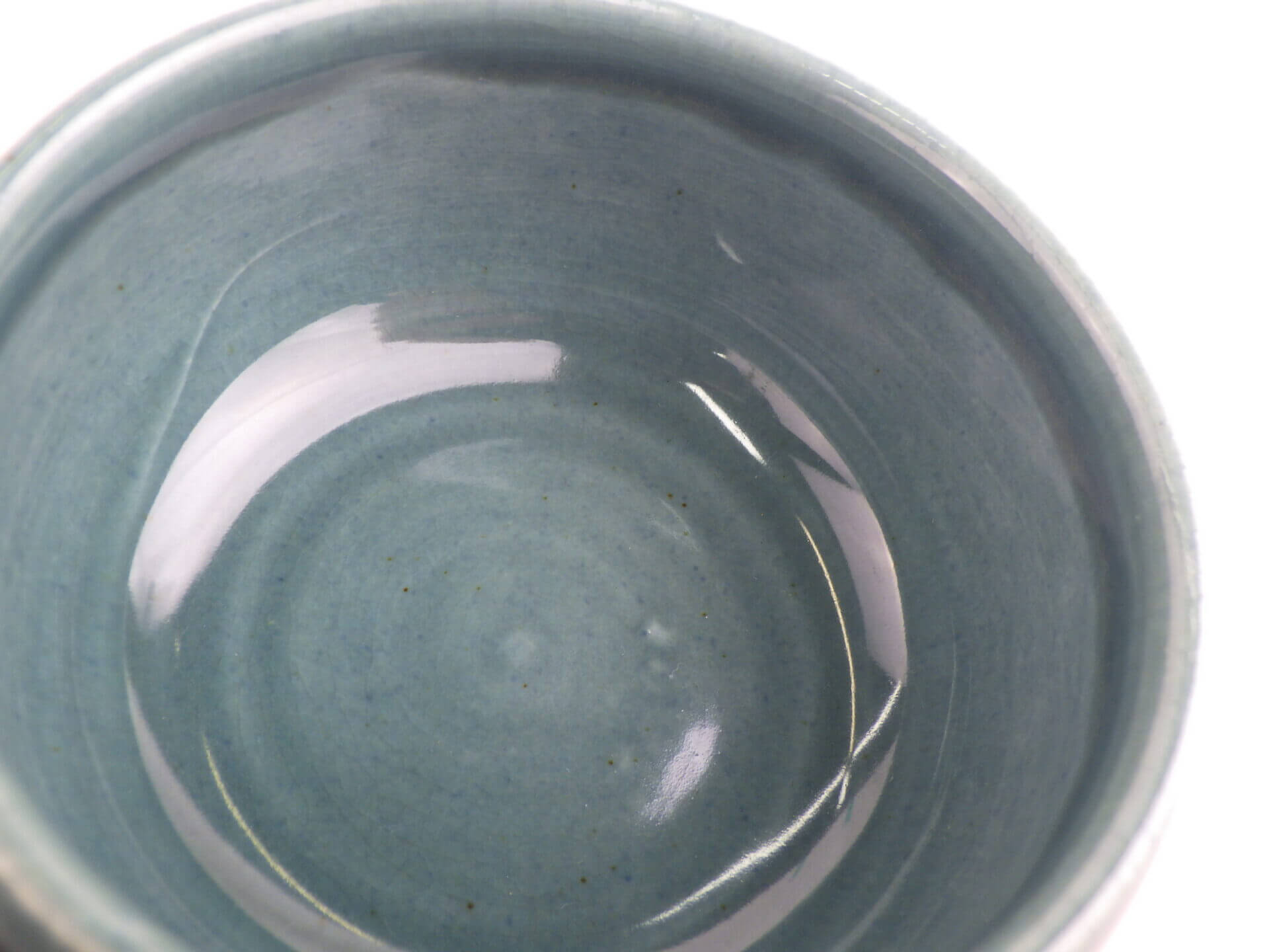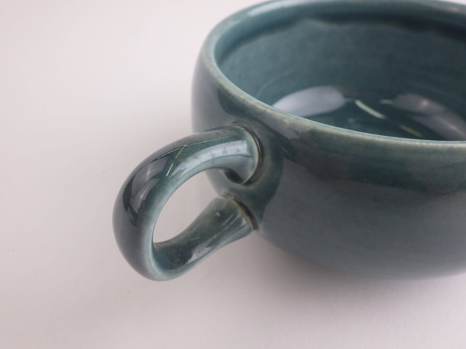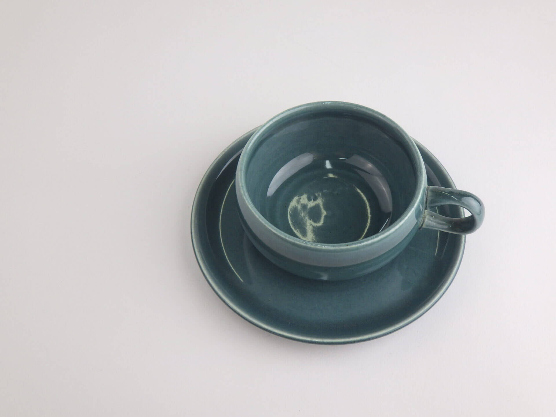 | 1939年から1959年に製造されたSteubenville(スチューベンヴィル)社製のアメリカンモダンシリーズです。 ラッセルライトらしい丸みがあり、縁がぽってりしているデザインで、とても可愛いですね。 シーフォームとは「海の泡」という意味で、深みのある青緑は味わいがあります。 |