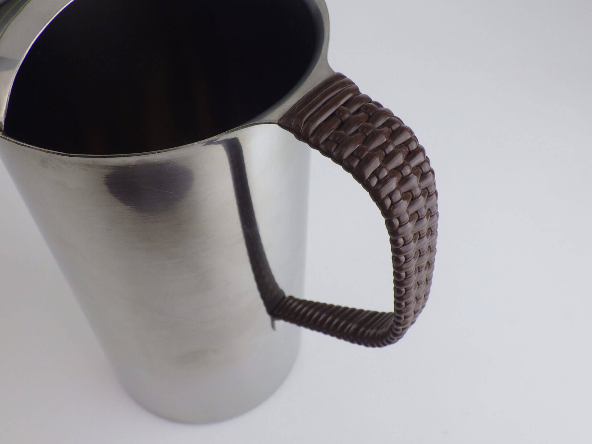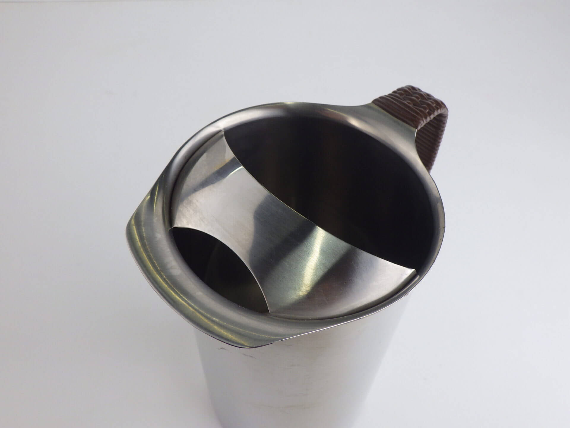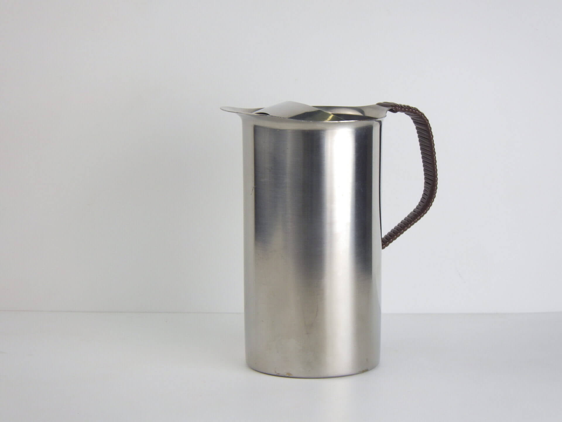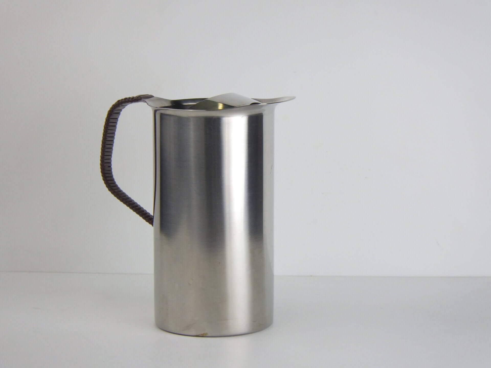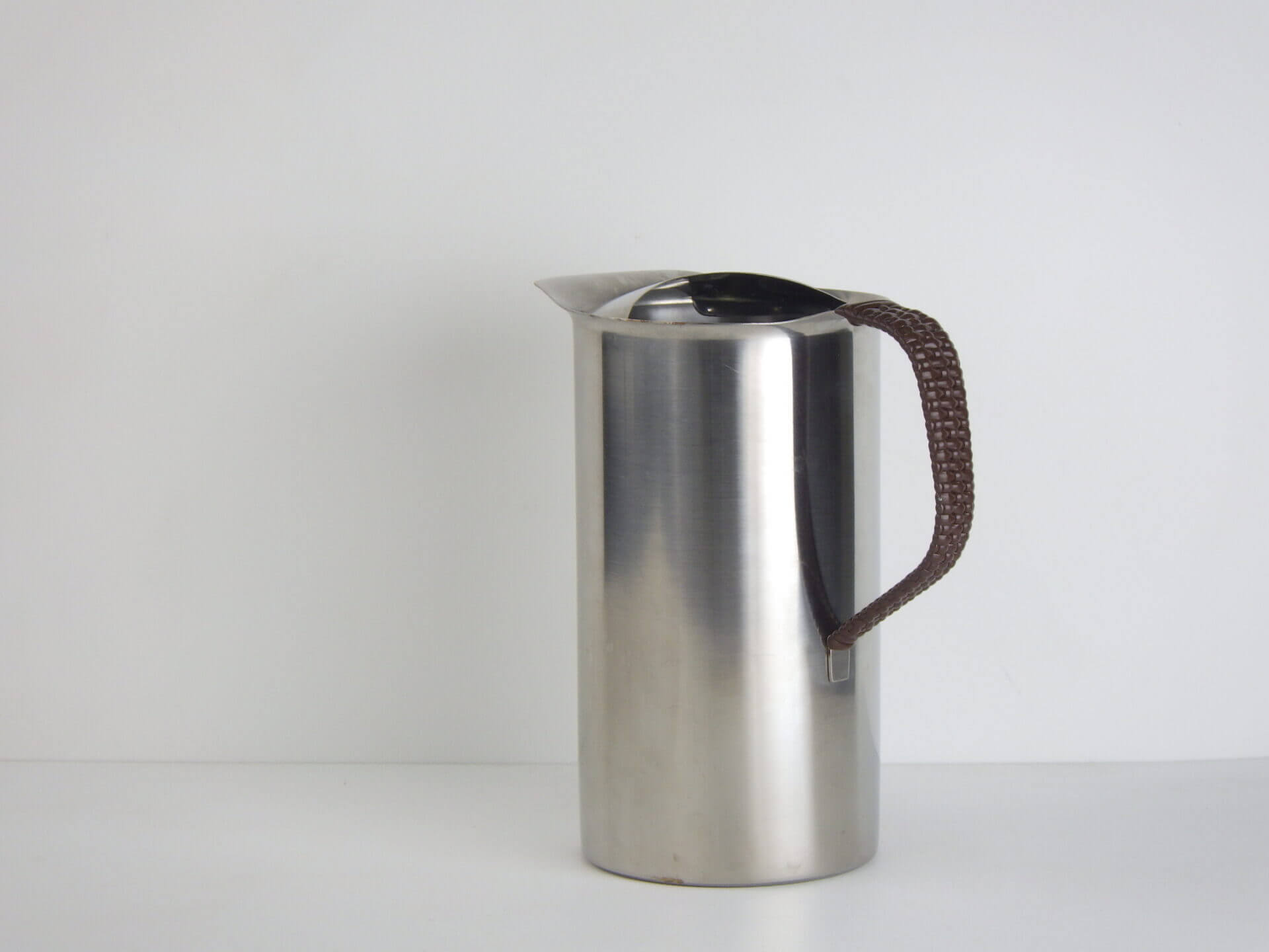 | デンマーク製のビンテージの水差しです。 ステンレスの本体がモダンで、絵になるアイテムですね。 持ち手も持ちやすく、注ぎ口には氷止めもついているため、アイスティーなどを作って氷で冷やしてサーブするのも良さそうですね。 |
