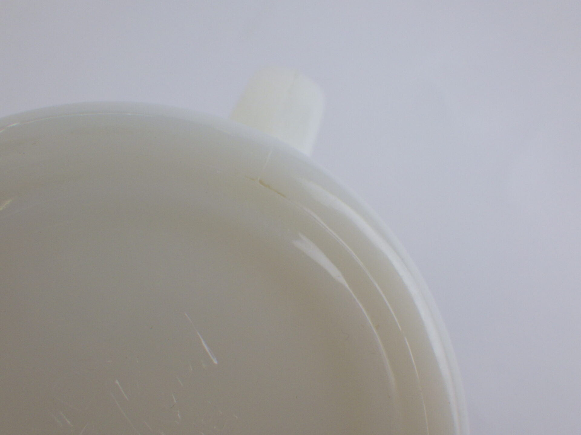 | condition | ミルクガラス特有のヘアライン、劣化線などあります。 ボトム、側面、ハンドル、リムに薄い着色があります。 その他ご使用に問題となるダメージはなく、ツヤもあり良い状態です。 不明な点や追加画像の必要な場合は、お気軽にお問い合わせください。 |
