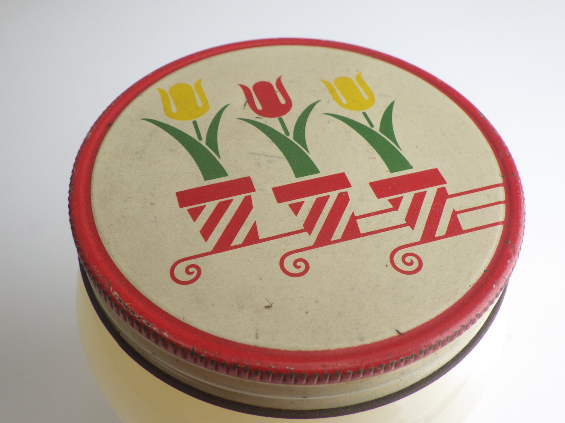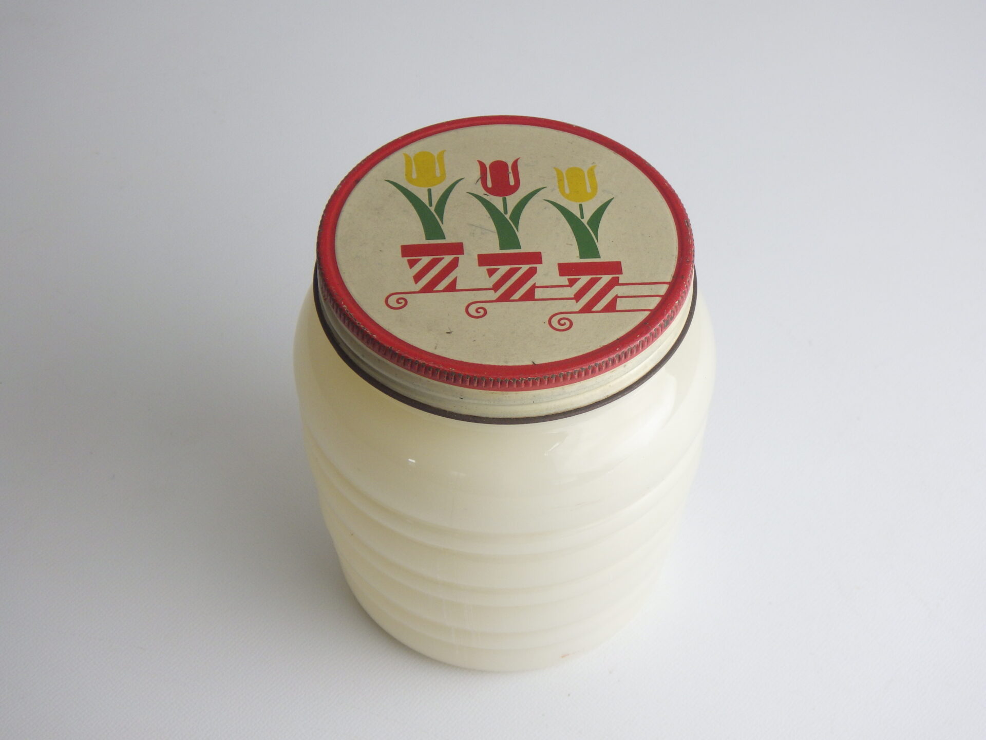 | 可愛いチューリップ柄の蓋のグリースジャーです。 元は油を入れるための容器です。 キッチンに置いておくだけでも可愛いですが、コーヒーやティーパックなどの保存容器としてお使いいただいても良さそうですね。 |