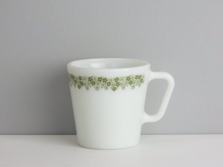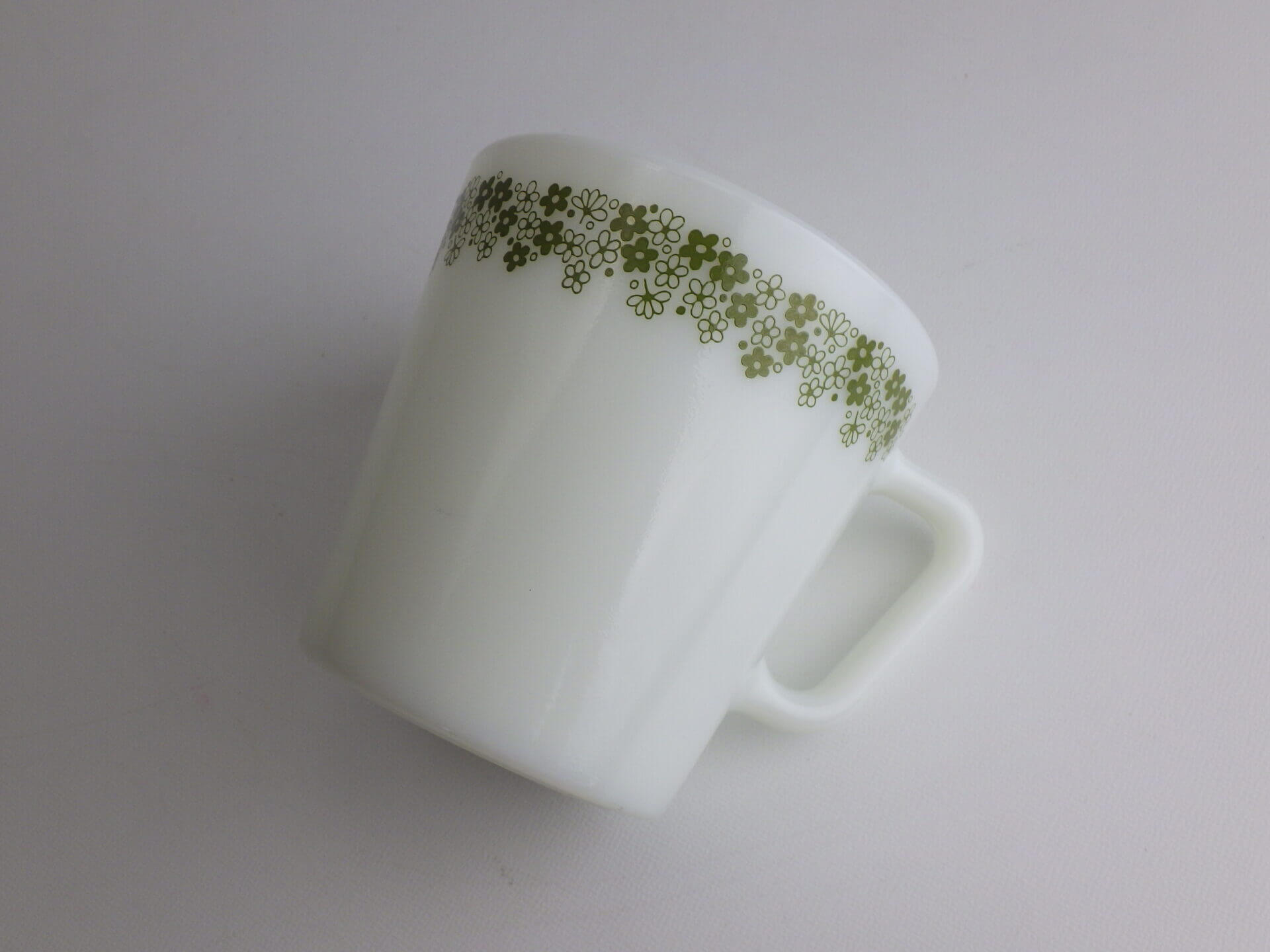 | 花畑の様に小花が散りばめられたプリントが可愛いクレイジーデイジーのマグ。 葉の描き方が少し違う「スプリングブロッサム」と合わせて様々なアイテムが製造されていました。 日本茶にも合いそうな落ち着いたデザインですね。 パイレックスの食器はとても丈夫なので、普段使いにおススメしています。 |