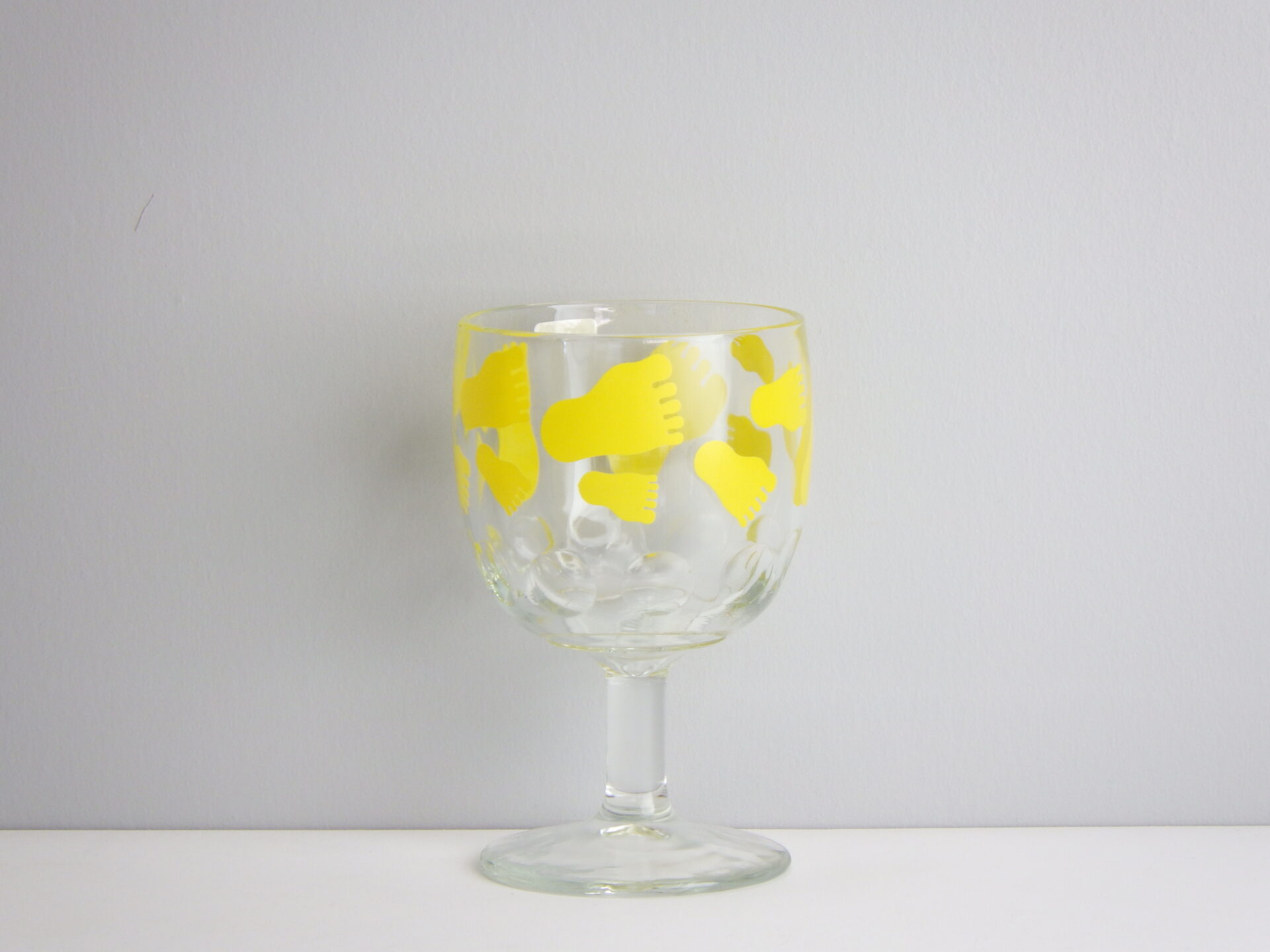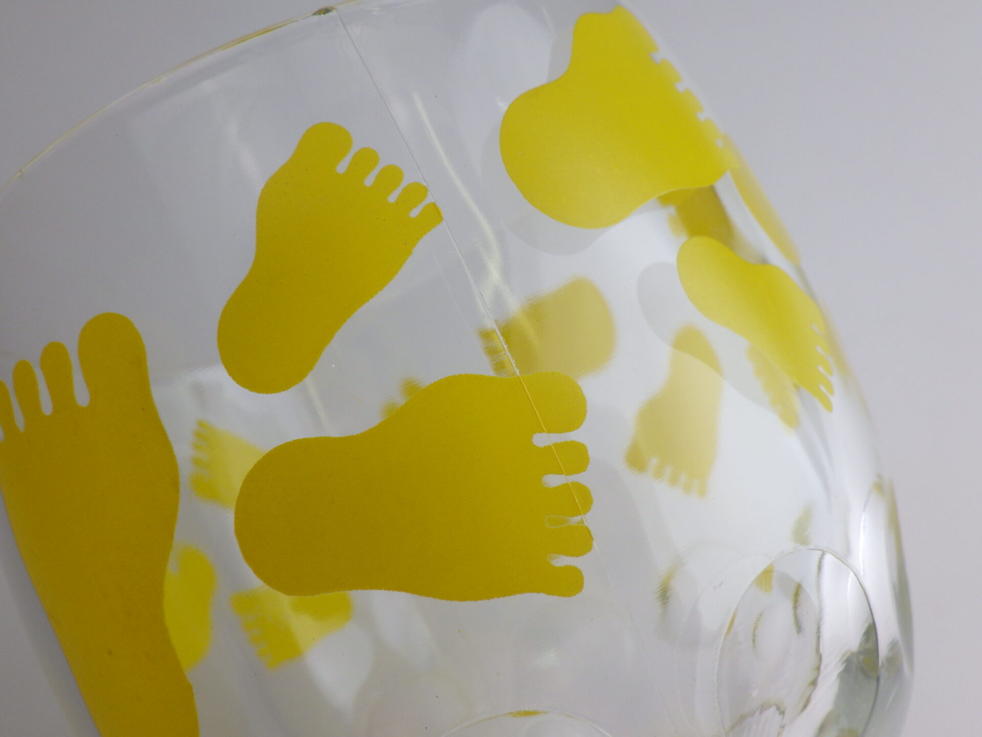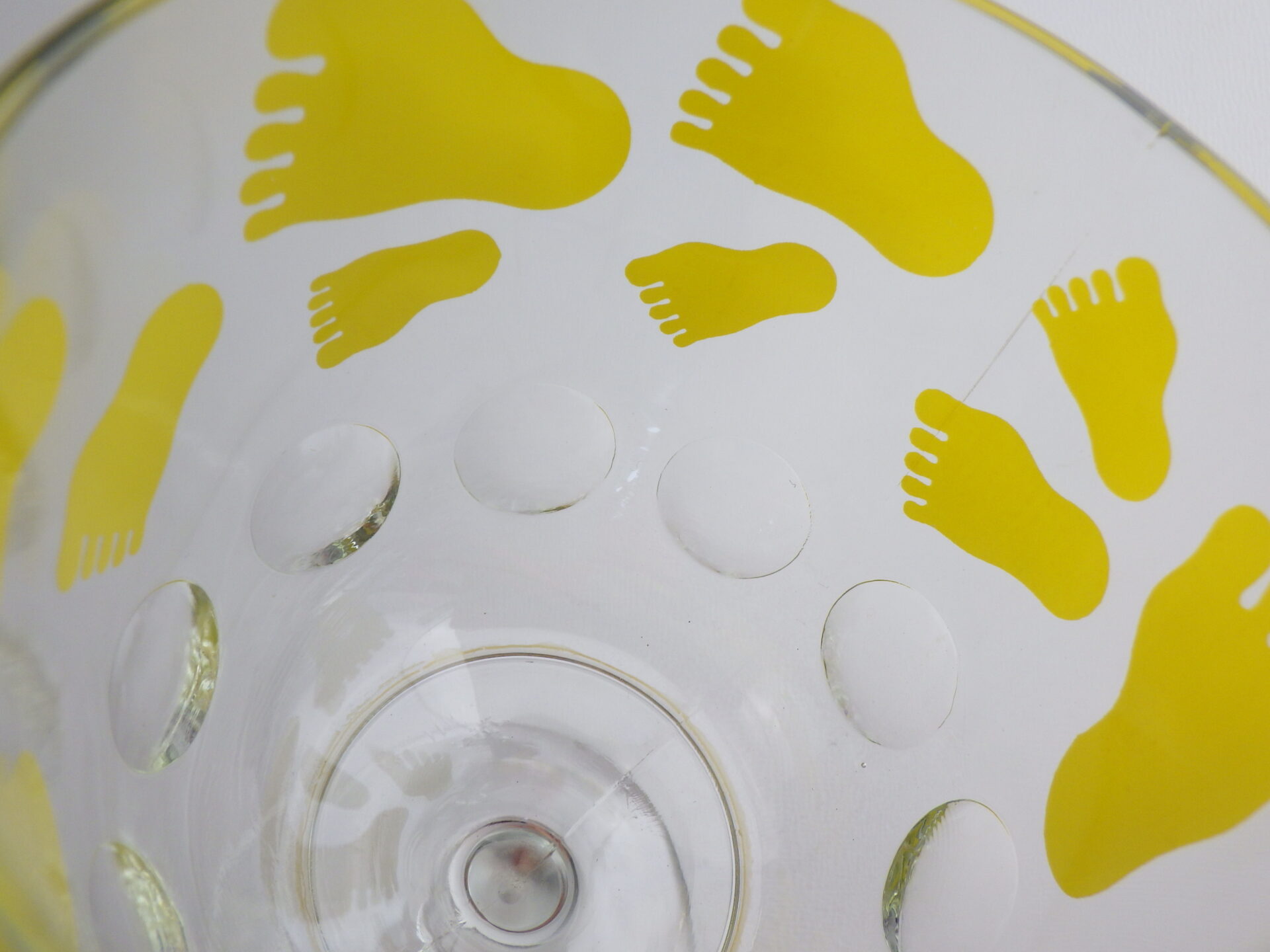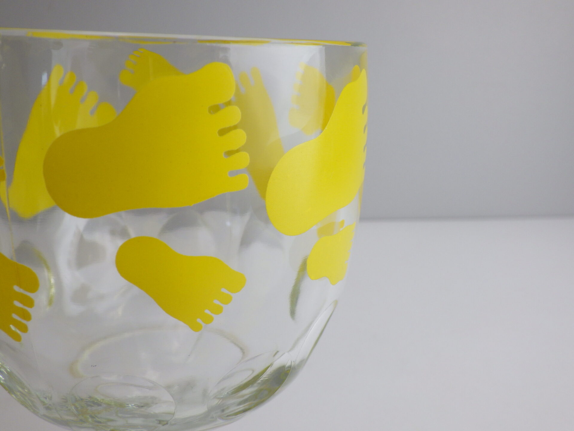| 脚付きのビンテージグラスです。 ペタペタと黄色い足跡がプリントされていて可愛く、使用していない時でも思わず飾っておきたくなるアイテムですね。 |