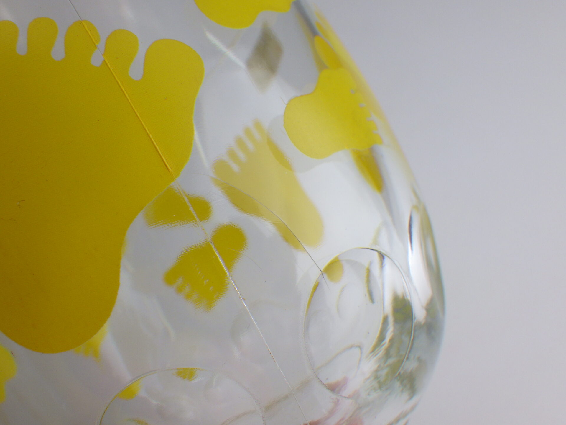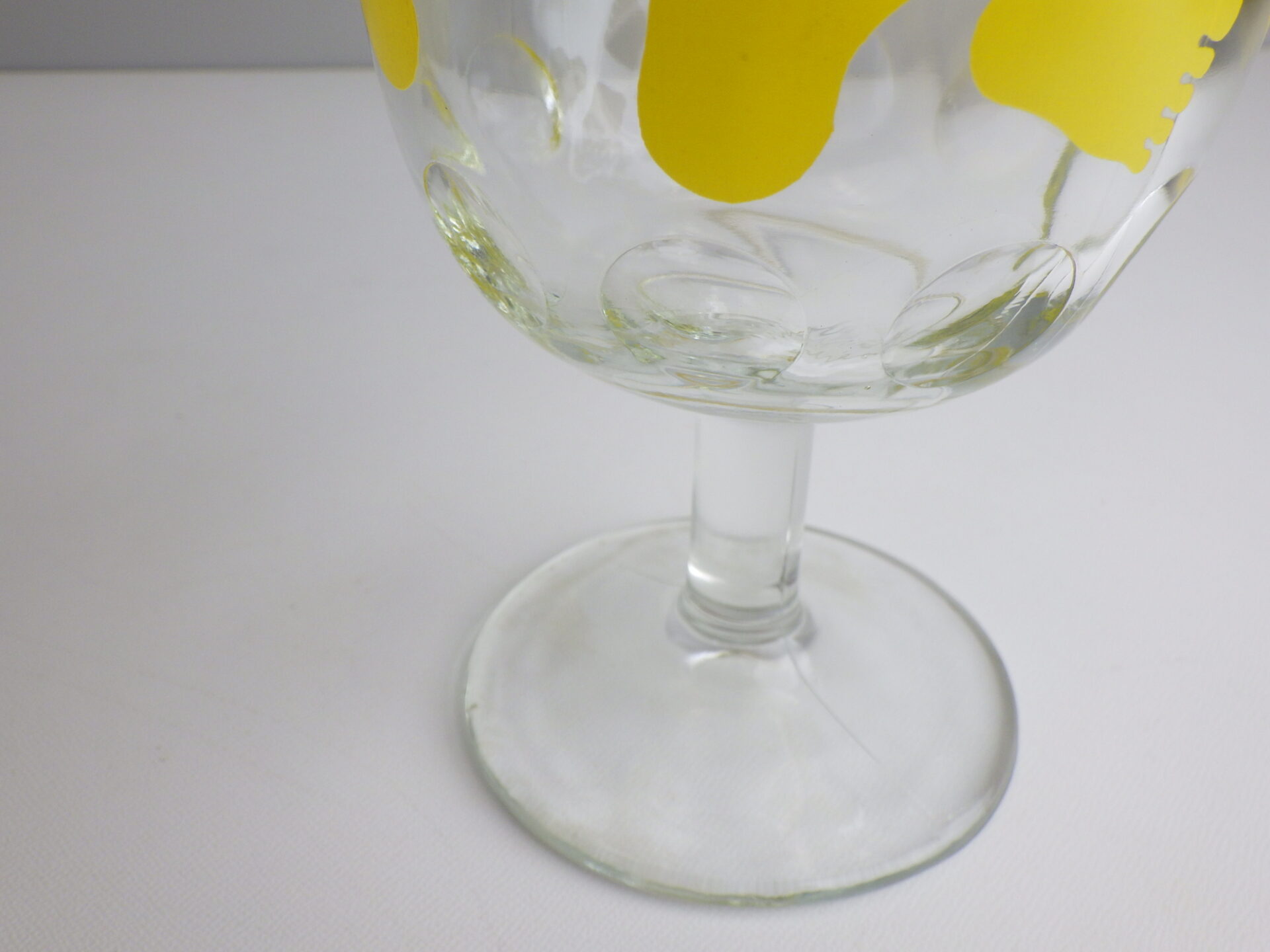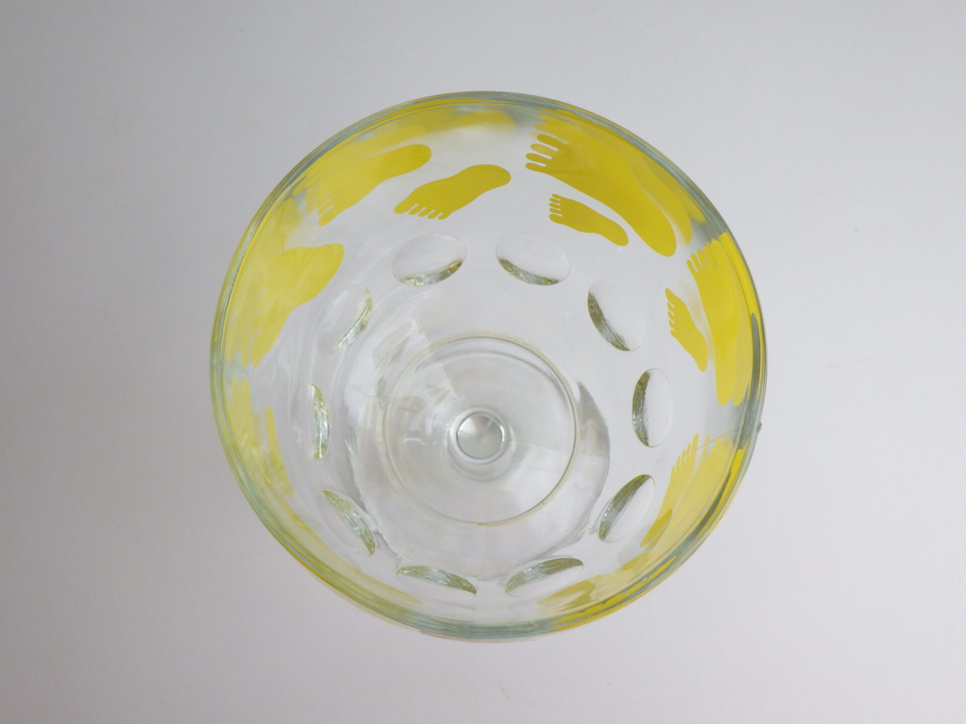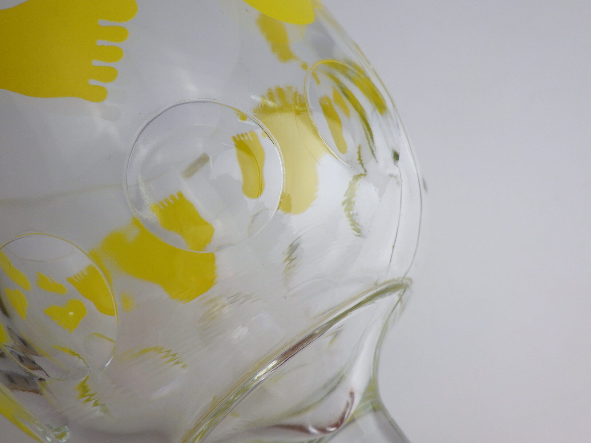 | 脚付きのビンテージグラスです。 ペタペタと黄色い足跡がプリントされていて可愛く、使用していない時でも思わず飾っておきたくなるアイテムですね。 |