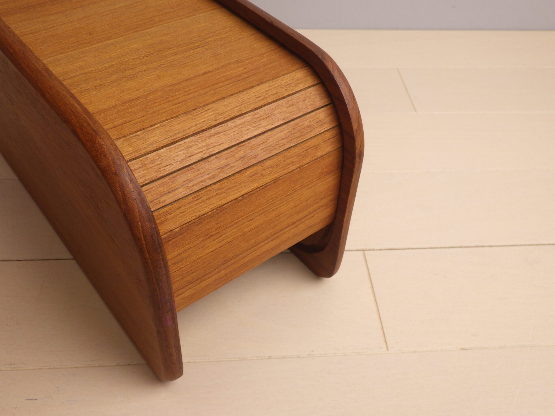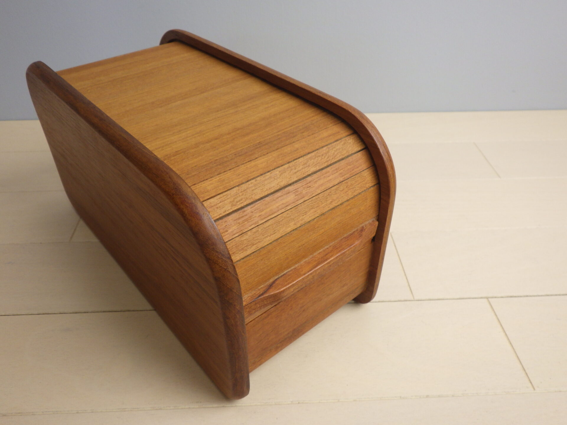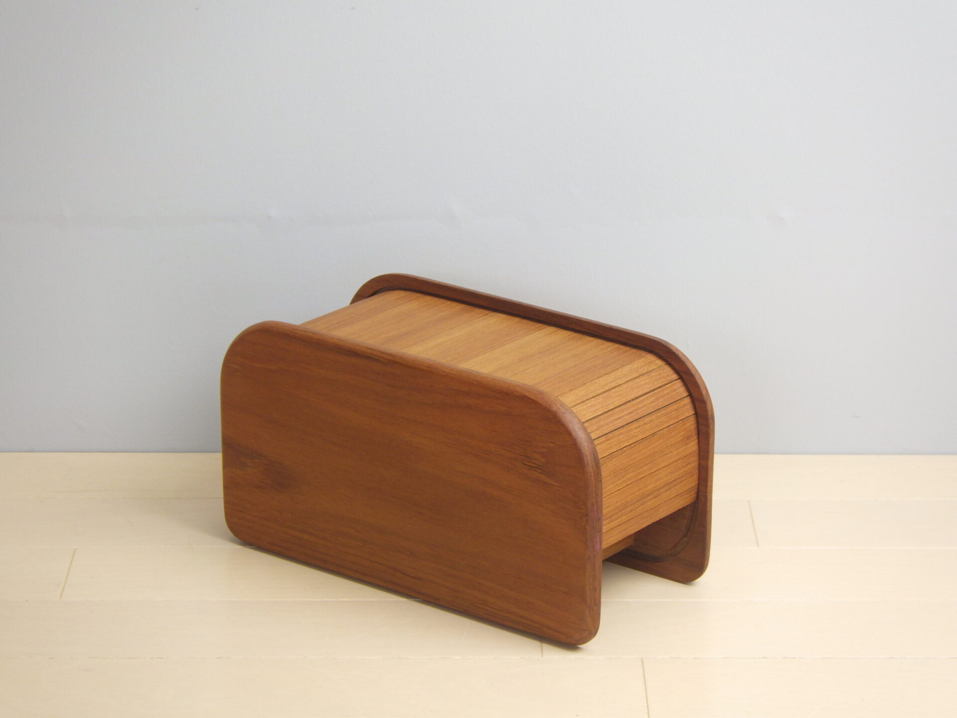 | Made in Thailandですが、デンマークの「KALMAR Designs」社製のロールトップボックスです。 蓋が蛇腹式にするすると背面に向かって巻き込まれていく仕組みです。 ちょっとした小物入れにしたり、文具などを入れてデスクに置いたりしても良さそう。 キャンプに持ち出して、カトラリーやペーパーナプキン、または調味料などを整理して入れておくのにも最適です。 |