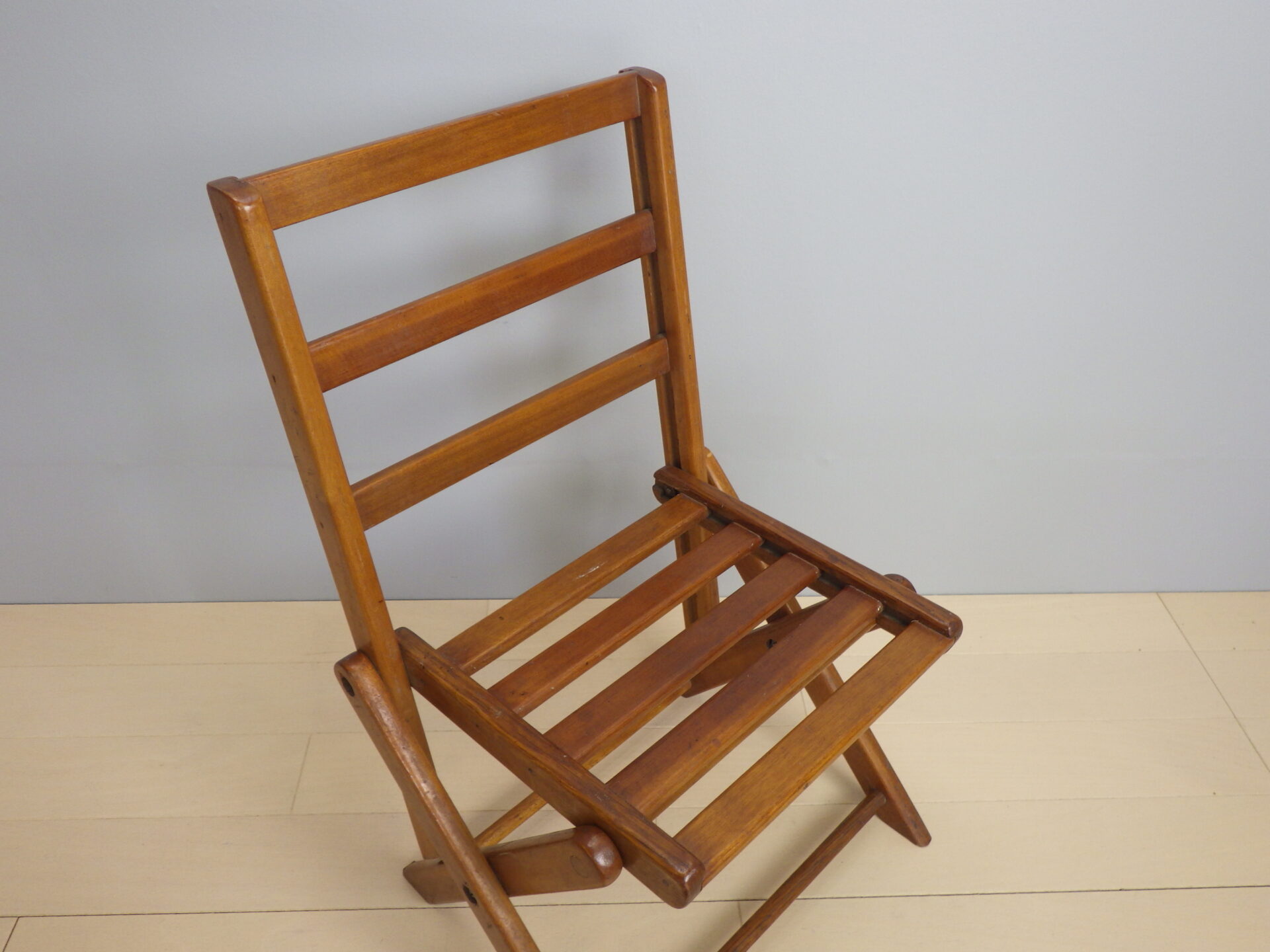 | アメリカで買い付けました、木製のフォールディングチェアです。 小ぶりなサイズなので、お子様用としてお使いいただくのも良さそうです。 また、キャンプに持ち出して焚き火用チェアとして使うのも良いかもしれません。 シンプルですが古い木の質感がとても良い雰囲気で、店舗什器やインテリアとしても活躍してくれそうですね。 |