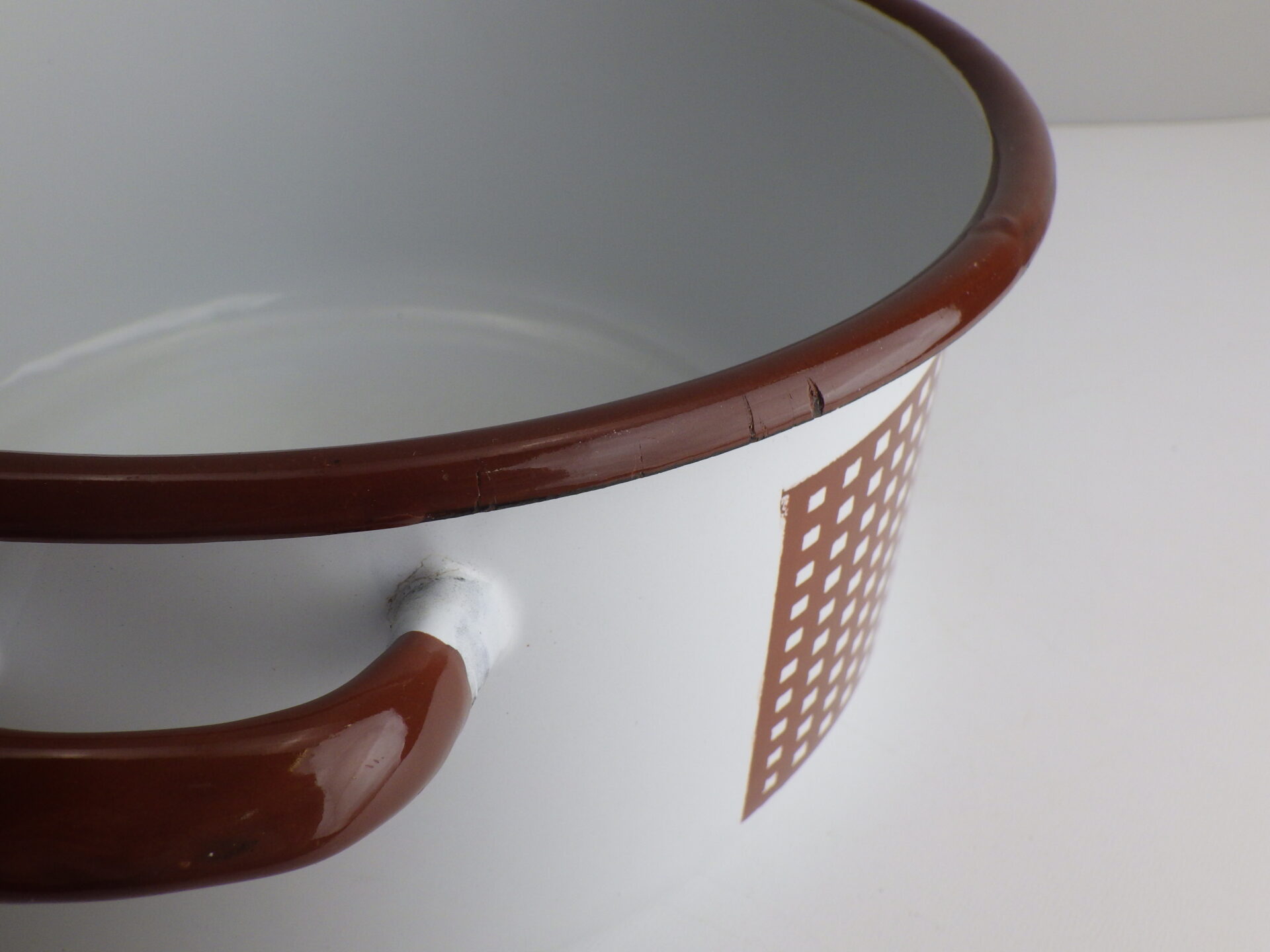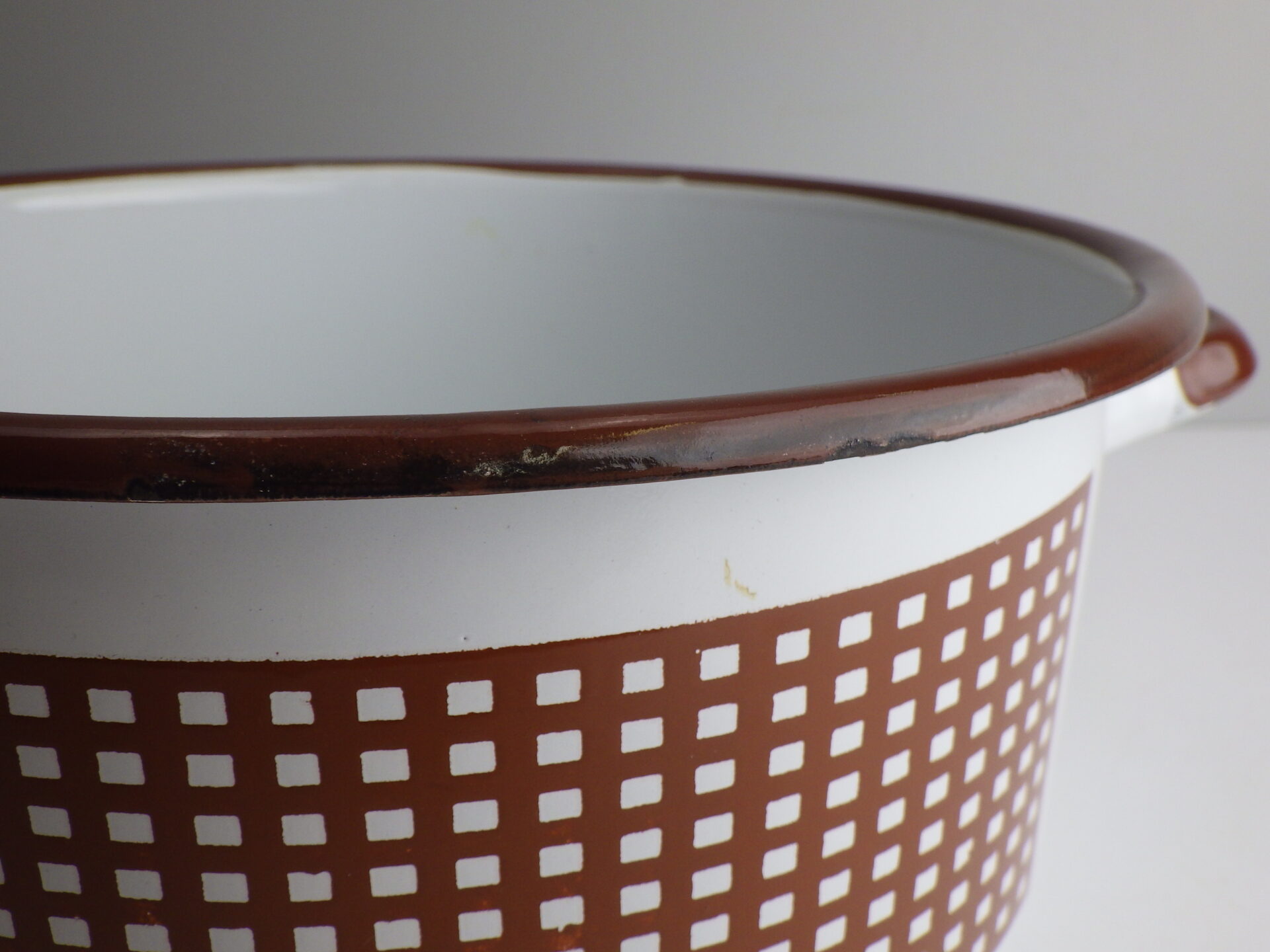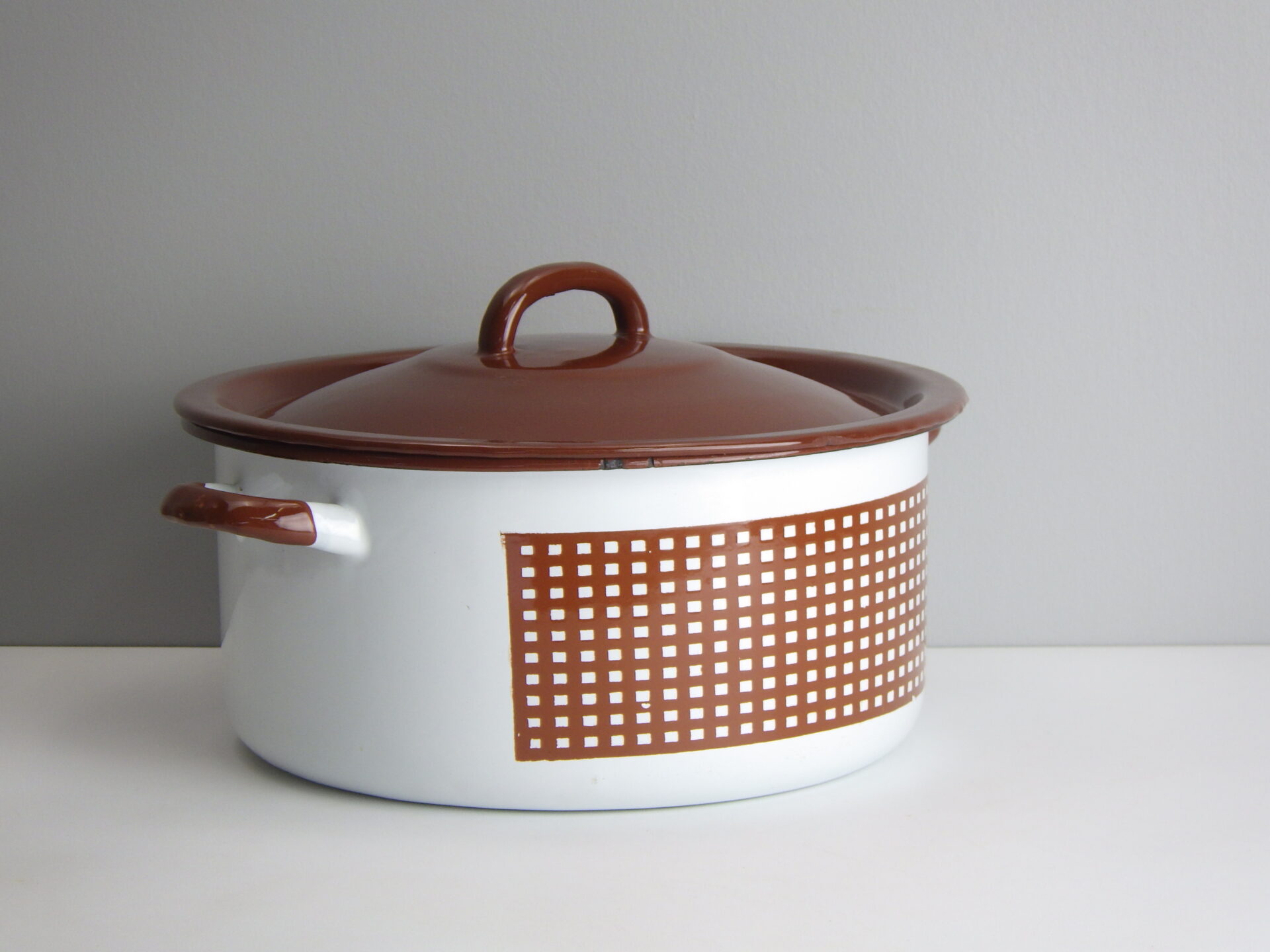 | アメリカで買い付けました、ビンテージのエナメル鍋です。 「MADE IN POLAND」の刻印があります。 ブラウンのチェックが可愛らしく、またおおぶりサイズなのでシチューやカレーなどの煮込み料理に最適です。 ご家族やグループでのキャンプに持ち出しても良いですね。 収納せずにコンロの上に置いておきたい可愛さです。 |