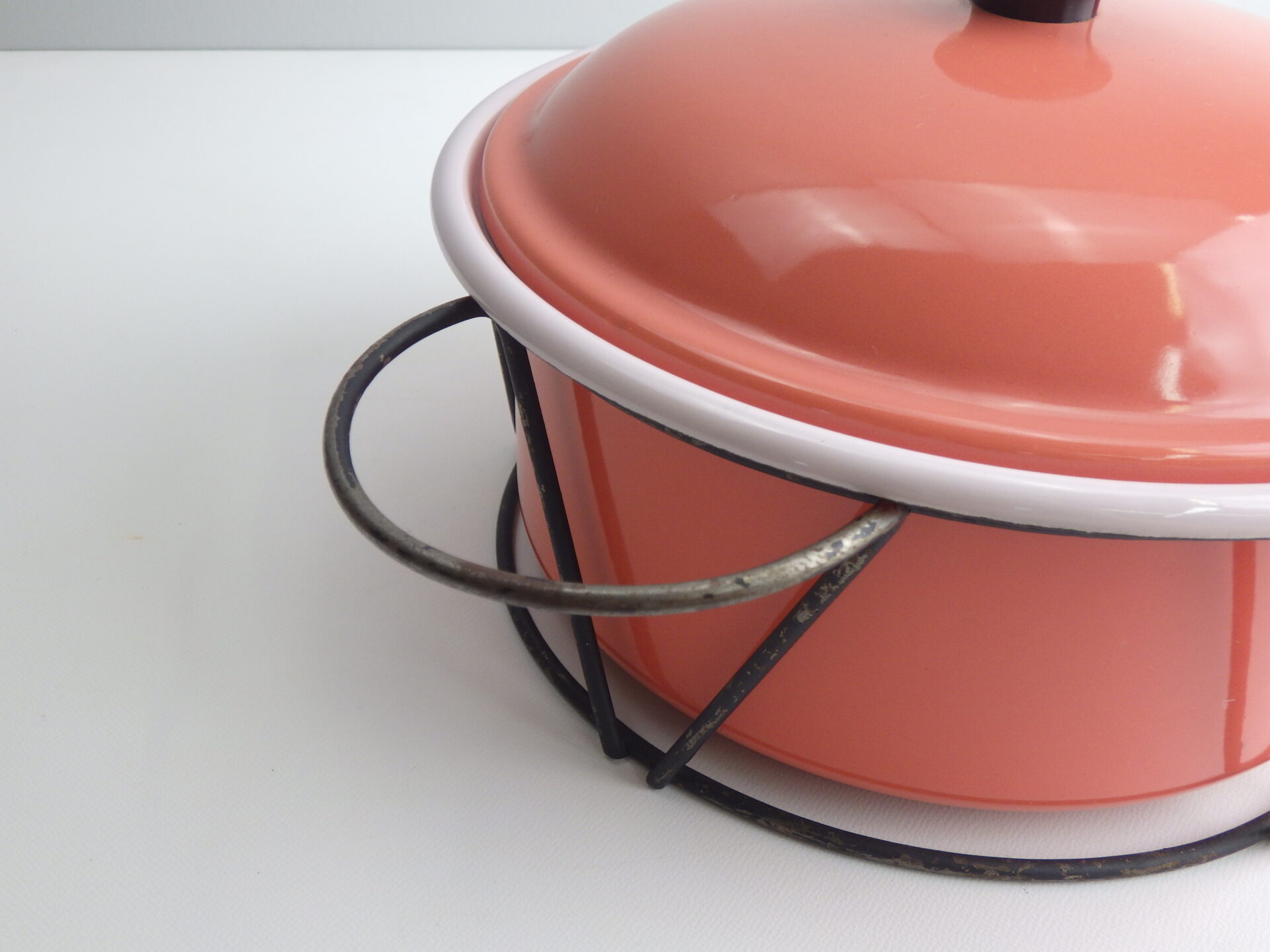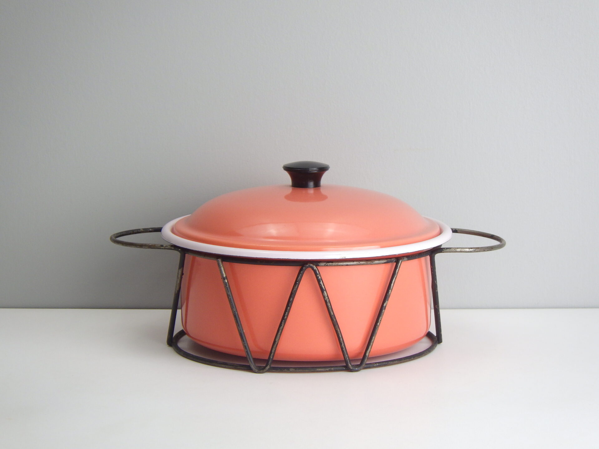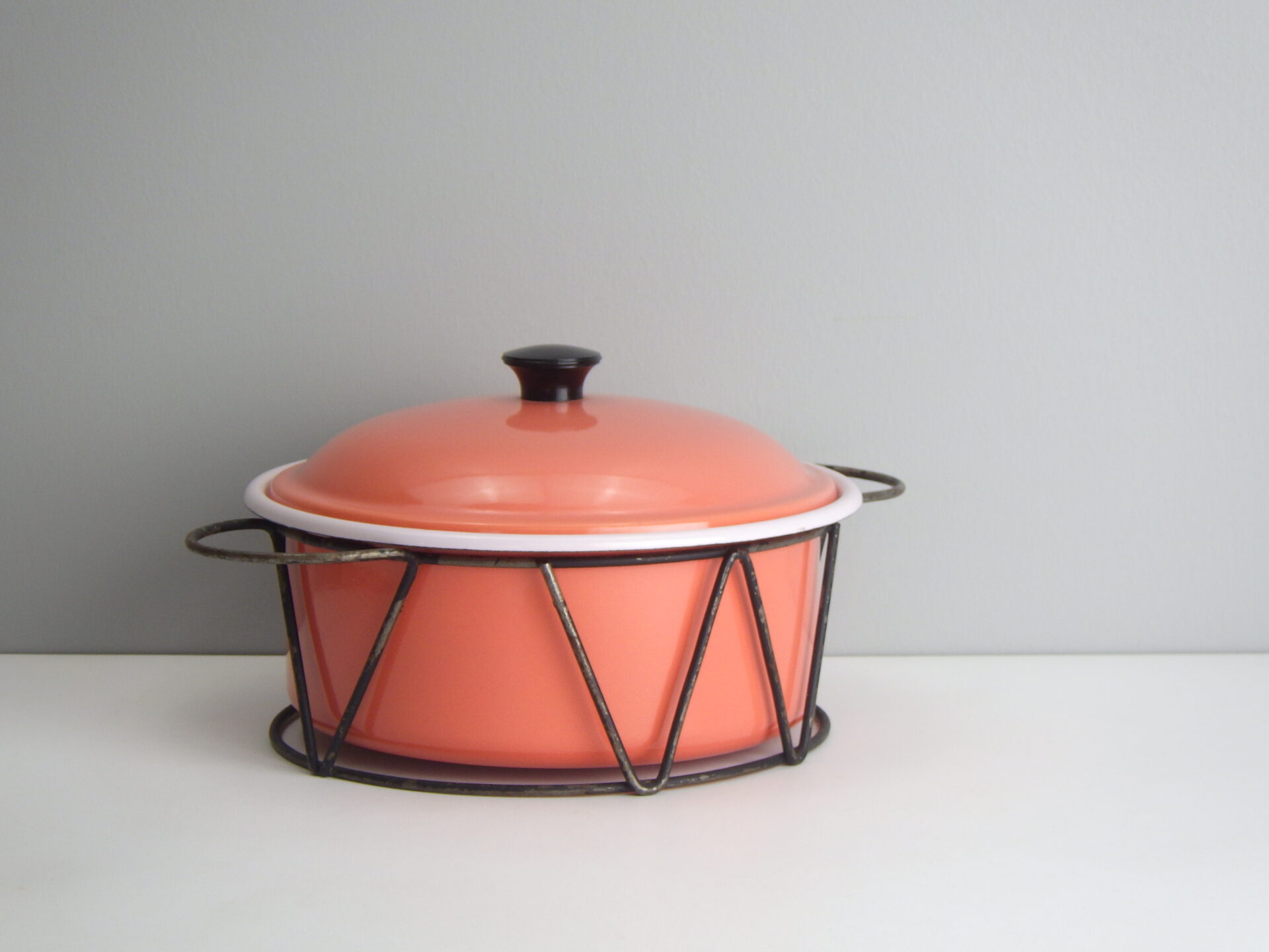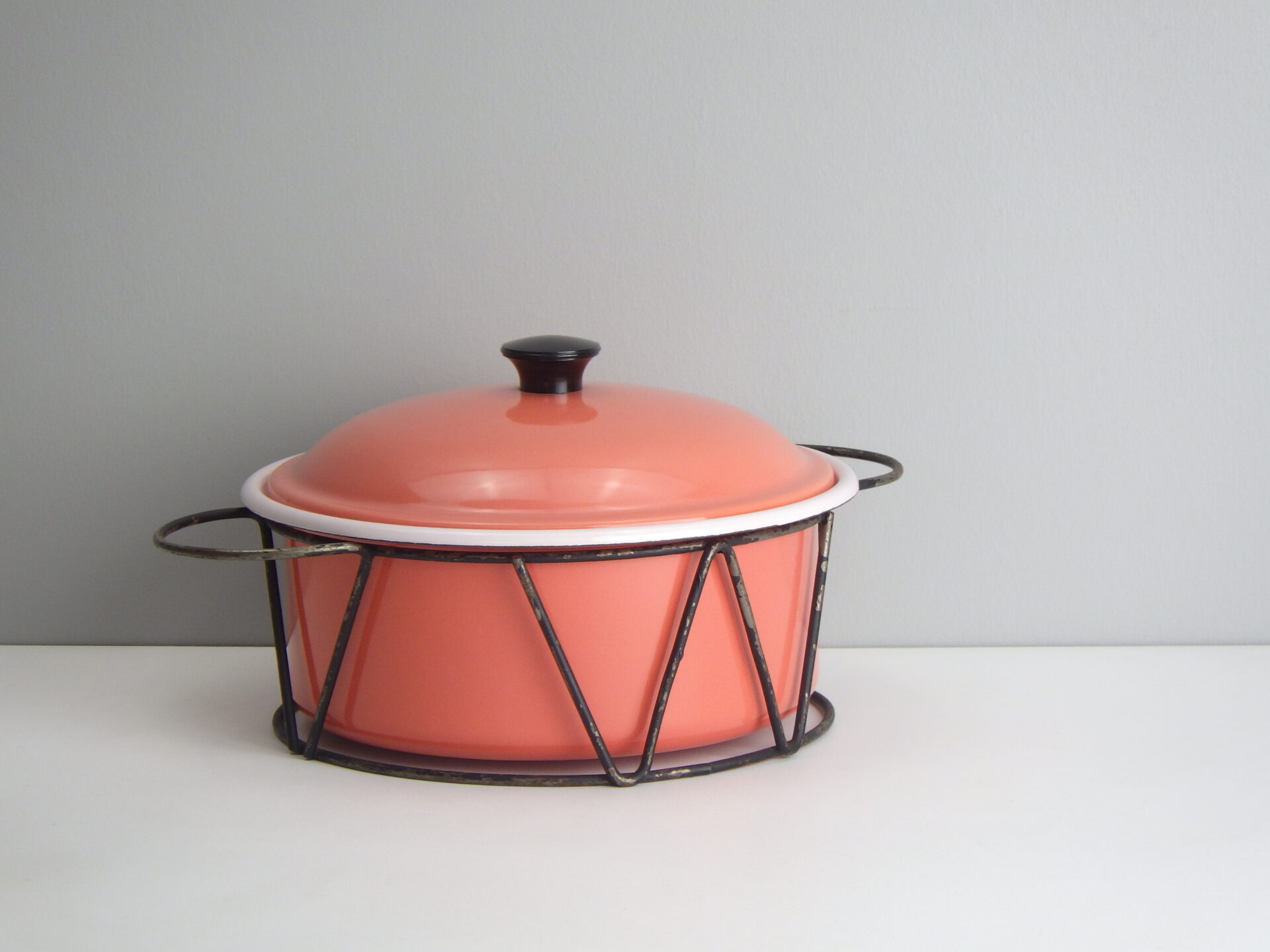 | アメリカで買い付けました、ビンテージのエナメル鍋です。 外側の鉄製の持ち手は取り外し可能ですので、調理後に取り付けてそのまま食卓に出すことが出来ます。 ビンテージらしいサーモンピンクが可愛らしく、キッチンの隅に置いてインテリア代わりに楽しむことも出来そうですね。 |