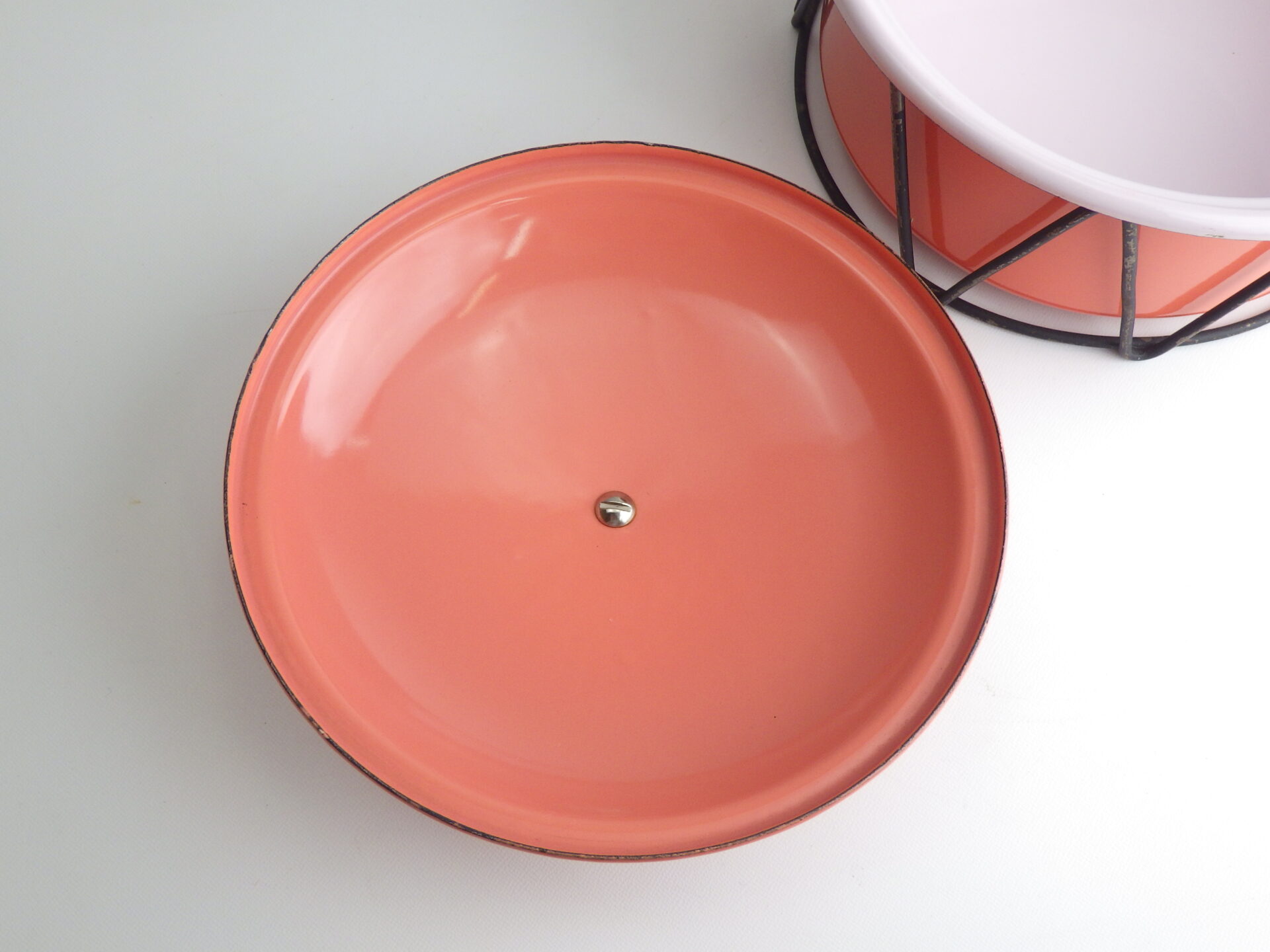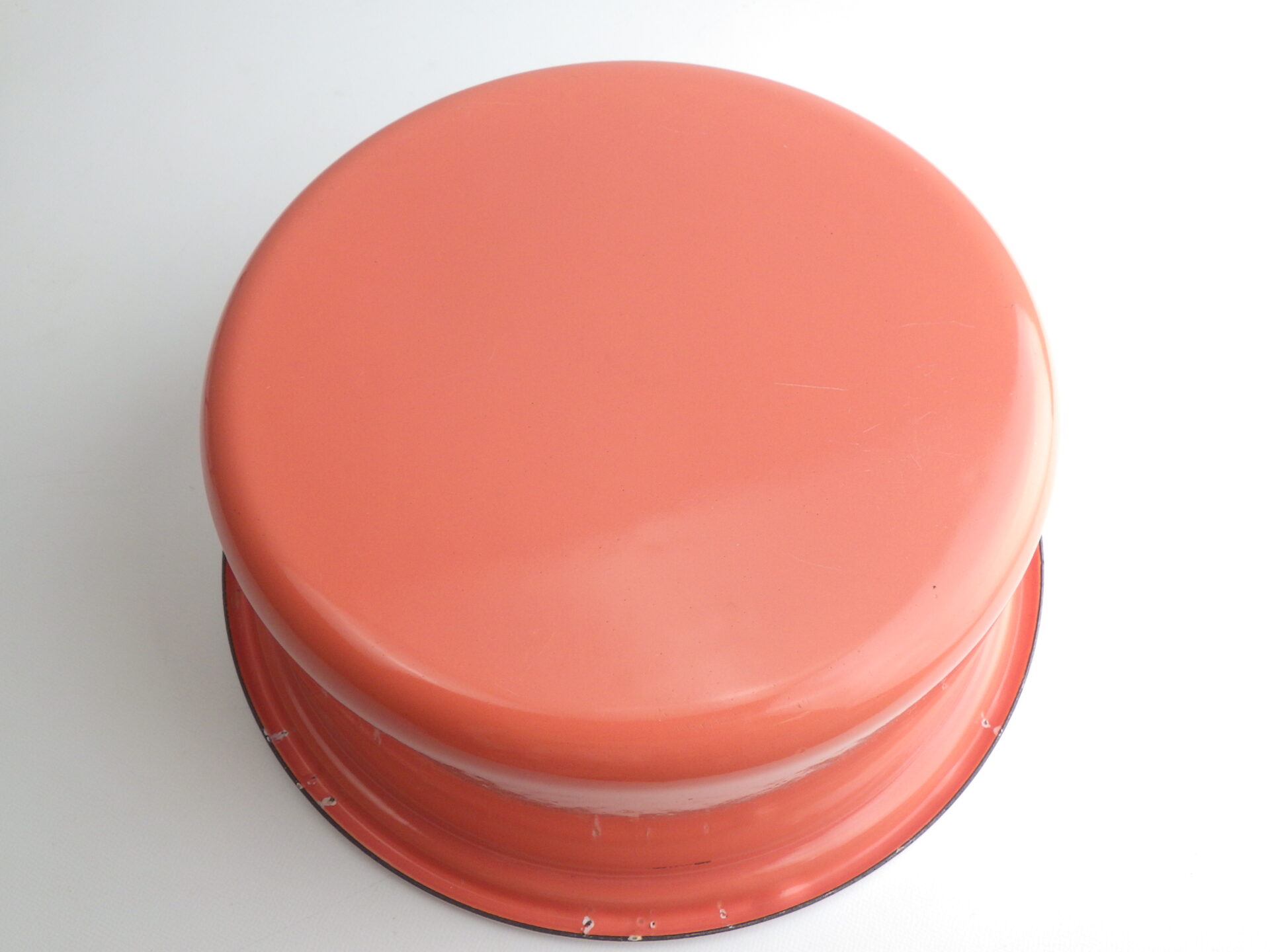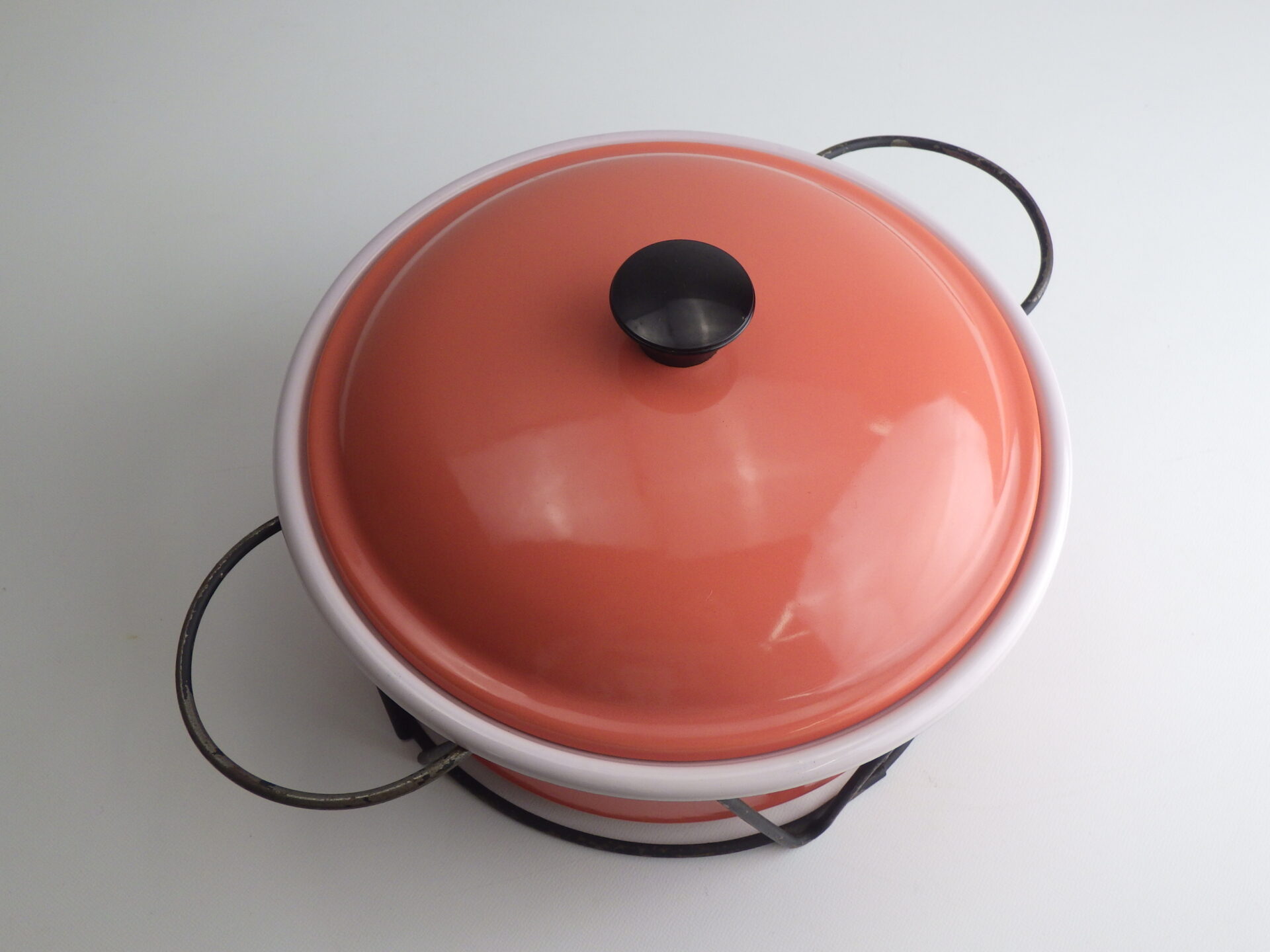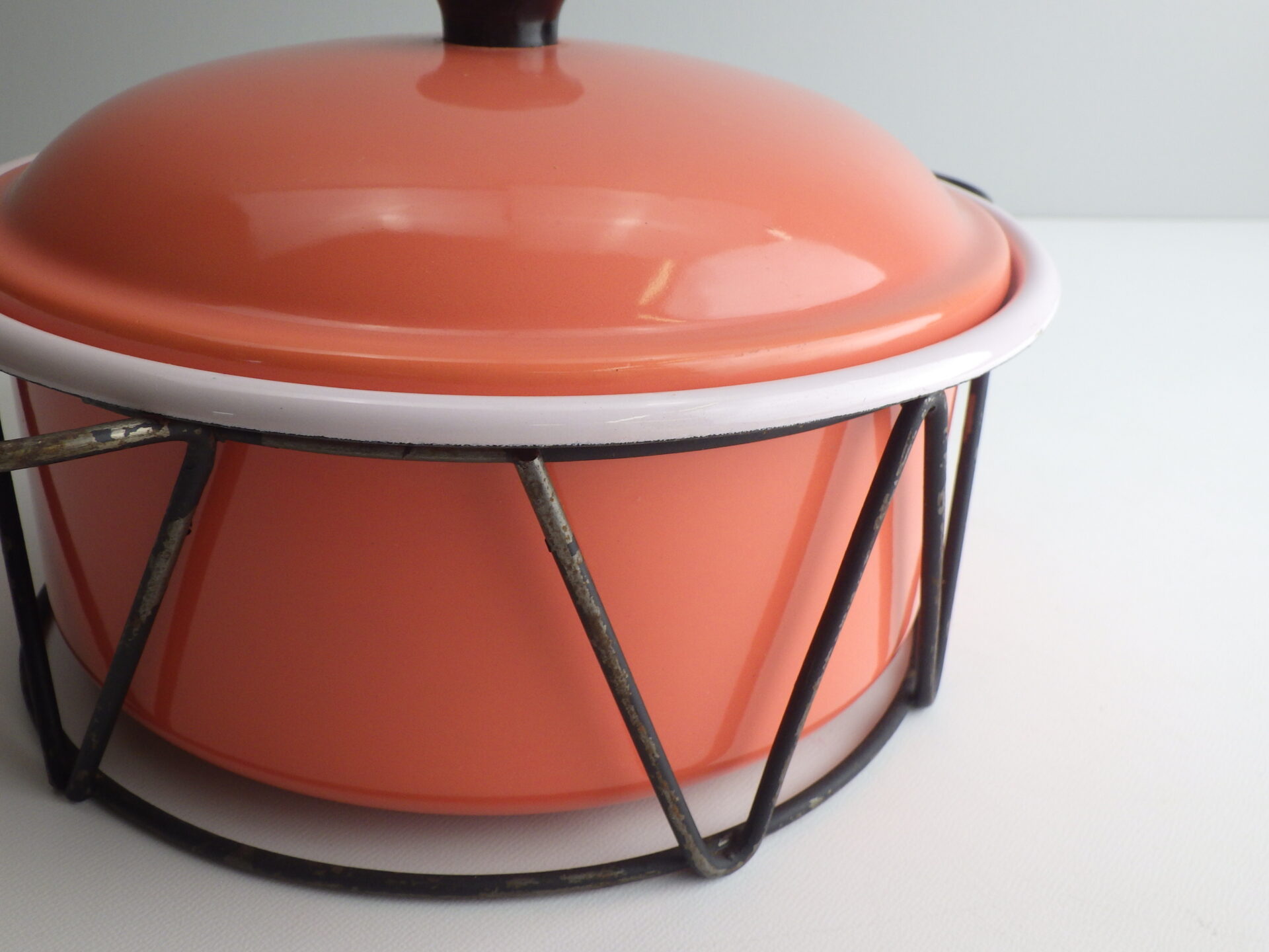 | アメリカで買い付けました、ビンテージのエナメル鍋です。 外側の鉄製の持ち手は取り外し可能ですので、調理後に取り付けてそのまま食卓に出すことが出来ます。 ビンテージらしいサーモンピンクが可愛らしく、キッチンの隅に置いてインテリア代わりに楽しむことも出来そうですね。 |