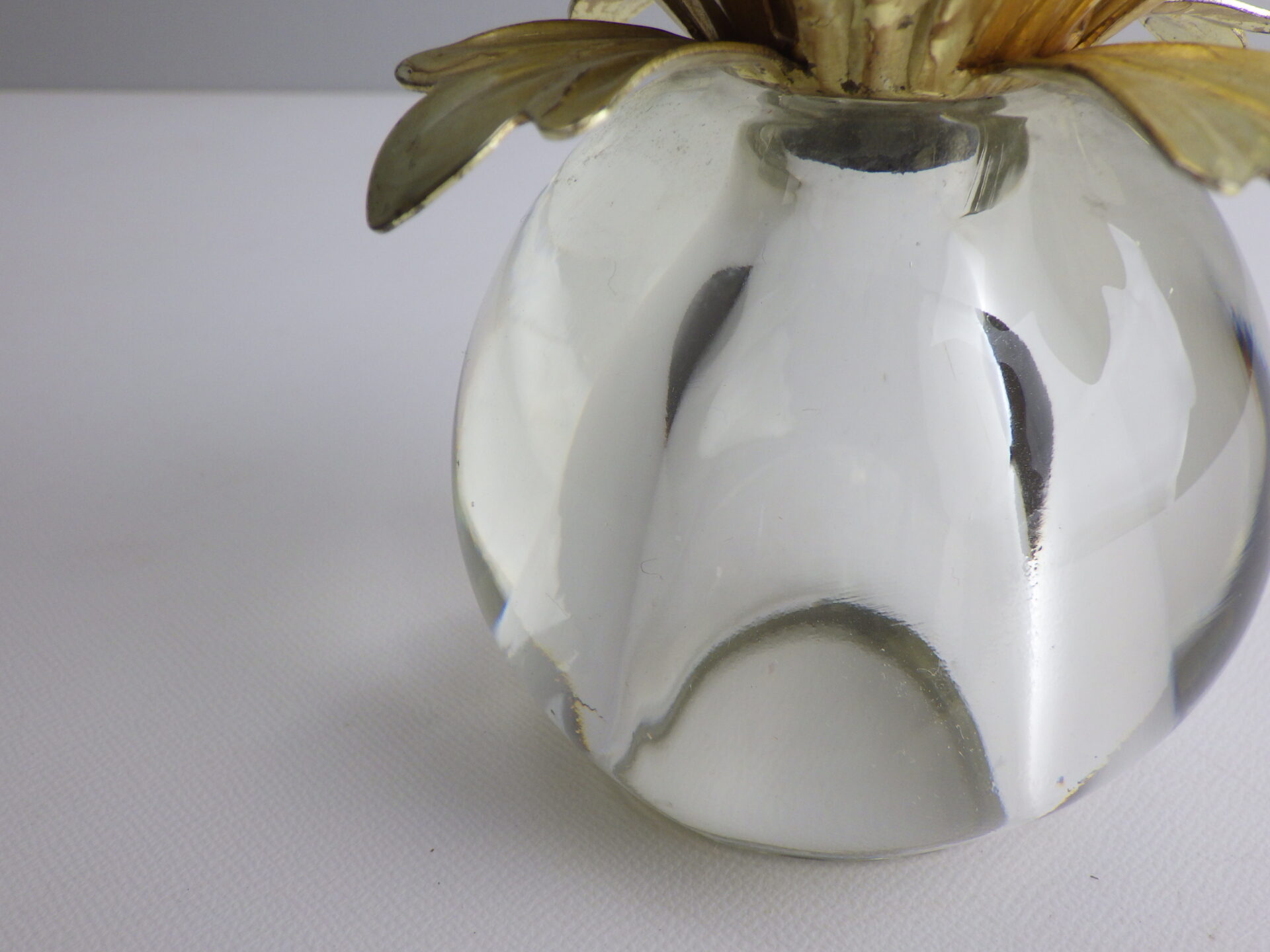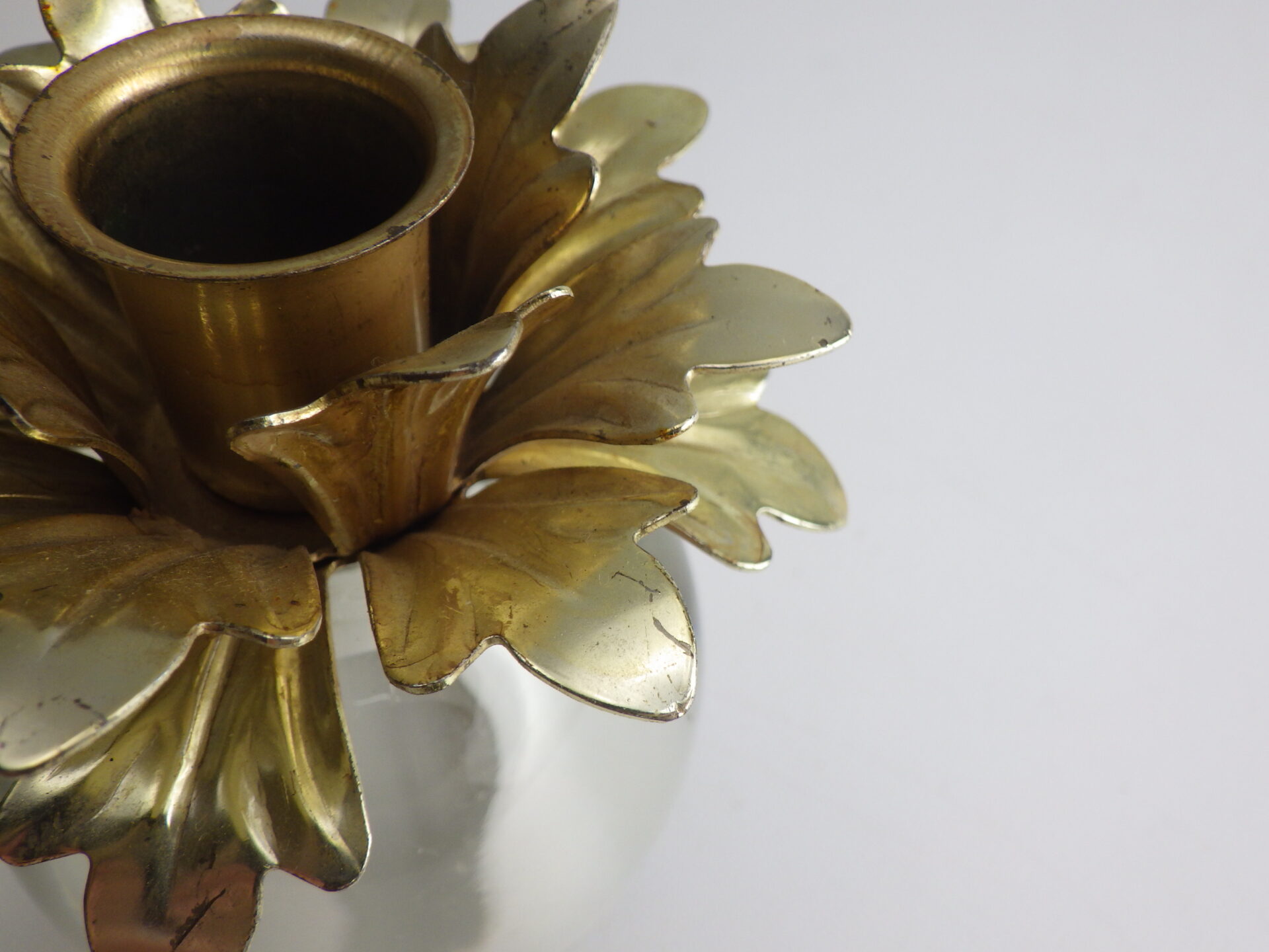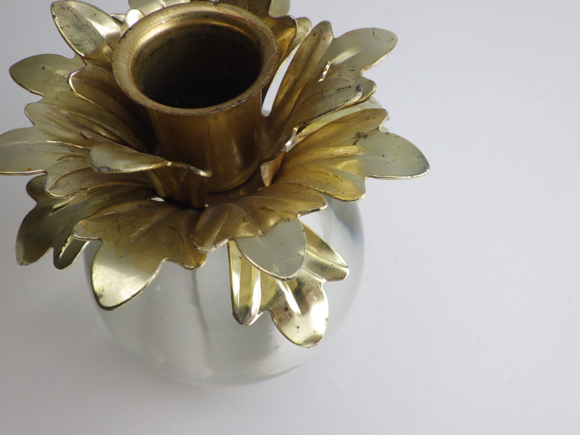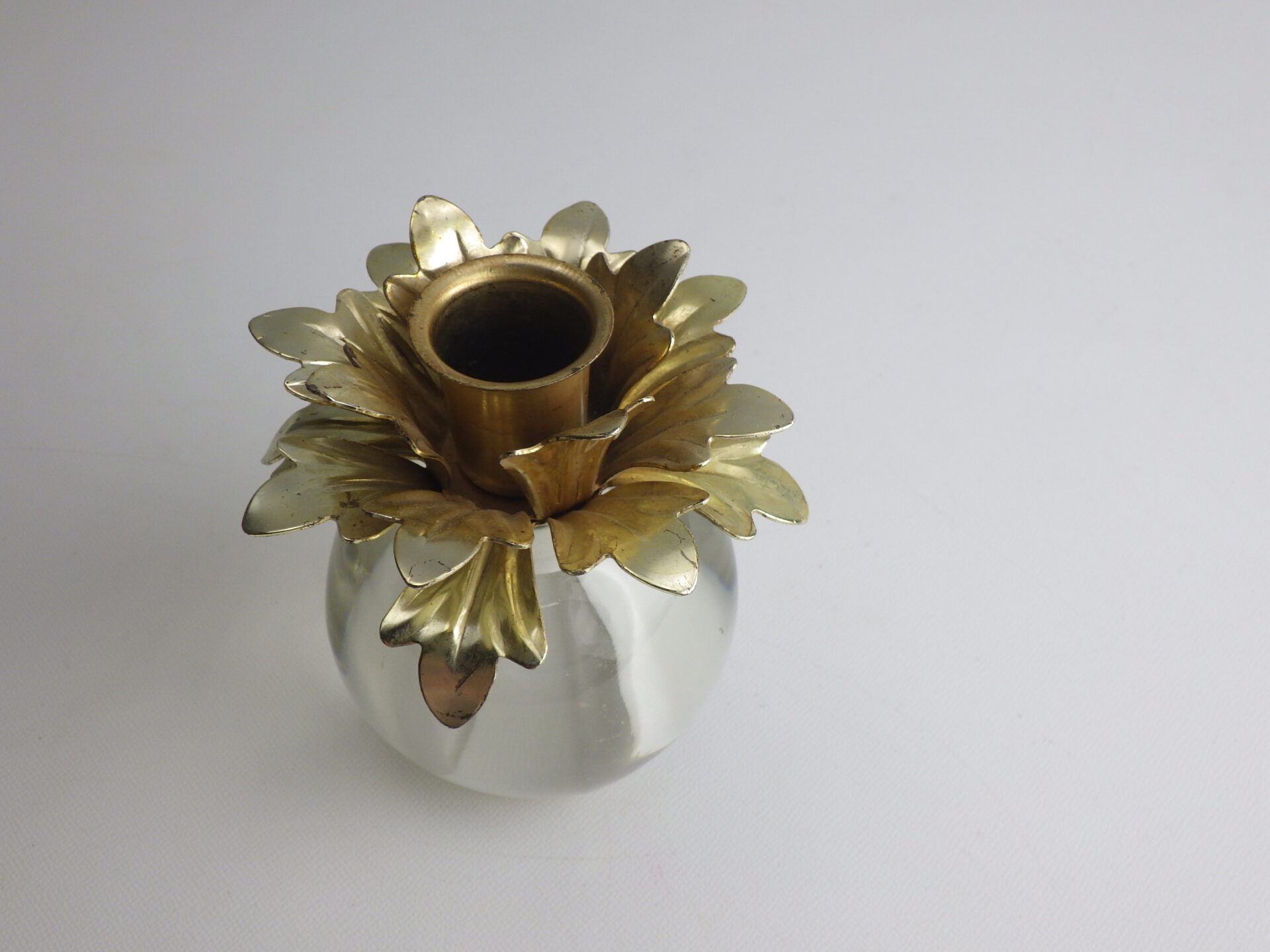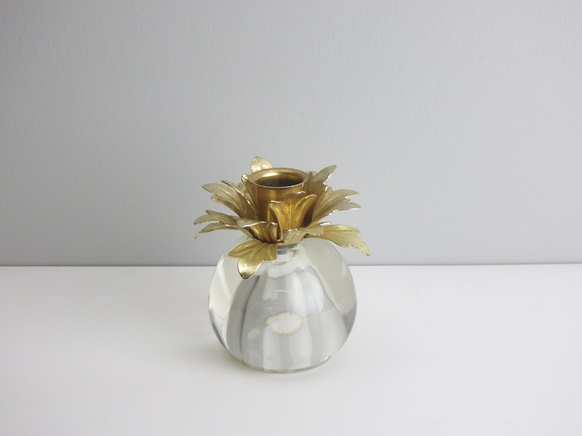 | アメリカで買い付けました。 ガラス製のビンテージキャンドルホルダーです。 鉄製の上部が360度に広がる葉のようなデザインになっており、モダンな印象です。 キャンドルを挿していない状態でも絵になるため、インテリアのアクセントとしてもおすすめしています。 |