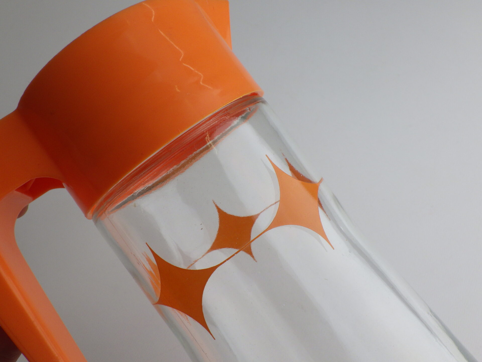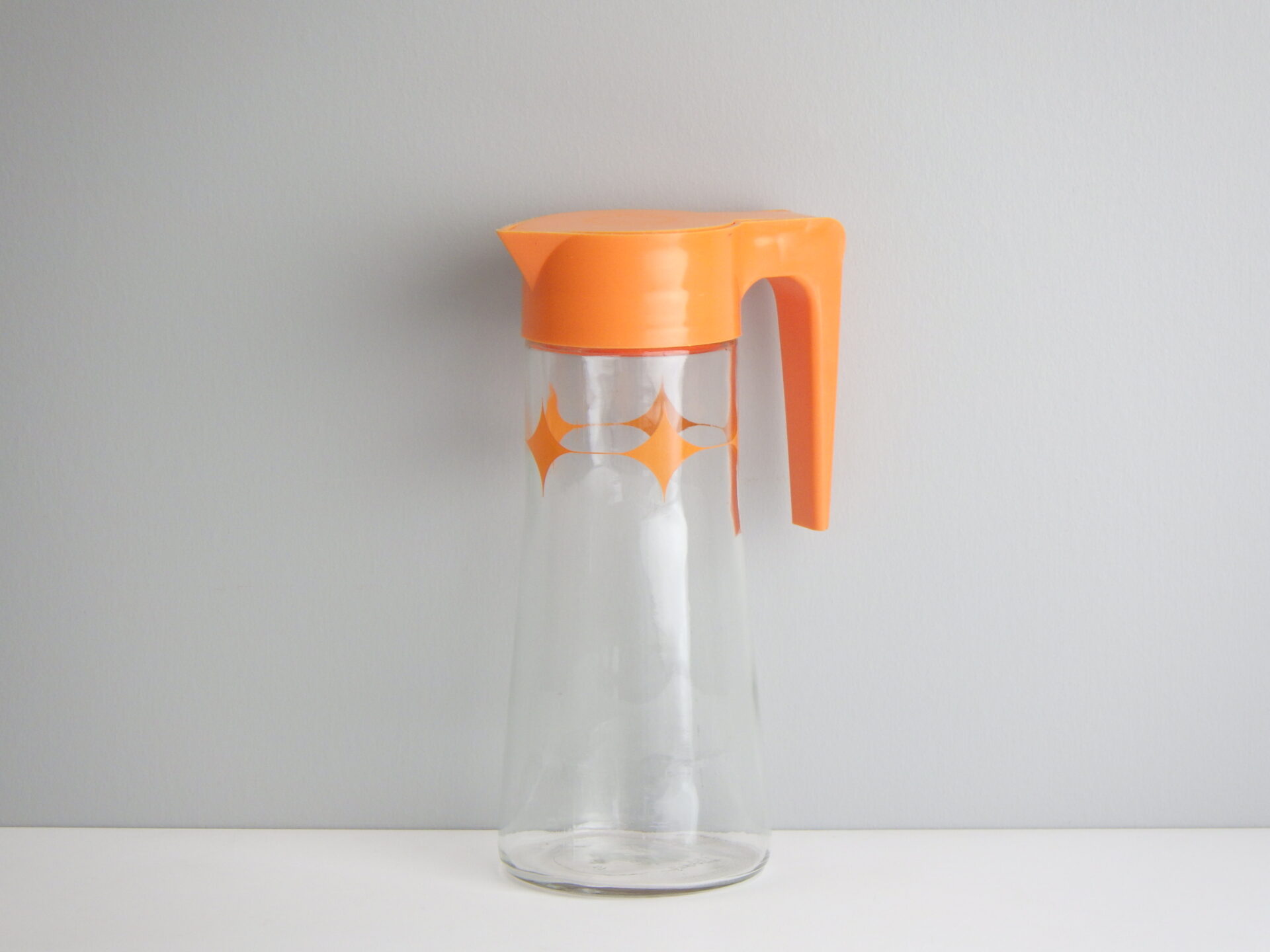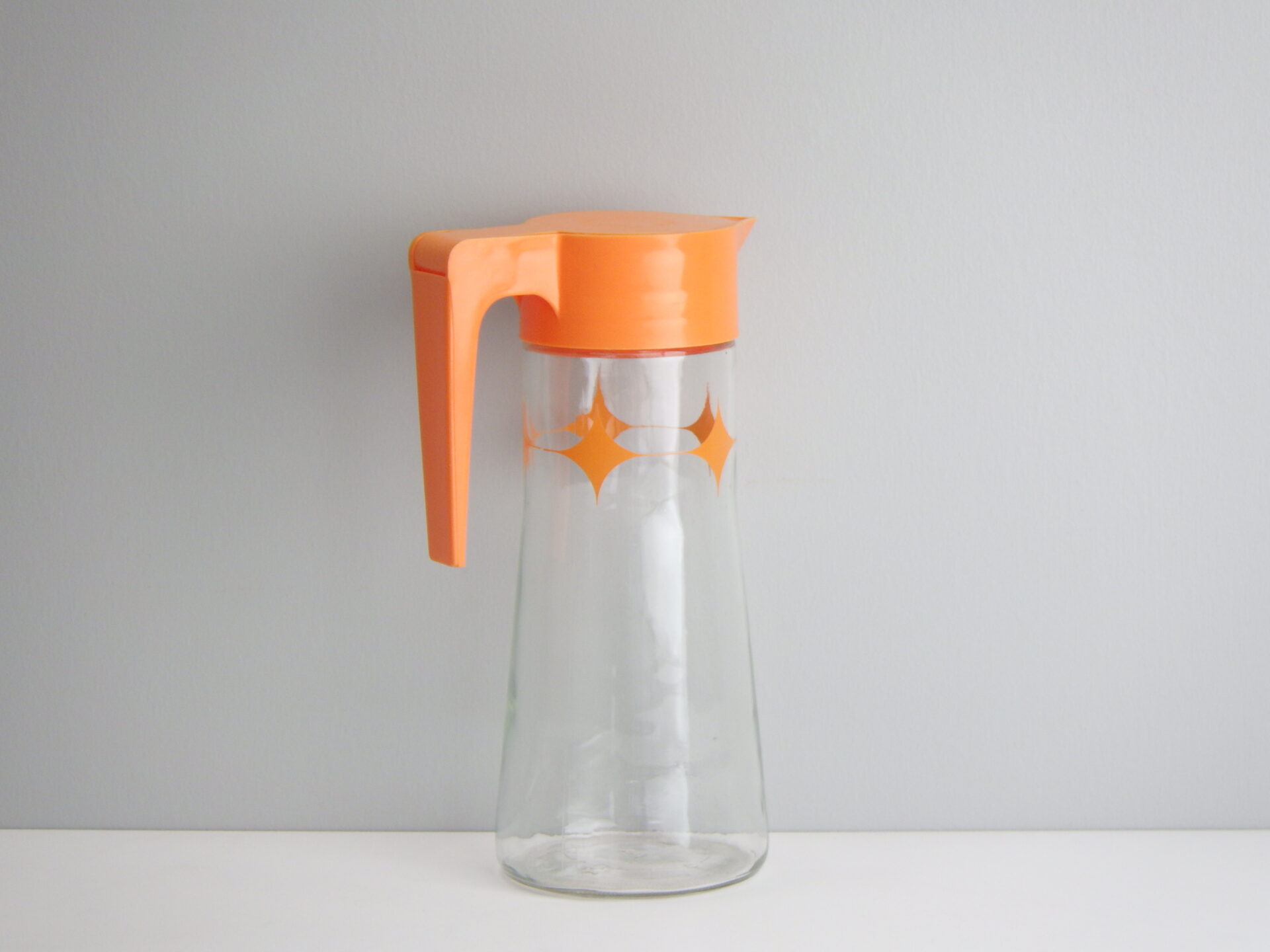 | ファイヤーキングでお馴染み、アンカーホッキング社製のジュースピッチャーです。 麦茶やレモネードなどいれて、食卓に置くだけでアクセントになりますね。 冷蔵庫にもいれやすいサイズ感です。 容量はおよそ700mlです。 |