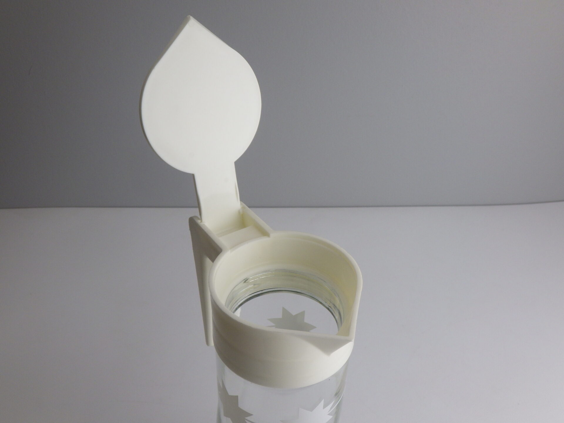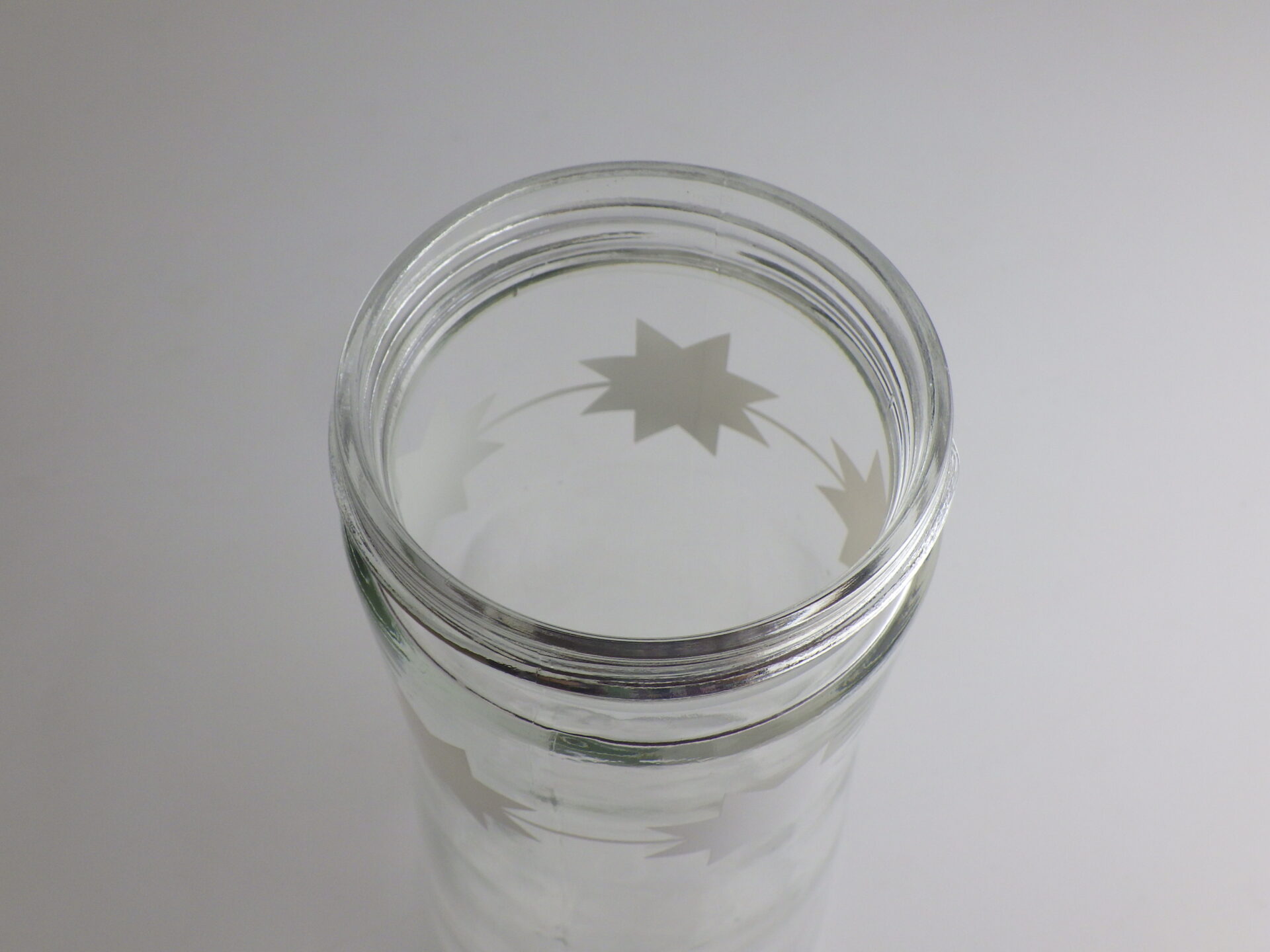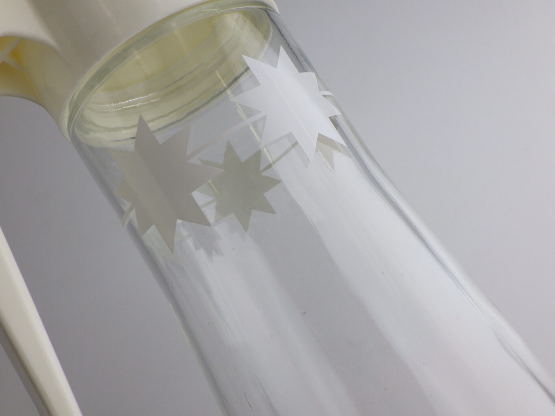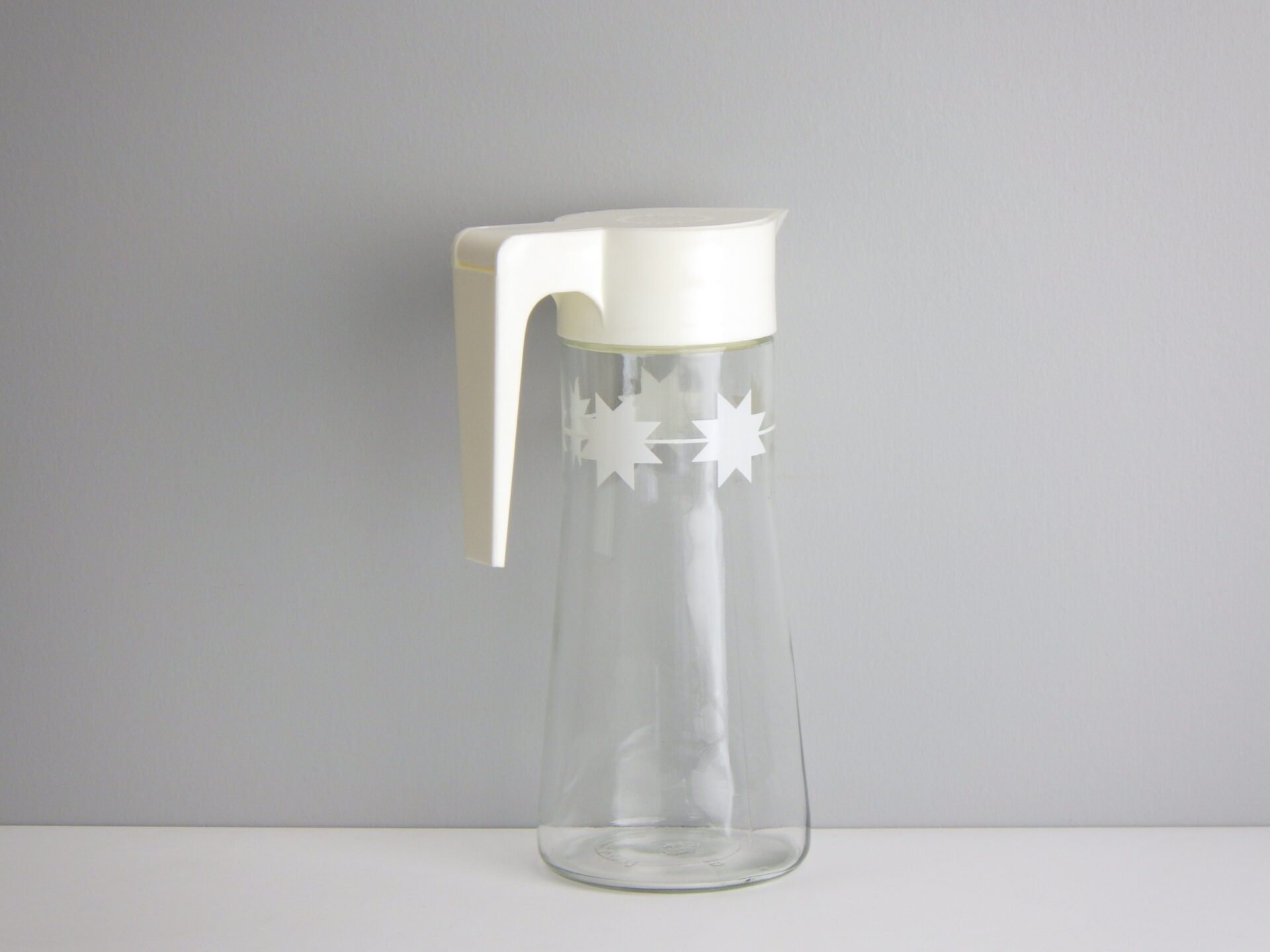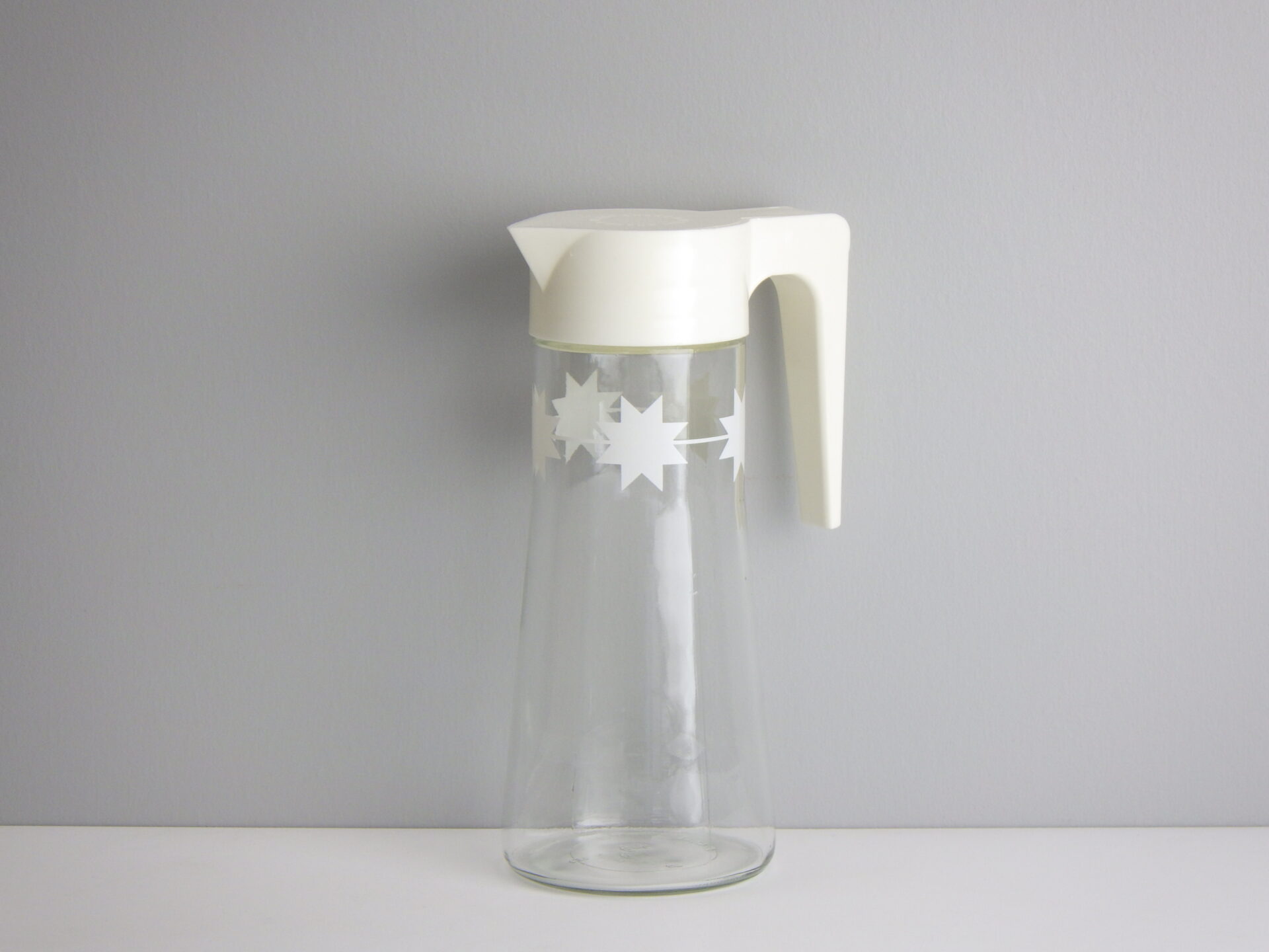 | ファイヤーキングでお馴染み、アンカーホッキング社製のジュースピッチャーです。 麦茶やレモネードなどいれて、食卓に置くだけでアクセントになりますね。 冷蔵庫にもいれやすいサイズ感です。 容量はおよそ700mlです。 |