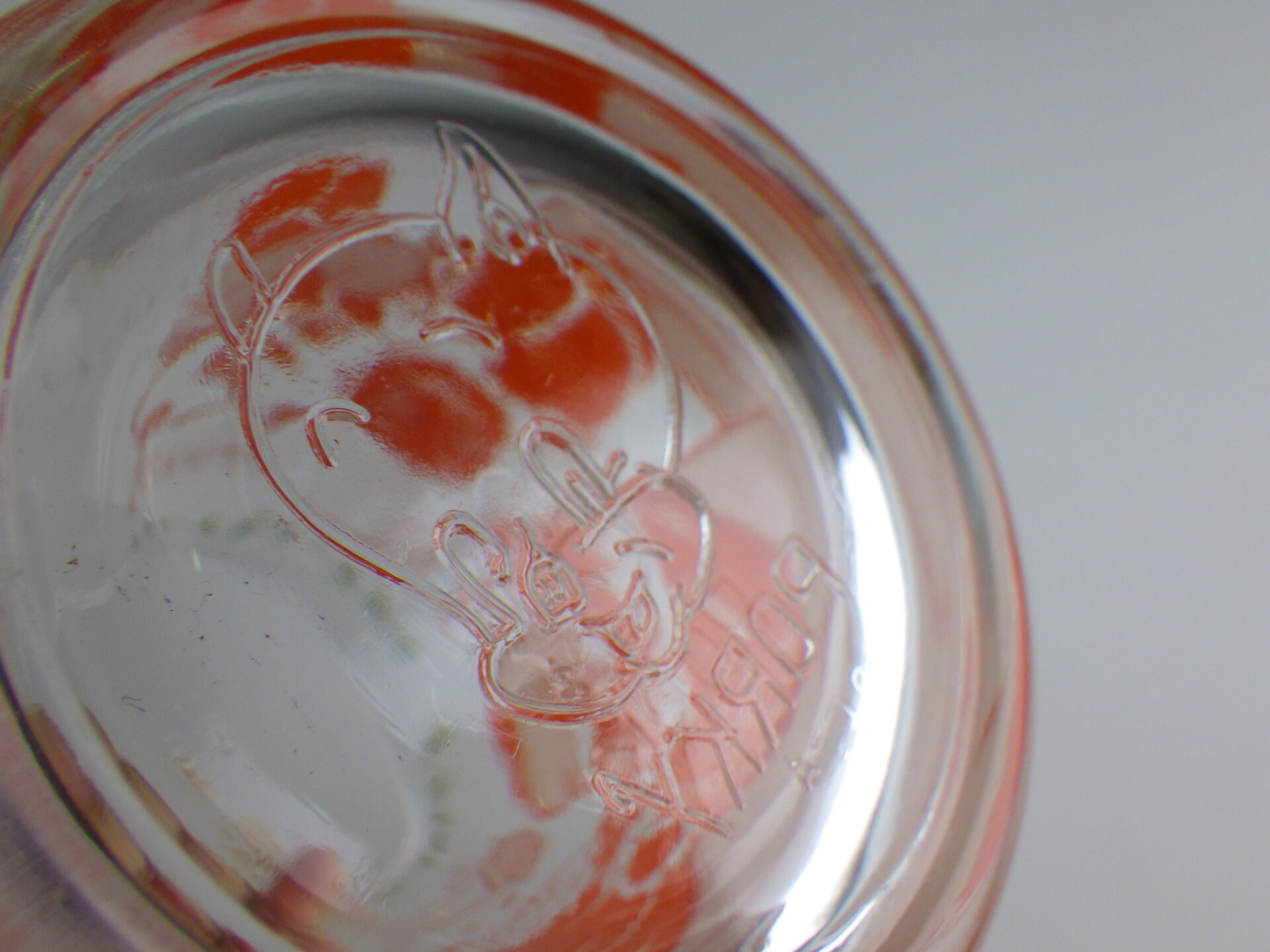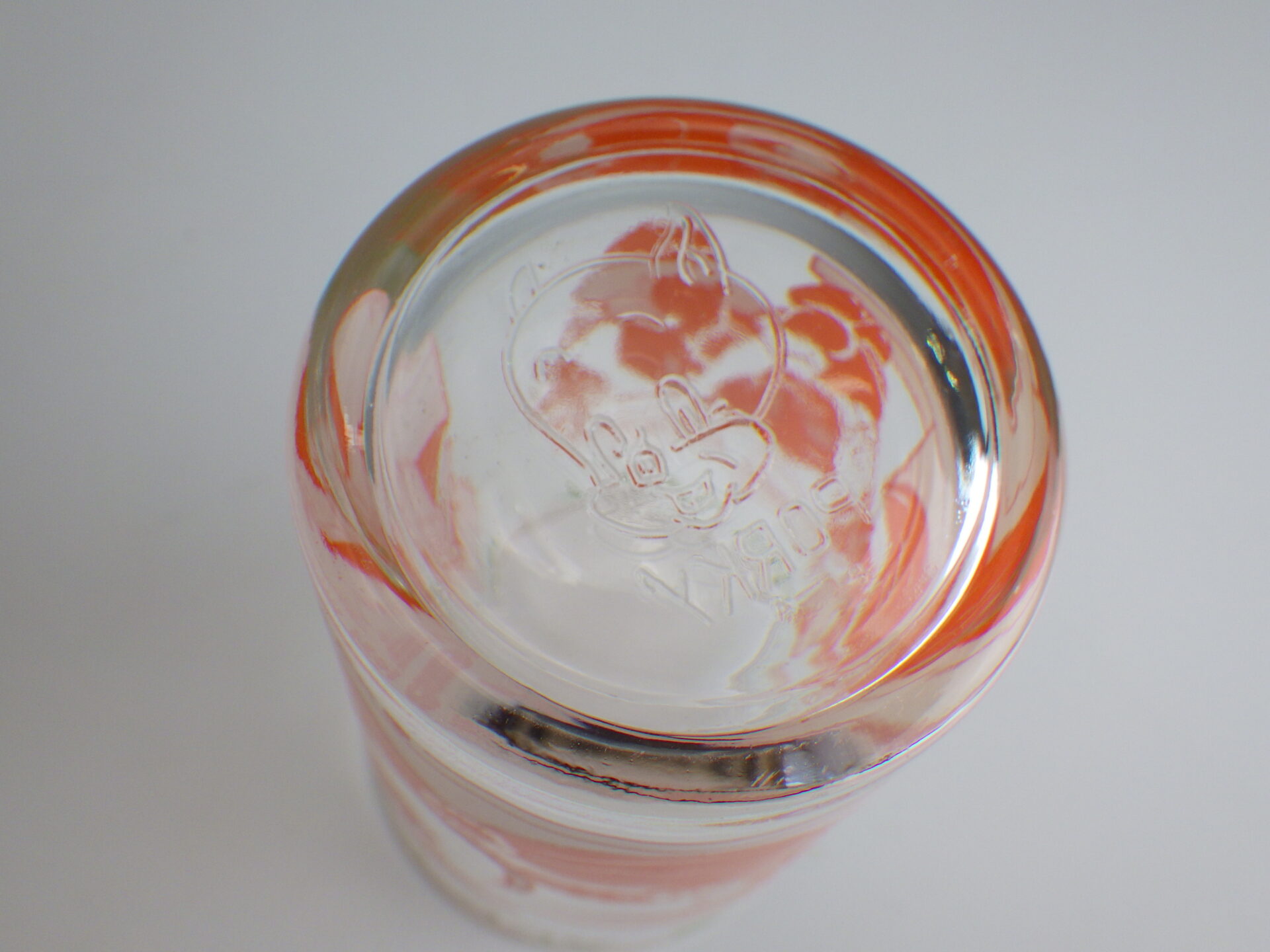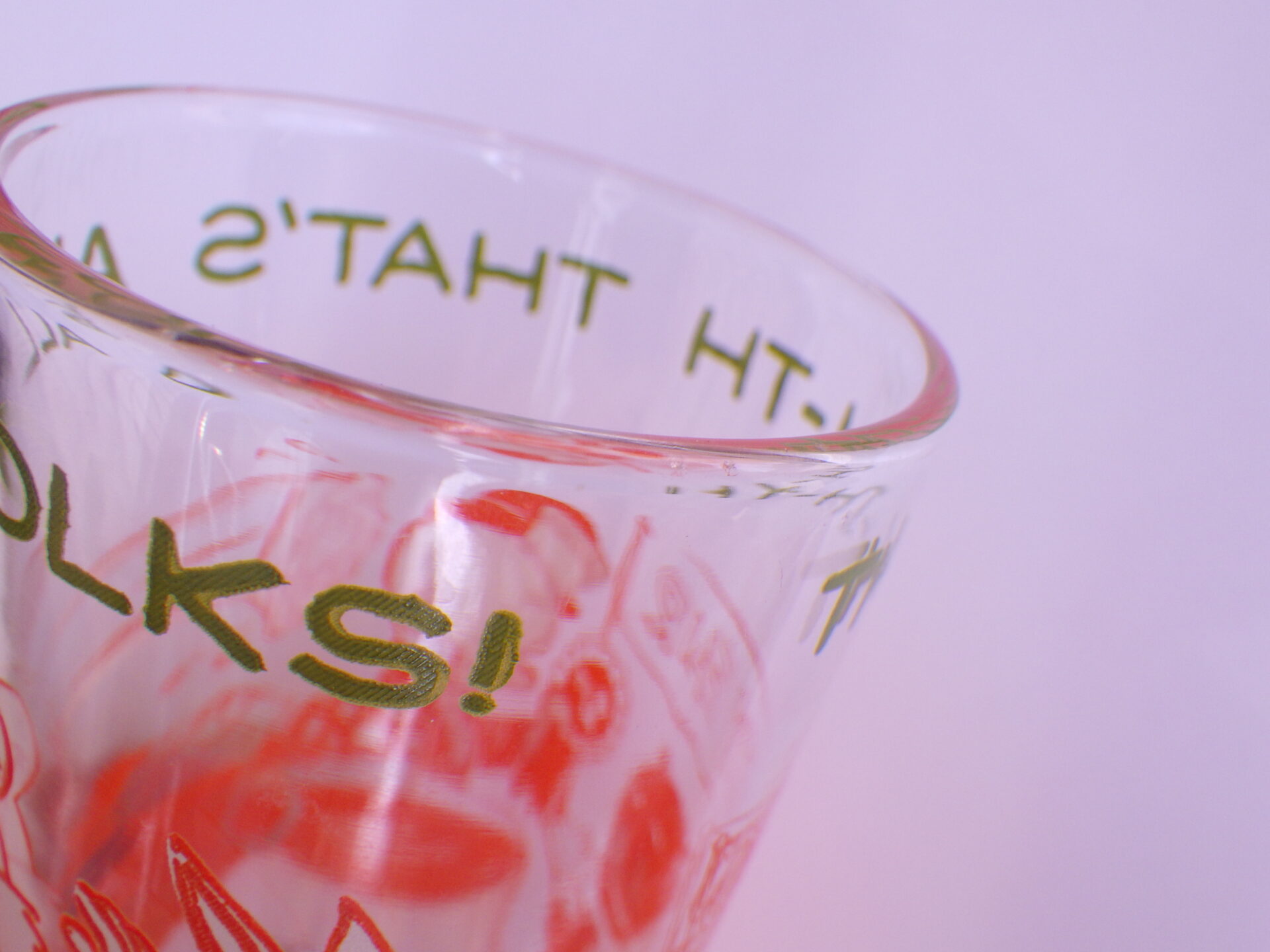 | 日本でもお馴染み、「バックス・バニー」や「トゥイーティー」などのキャラクターが活躍するアメリカのアニメ「ルーニー・テューンズ」のグラス。 ウェルチ×ワーナーブラザーズのノベルティとして製造されました。 作品のラストを飾る「TH-TH-TH THAT'S ALL FOLKS!(こ、こ、こ、これでおしまい!)」というポーキー・ピッグのセリフもプリントされています。 ボトム面のキャラクターエンボスは、クッキーの型押しに使えます。 |