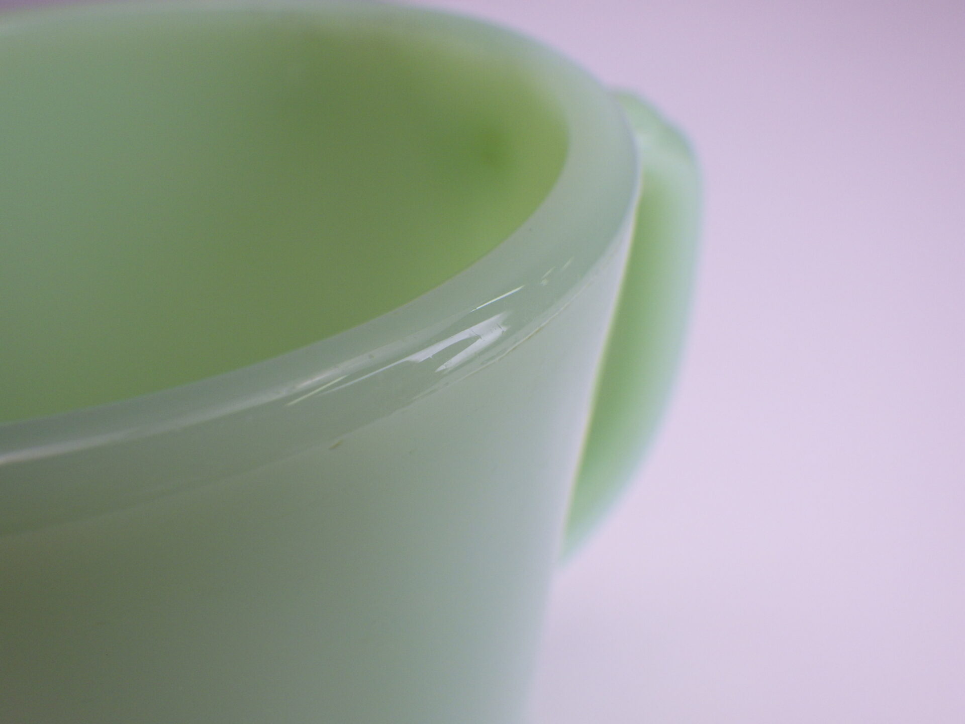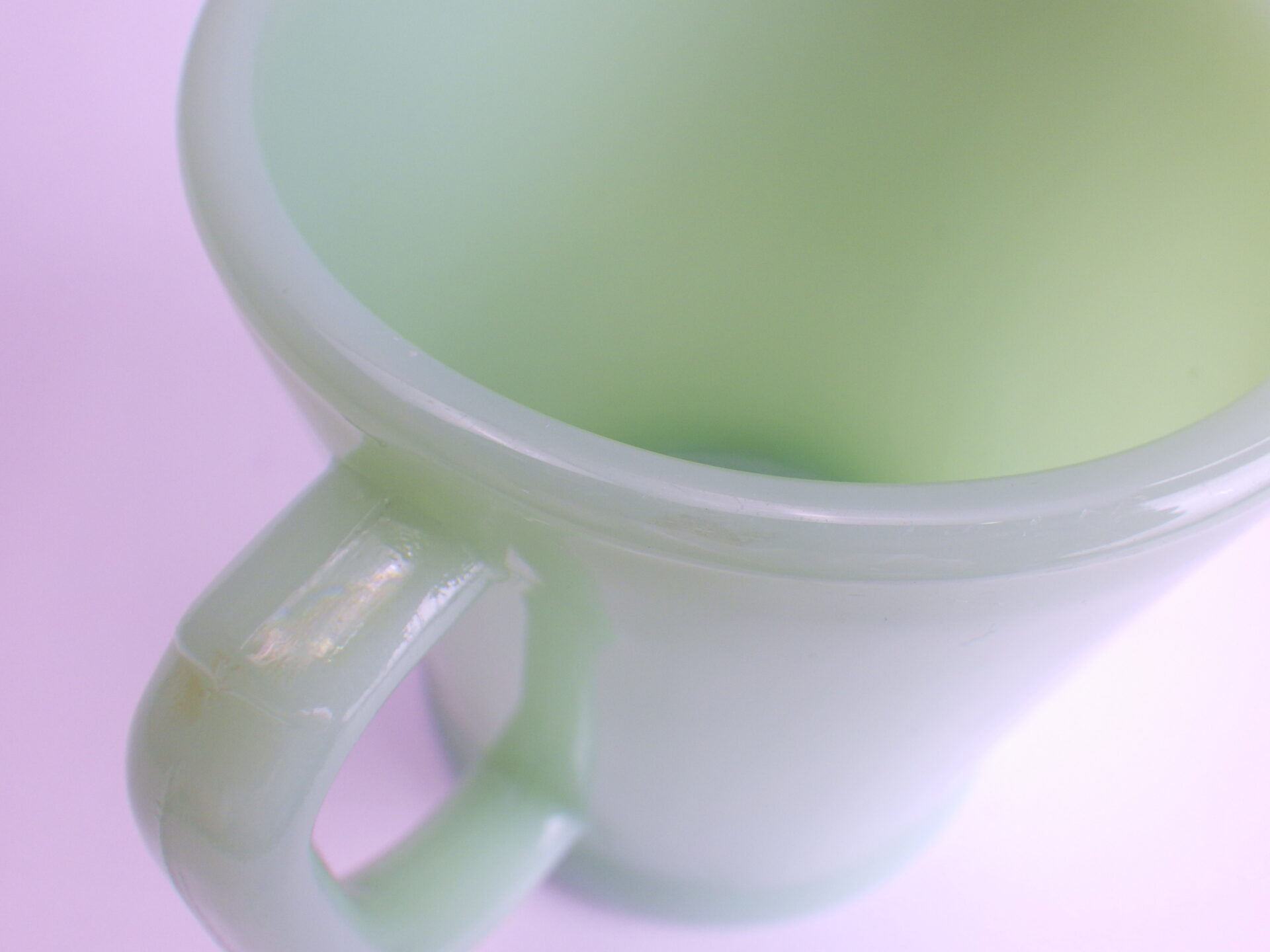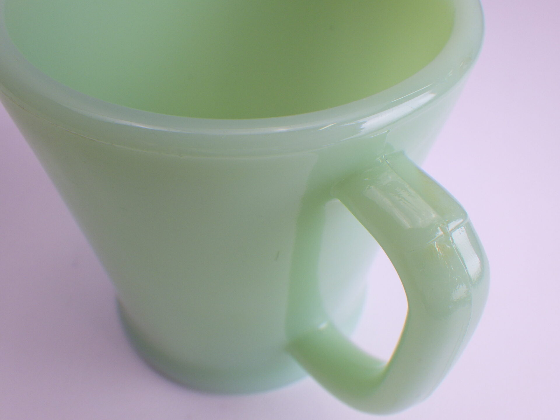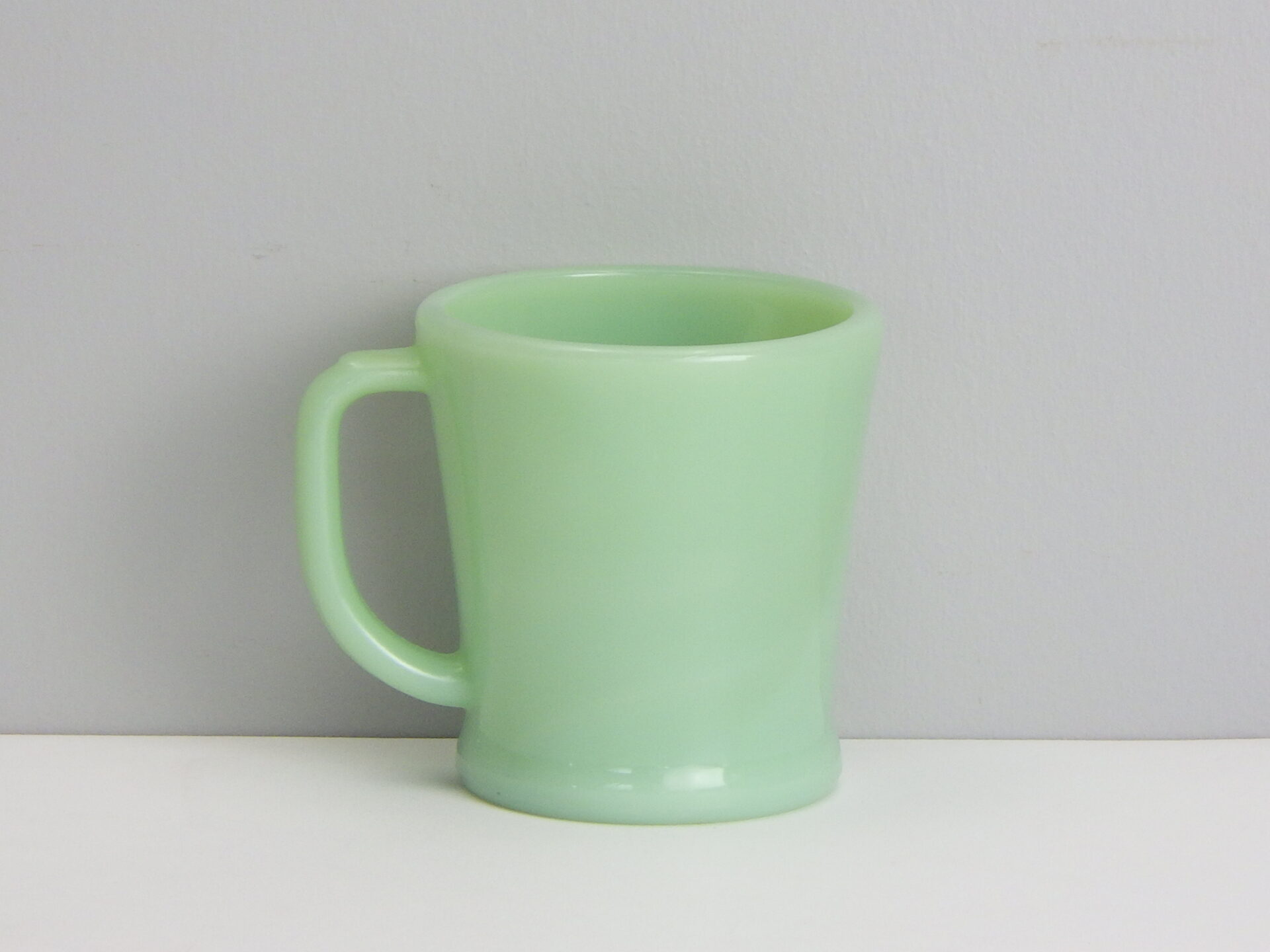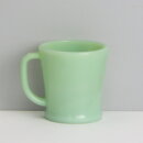 | 「ジェダイ」はファイヤーキングを代表するジェードカラー(翡翠色)のシリーズで、1940年代頃のアメリカではガラス製品によく使われていました。 こちらはDハンドルマグの中でも初期に製造されていた、ボトムが平らなデザインのもの。通称「フラットボトムマグ」とも呼ばれます。 後期のDハンドルに比べると厚み、重量感があります。 アイボリーとジェダイだけに存在するシェービングマグを使うことで、より古い時代のアメリカを感じられることでしょう。 |