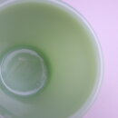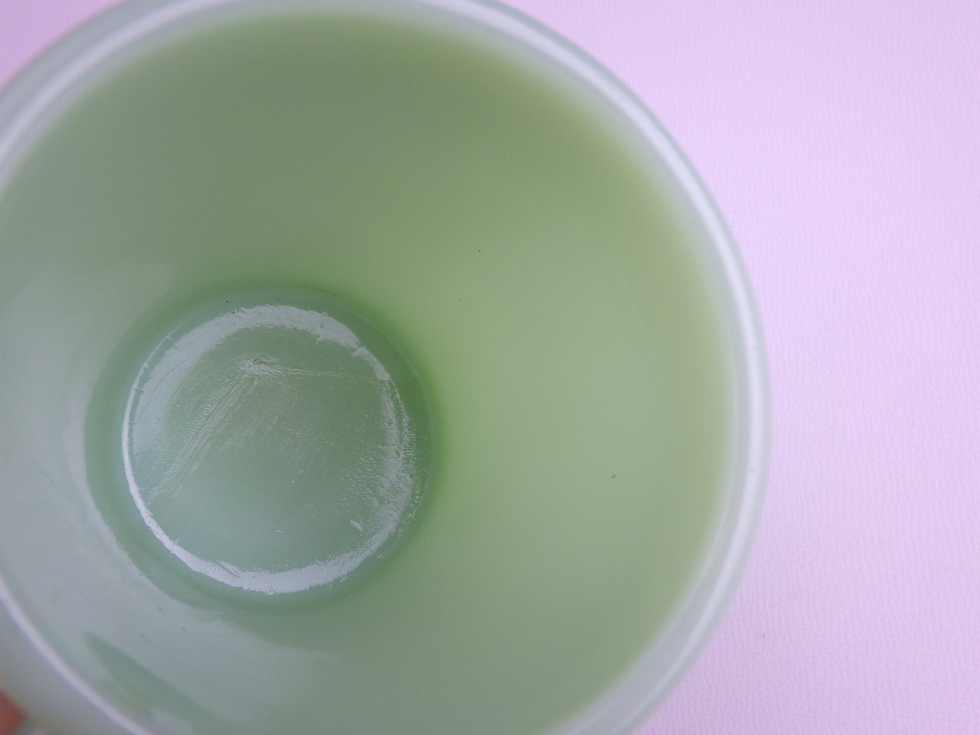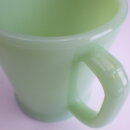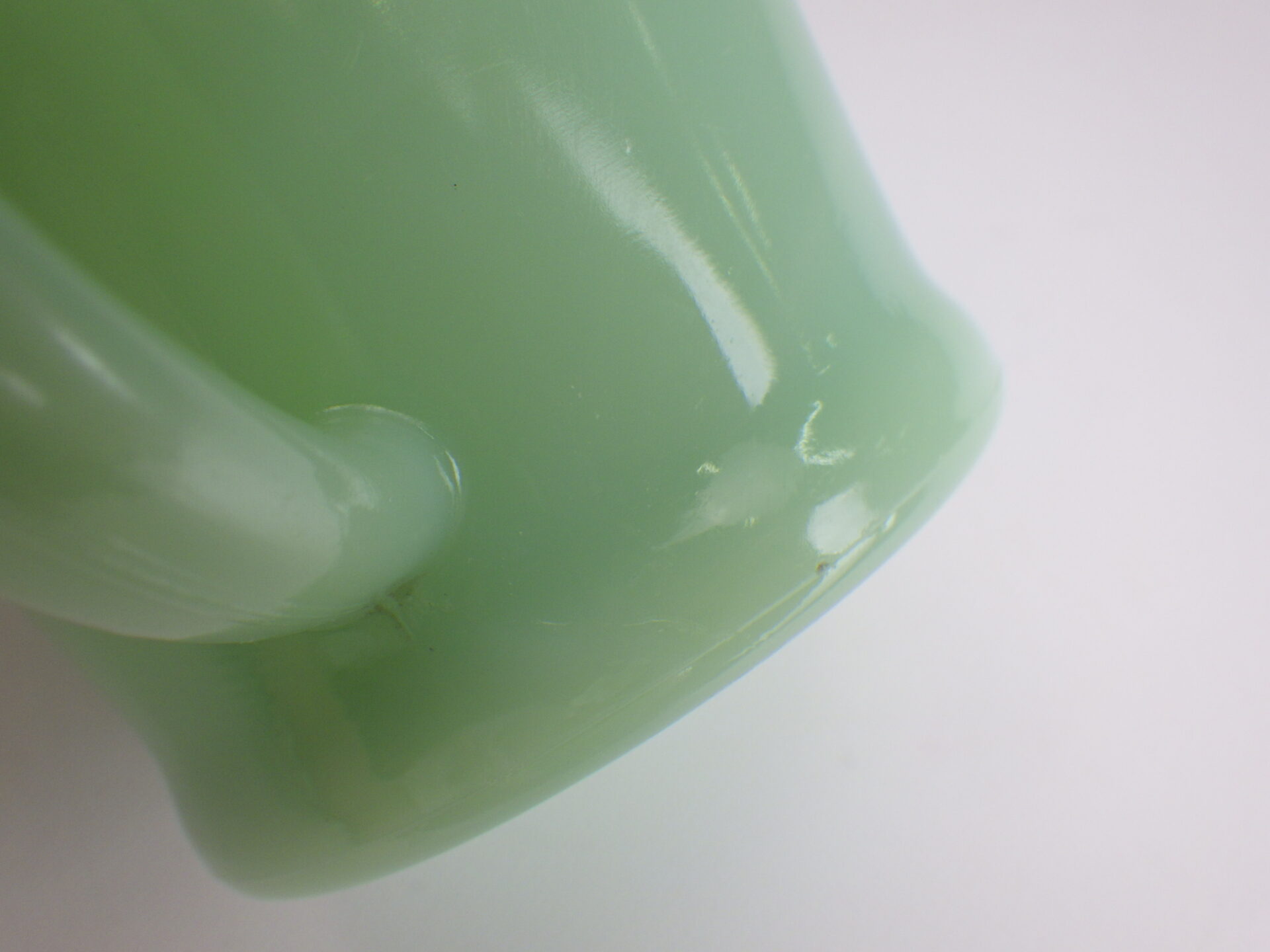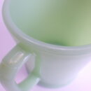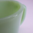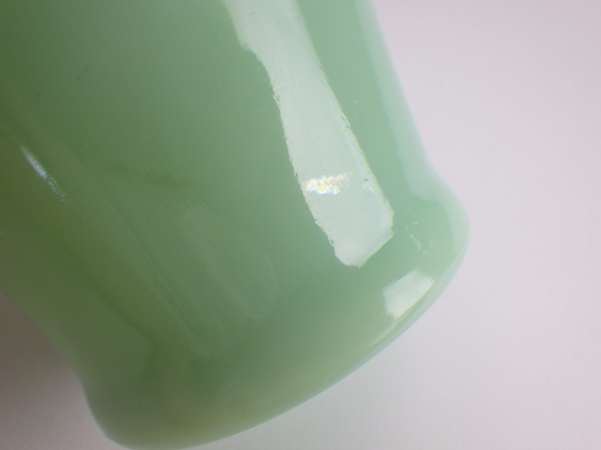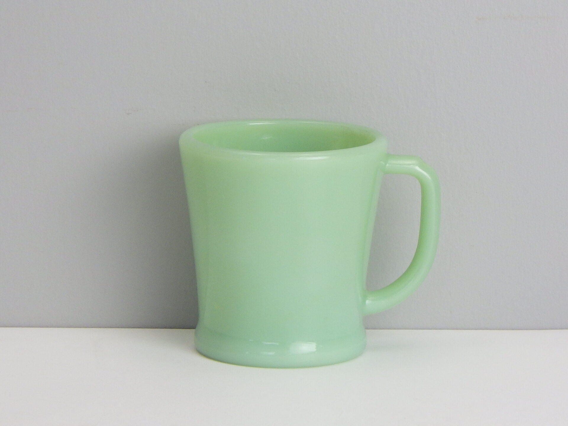 | 「ジェダイ」はファイヤーキングを代表するジェードカラー(翡翠色)のシリーズで、1940年代頃のアメリカではガラス製品によく使われていました。 こちらはDハンドルマグの中でも初期に製造されていた、ボトムが平らなデザインのもの。通称「フラットボトムマグ」とも呼ばれます。 後期のDハンドルに比べると厚み、重量感があります。 アイボリーとジェダイだけに存在するシェービングマグを使うことで、より古い時代のアメリカを感じられることでしょう。 |