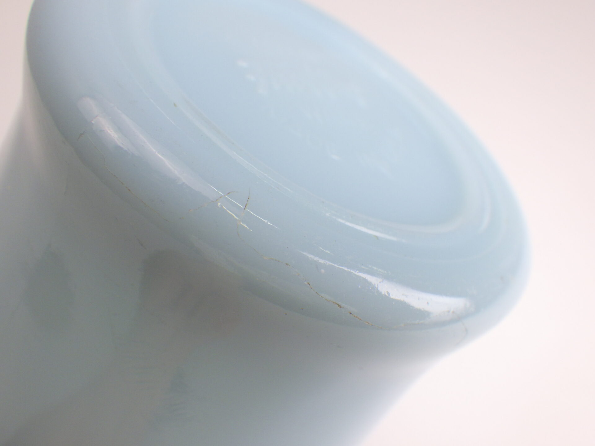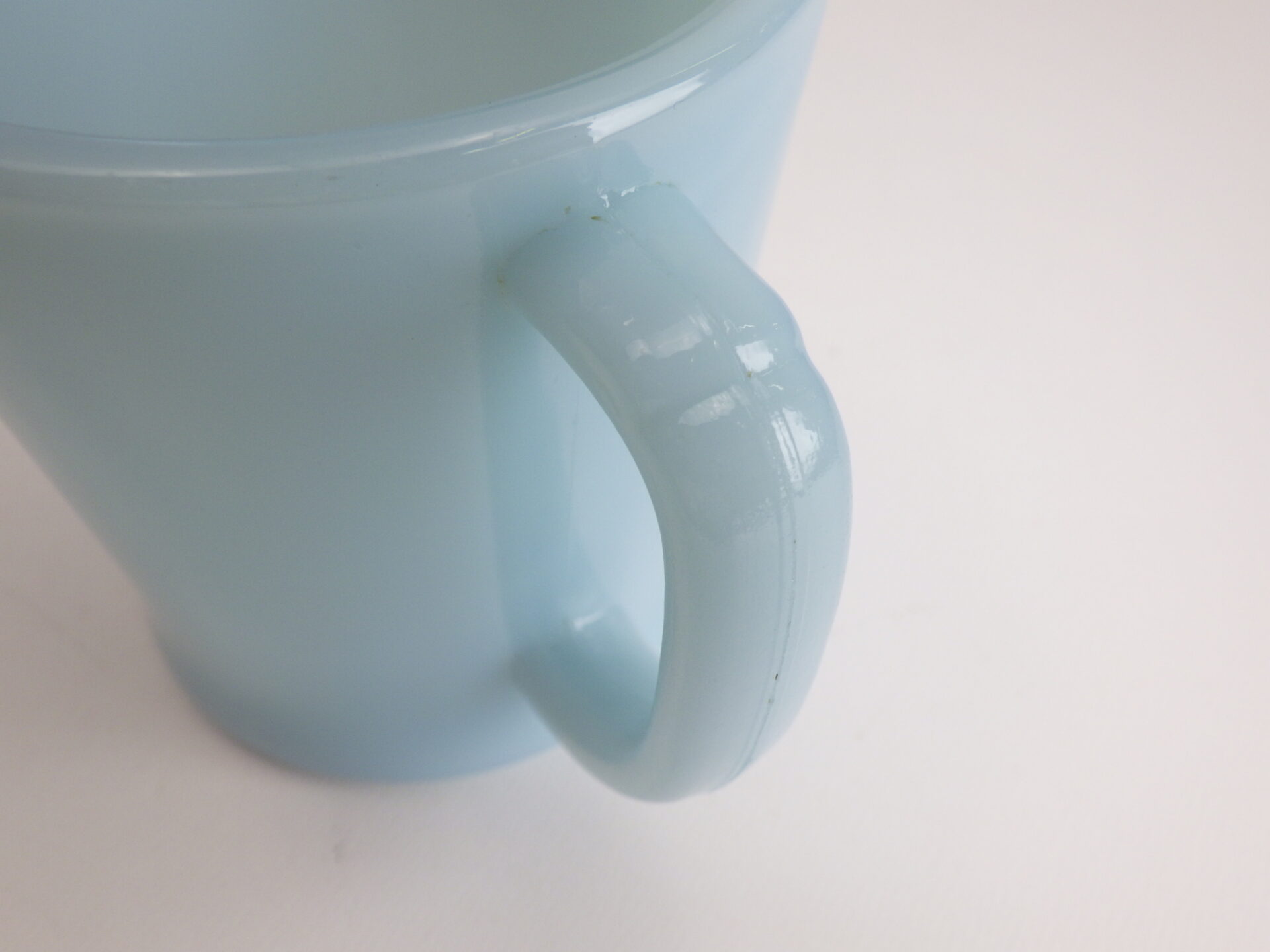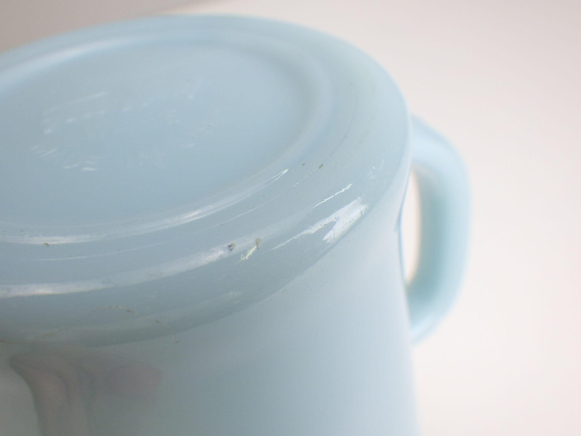 | condition | リム内側に、ごくわずかなチップ、がたつき、薄い着色があります。 ボトム、ハンドルに薄い着色があります。 ボトムに浅いキズがあります。 ミルクガラス特有の製造時よりのヘアライン、ヨレなどありますが、ご使用に影響のあるダメージはなく、ツヤもあり良い状態です。 その他気になる点や、追加画像の必要な場合は、お気軽にお問い合わせ下さい。 |
