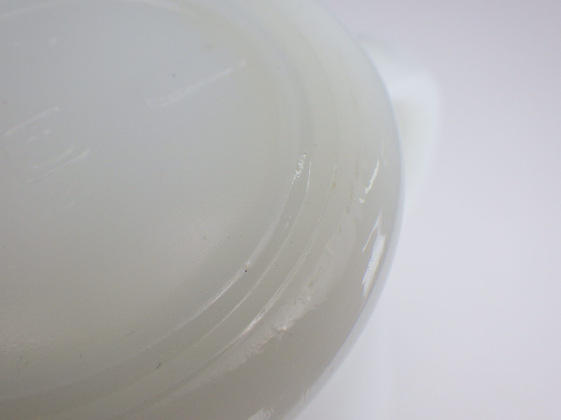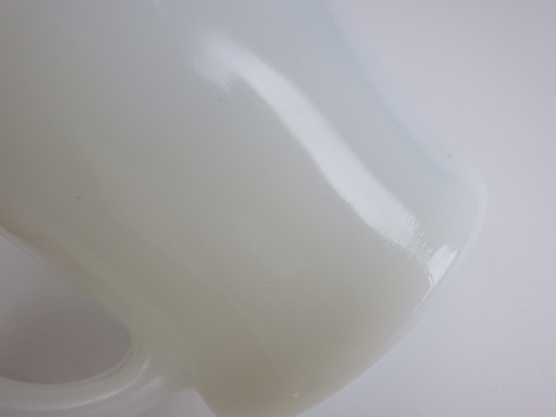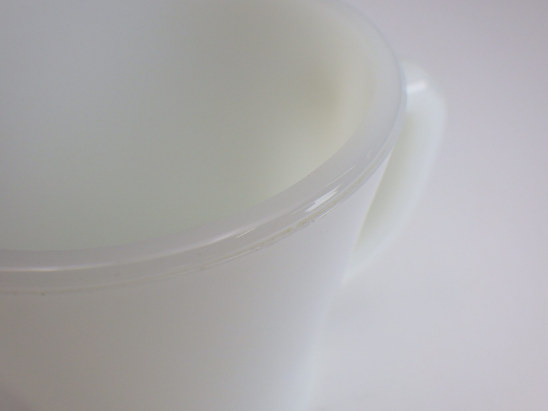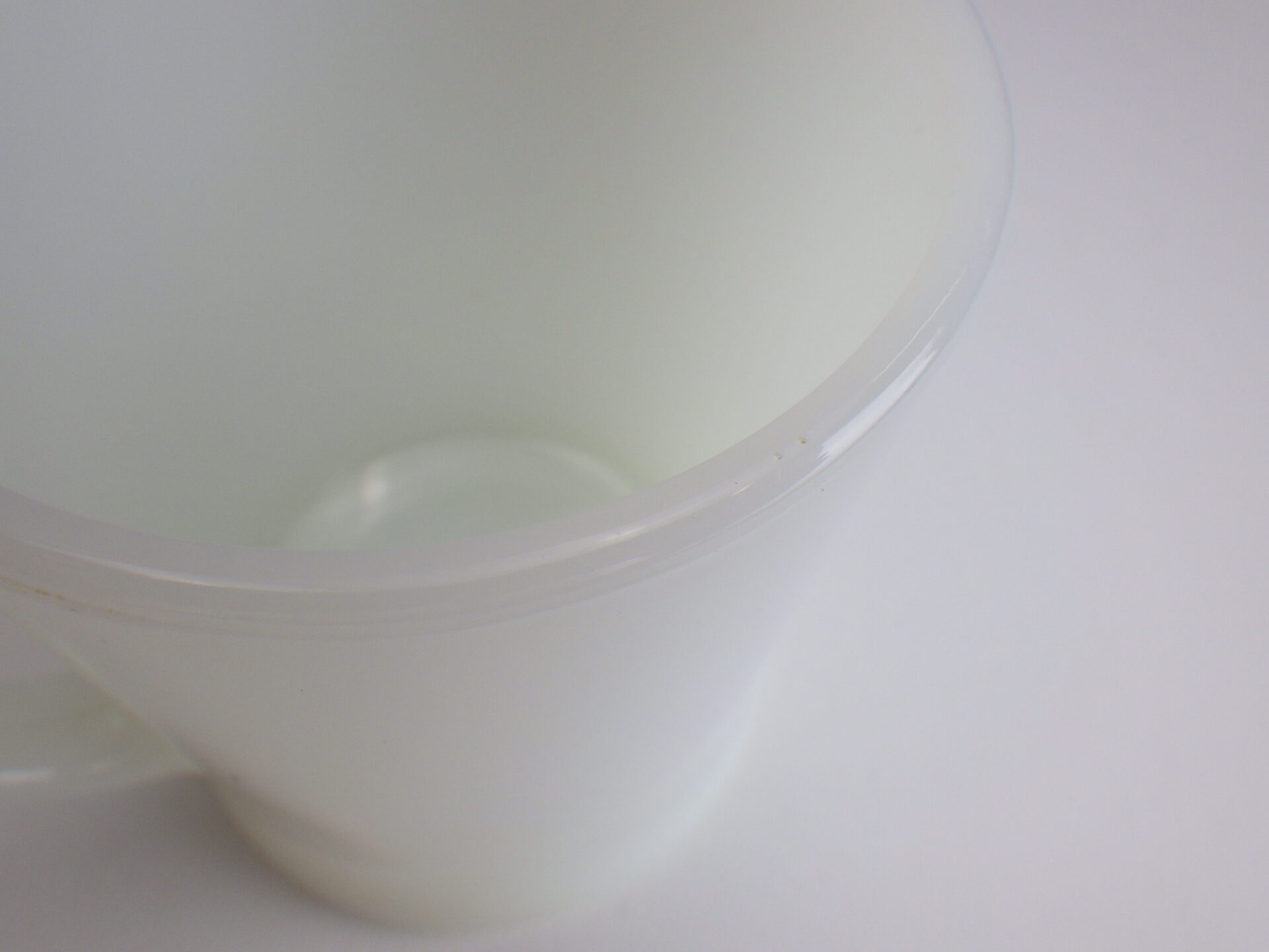 | condition | ボトムに小さな当たりキズがあります。 ミルクガラス特有のヘアラインなどあります。 ボトム、側面、ハンドル、リムにごくわずかな薄い着色があります。 その他ご使用に影響があるダメージはなく、ツヤもあり良い状態です。 不明な点や追加画像の必要な場合は、お気軽にお問い合わせ下さい。 |