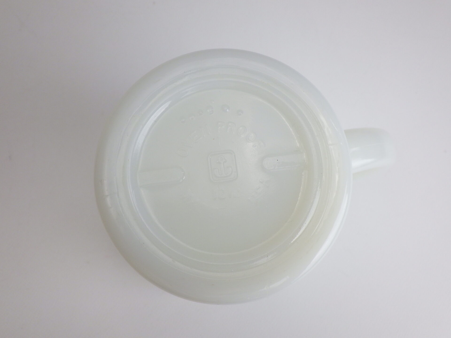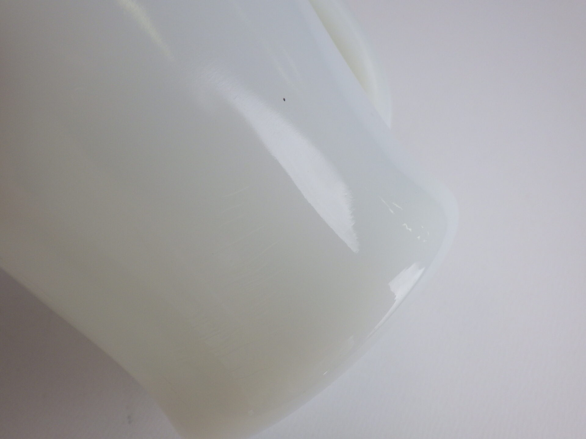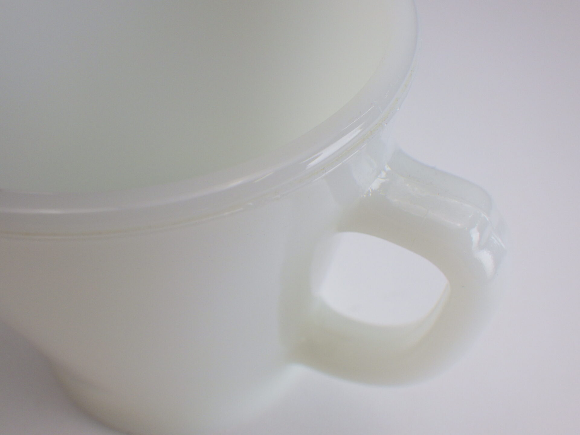 | condition | ボトムに小さな当たりキズがあります。 ミルクガラス特有のヘアラインなどあります。 ボトム、側面、ハンドル、リムにごくわずかな薄い着色があります。 その他ご使用に影響があるダメージはなく、ツヤもあり良い状態です。 不明な点や追加画像の必要な場合は、お気軽にお問い合わせ下さい。 |