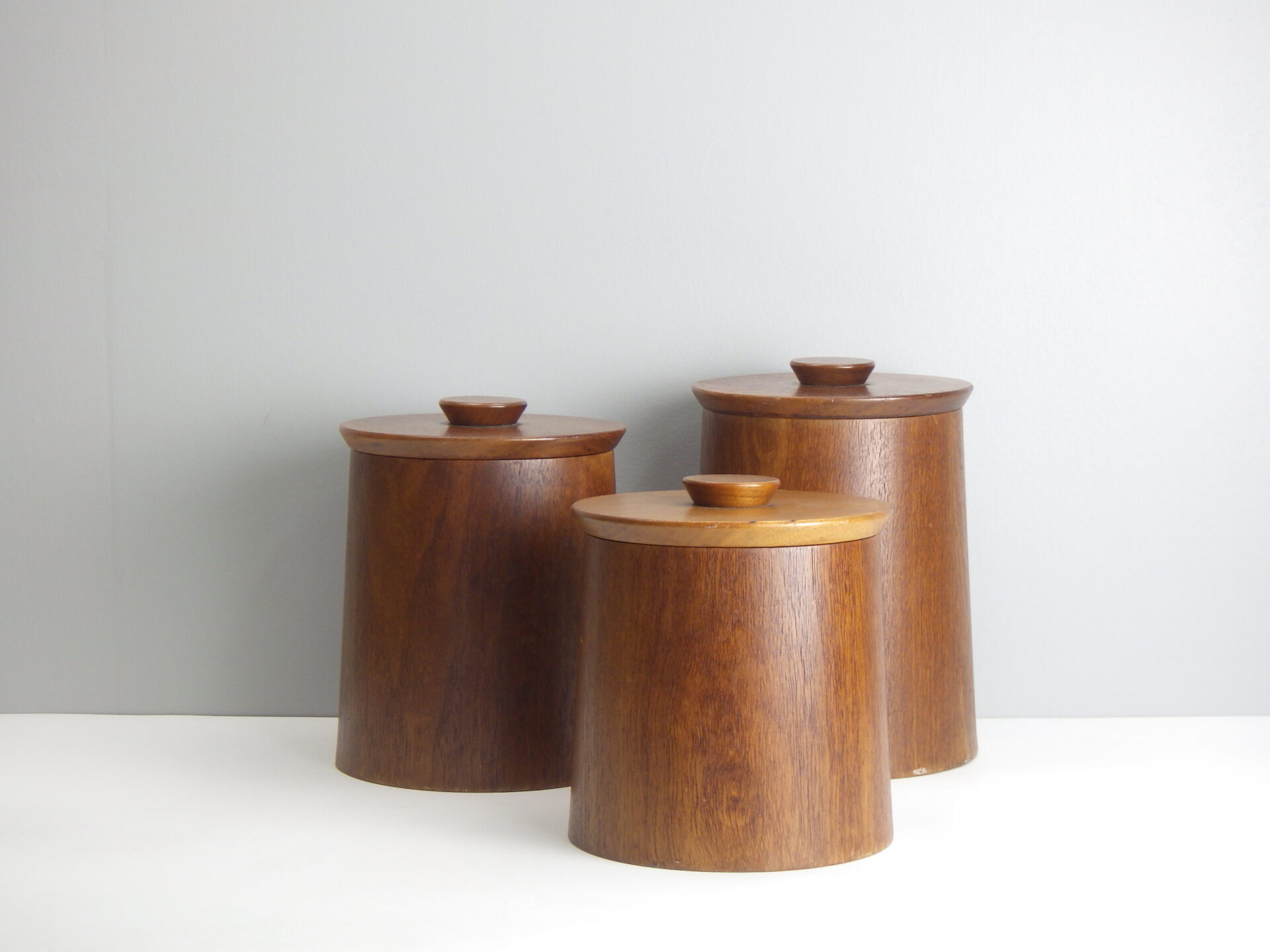 | アメリカで買い付けました、木製のキャニスター3点セットです。 チーク材ならではの温かで上質な雰囲気が、キッチンを彩ってくれること間違いなしですね。 キッチン以外の場所でも物入として、オブジェとしても活躍してくれそうな佇まいです。 |