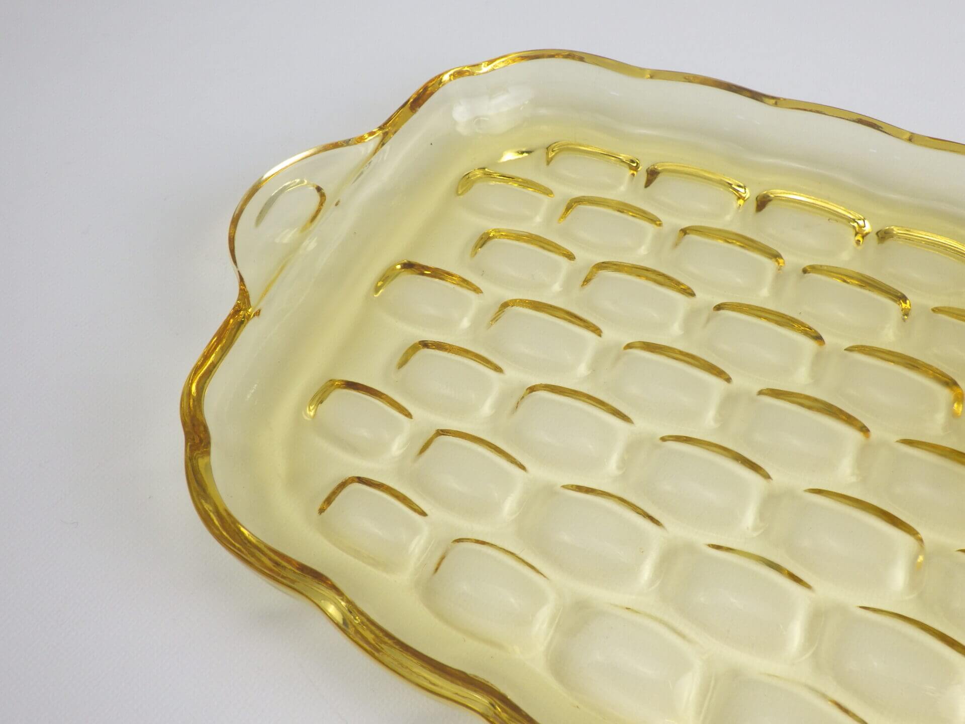 | アメリカで買い付けました。 フェデラル社の「YORK TOWN」シリーズのスナックセットです。 こちらのシリーズはクリア、オーロラなど他のカラーも存在しますが、こちらのアンバーカラーはトロリとした飴色のようでとても美しく、おすすめです。 未使用デッドストックのシールがカップの裏に付いています。 |
