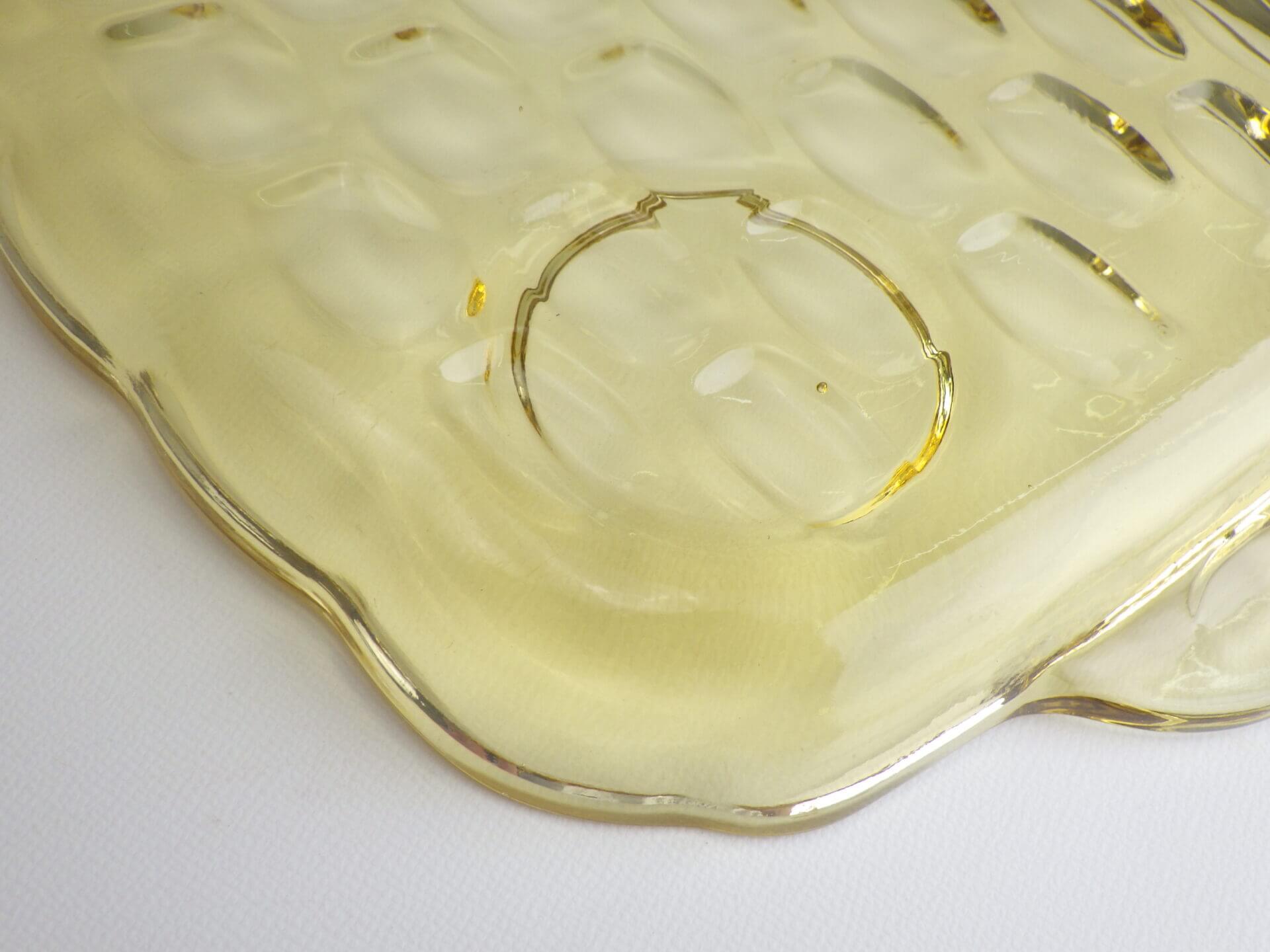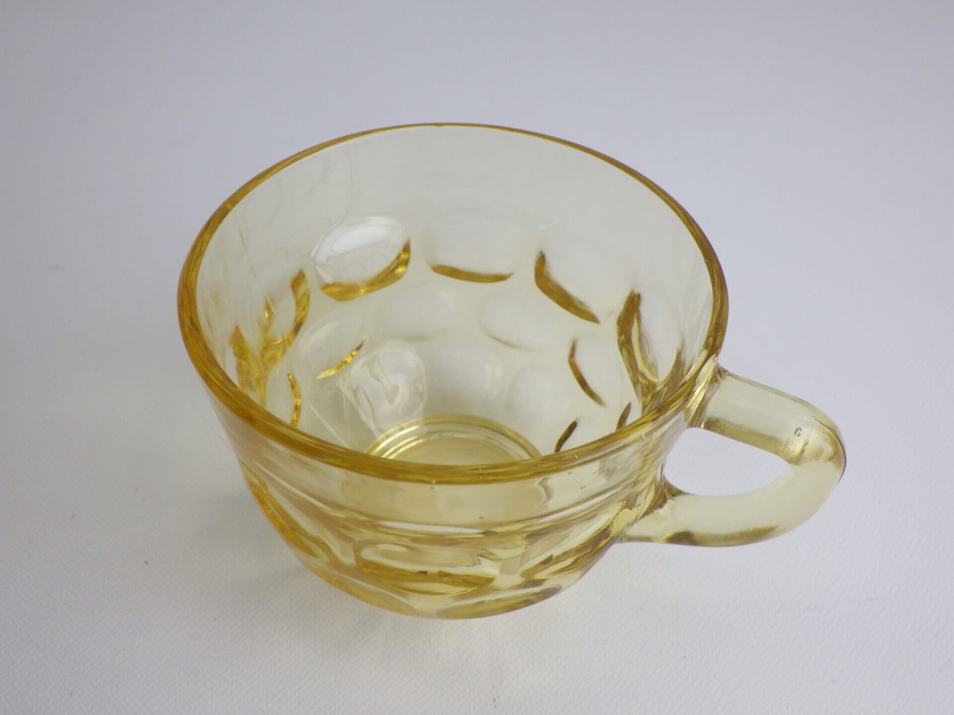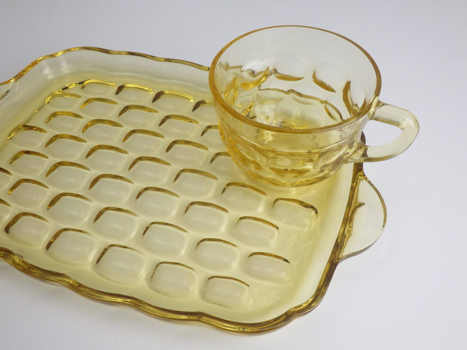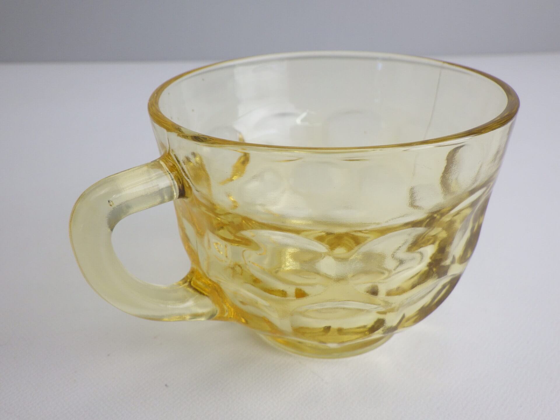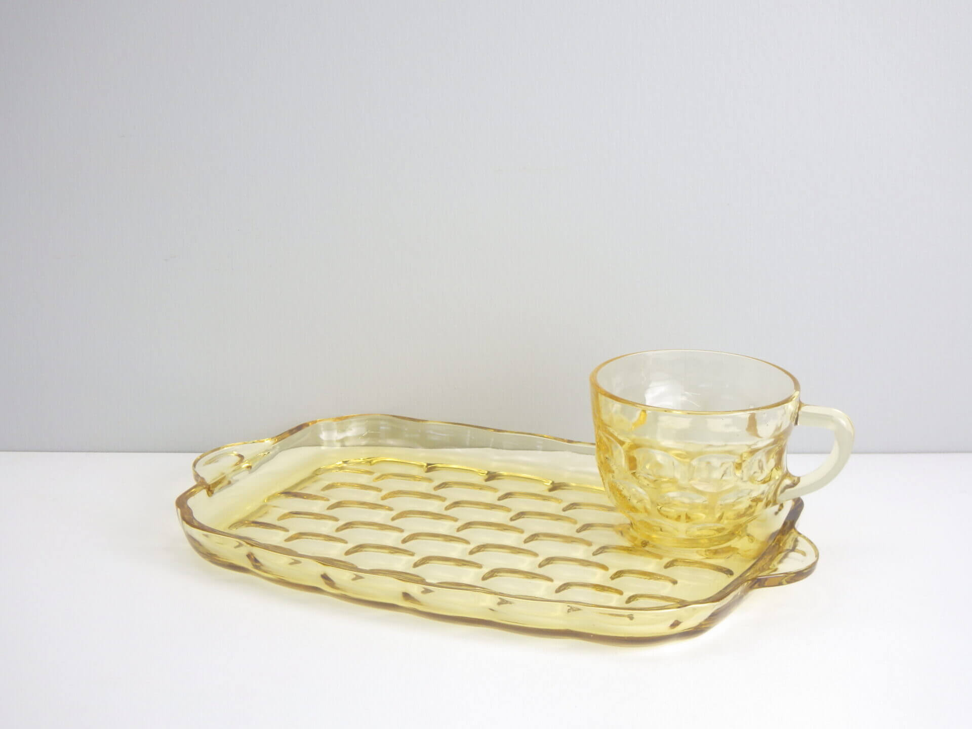 | アメリカで買い付けました。 フェデラル社の「YORK TOWN」シリーズのスナックセットです。 こちらのシリーズはクリア、オーロラなど他のカラーも存在しますが、こちらのアンバーカラーはトロリとした飴色のようでとても美しく、おすすめです。 未使用デッドストックのシールがカップの裏に付いています。 |