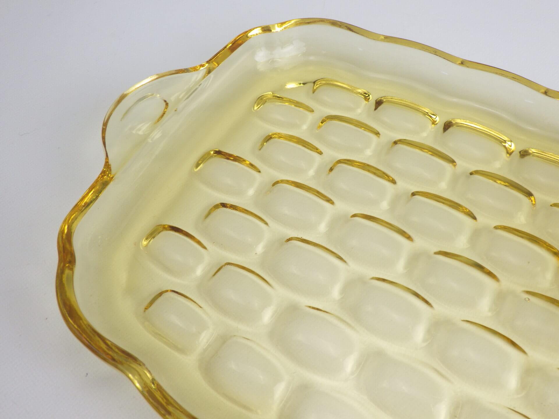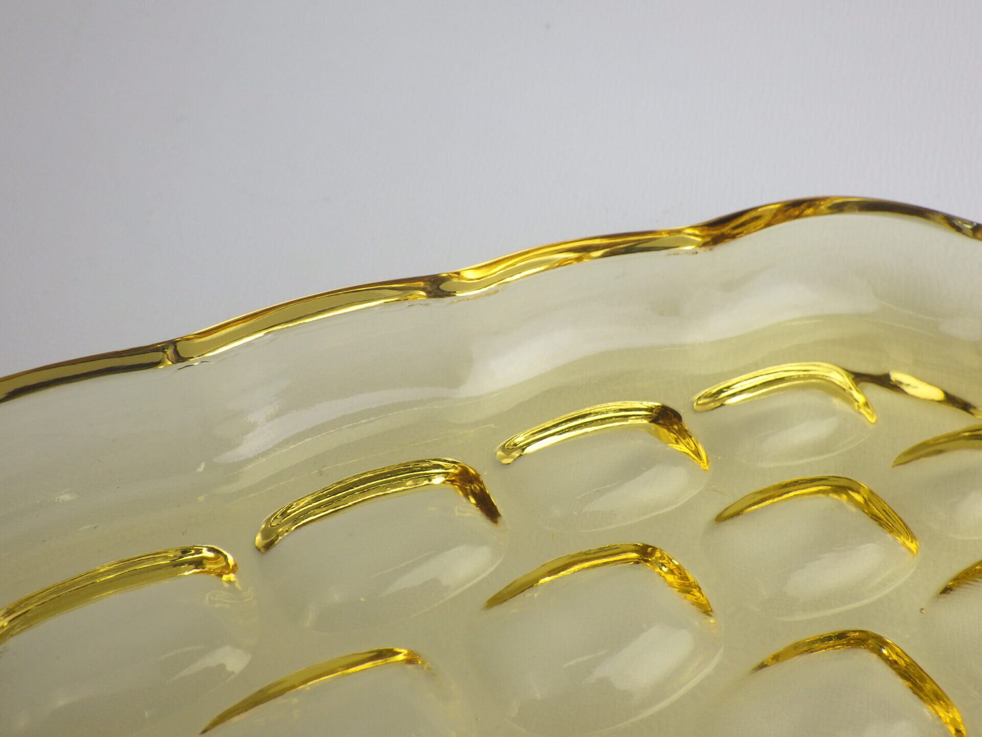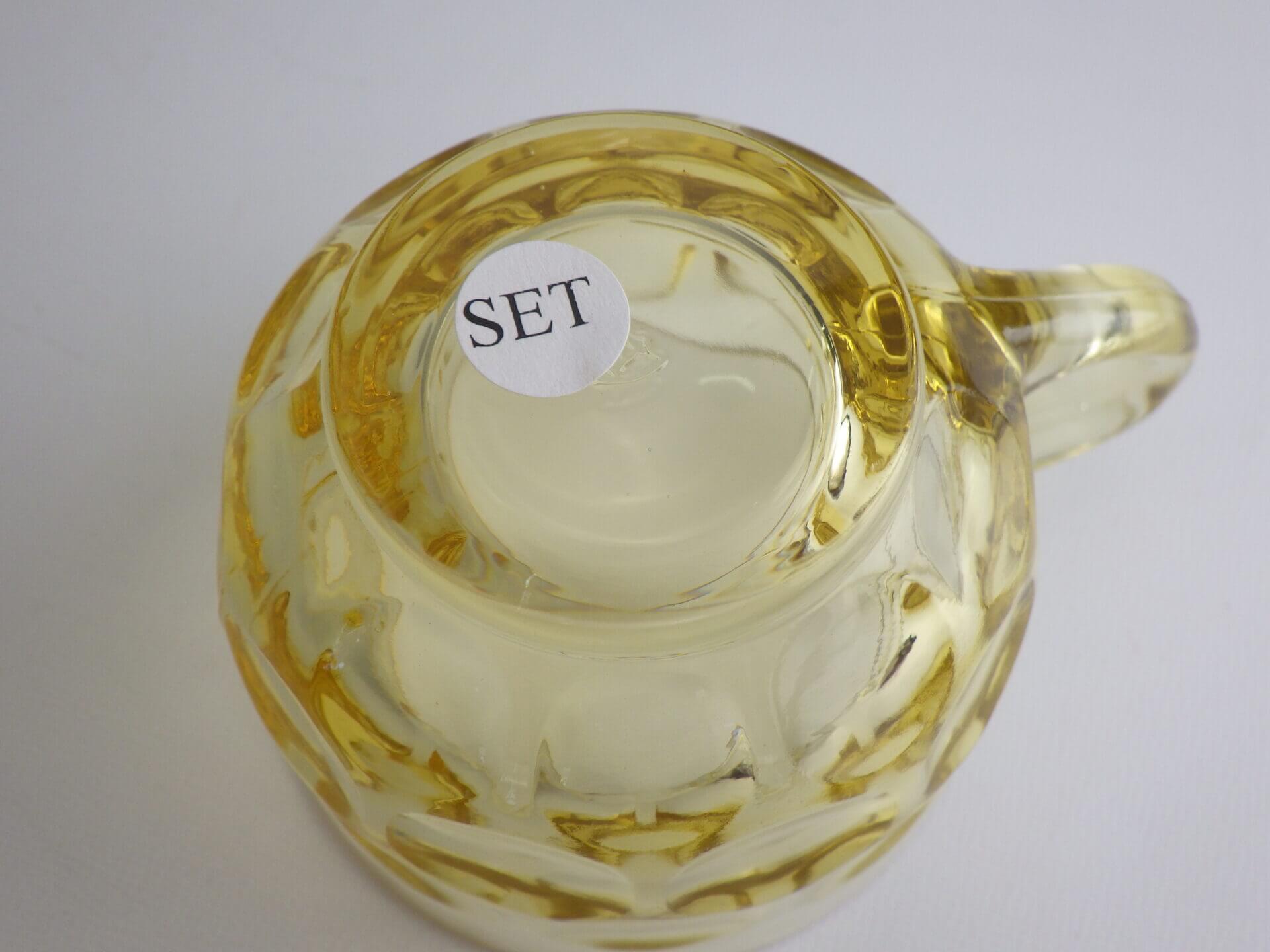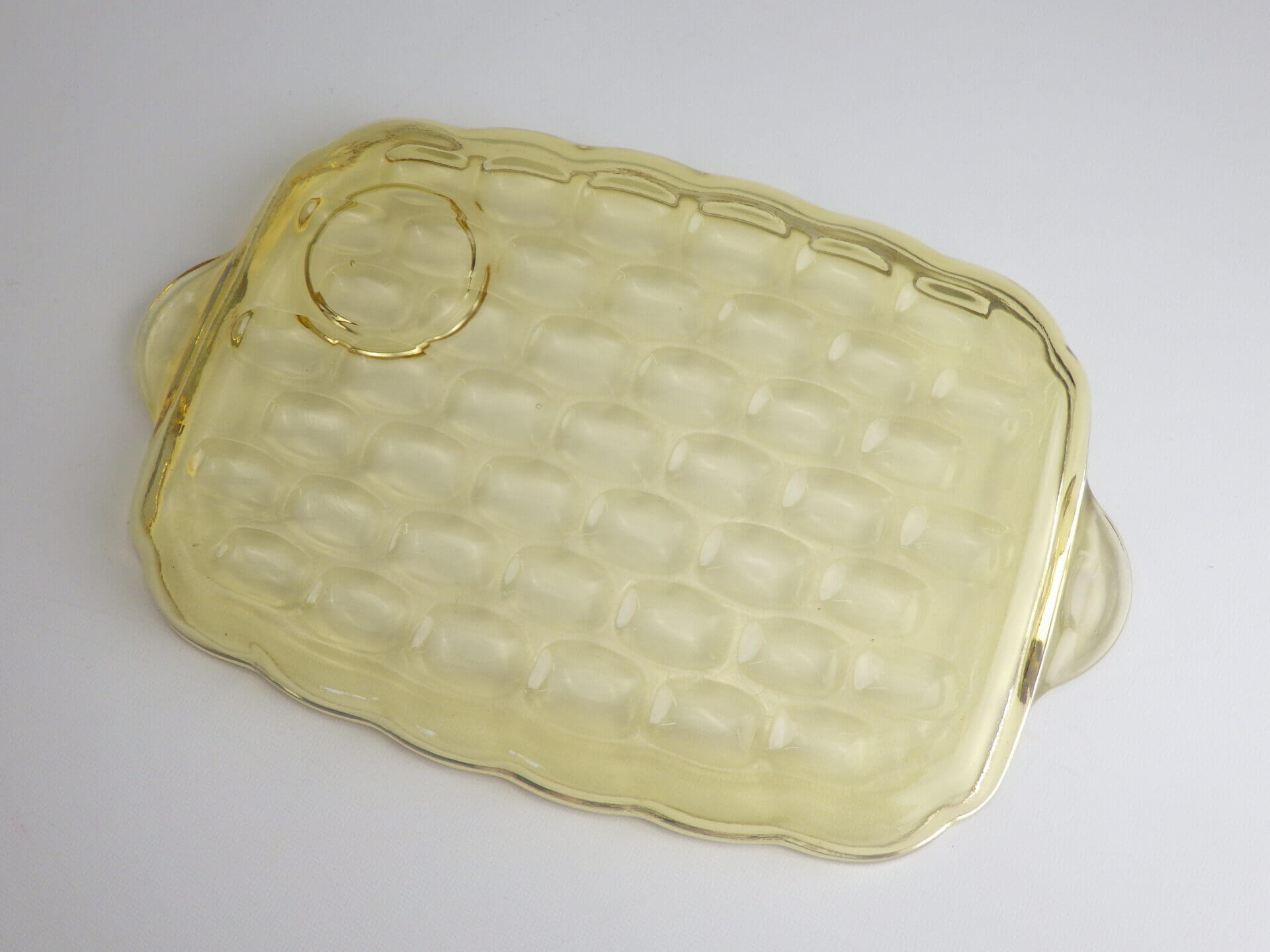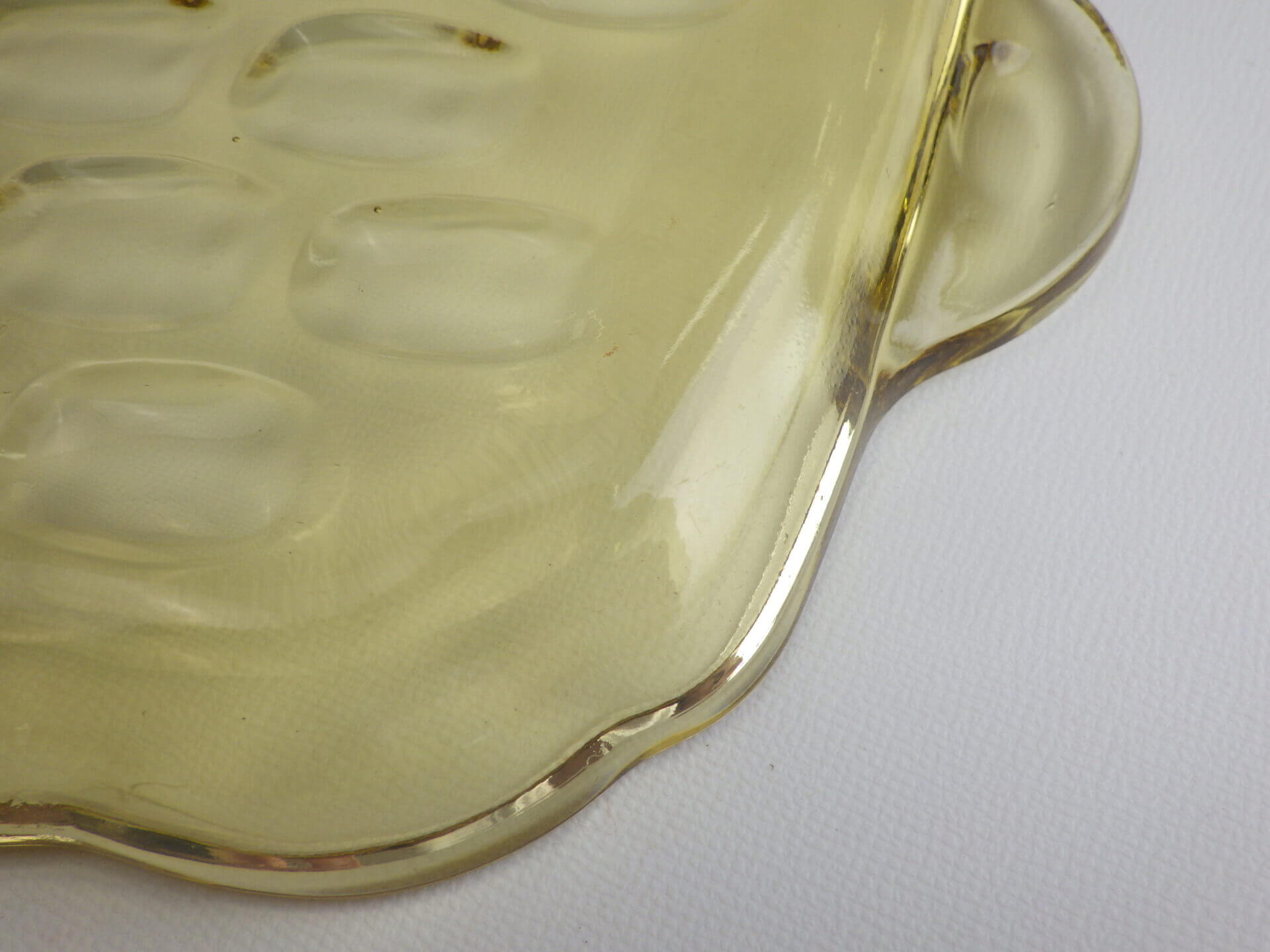 | アメリカで買い付けました。 フェデラル社の「YORK TOWN」シリーズのスナックセットです。 こちらのシリーズはクリア、オーロラなど他のカラーも存在しますが、こちらのアンバーカラーはトロリとした飴色のようでとても美しく、おすすめです。 未使用デッドストックのシールがカップの裏に付いています。 |