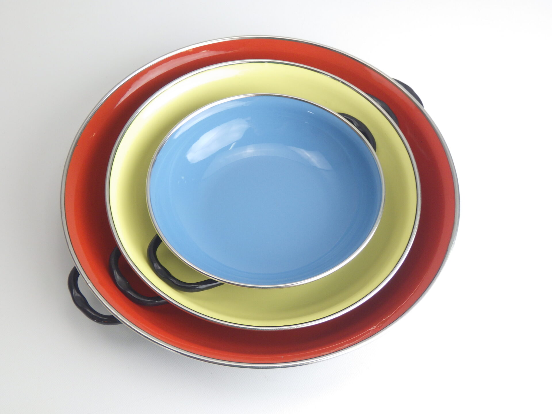 | アメリカで買い付けました、ビンテージのエナメルプレート(スキレット)です。 元は取り外し可能の取っ手付きで販売されていたようです。 裏面に「MADE IN YUGOSLAVIA」の刻印があります。 ユーゴスラビアで作られてアメリカに輸出されていた製品のようです。 厚めのしっかりとしたエナメル素材で作られており、ハンドル付きなので、調理をしてそのまま食卓に並べられそうですね。 もちろんプレートとしてもご使用いただけます。 ビンテージらしいカラーリングで、食卓を明るくしてくれそうですね。 |