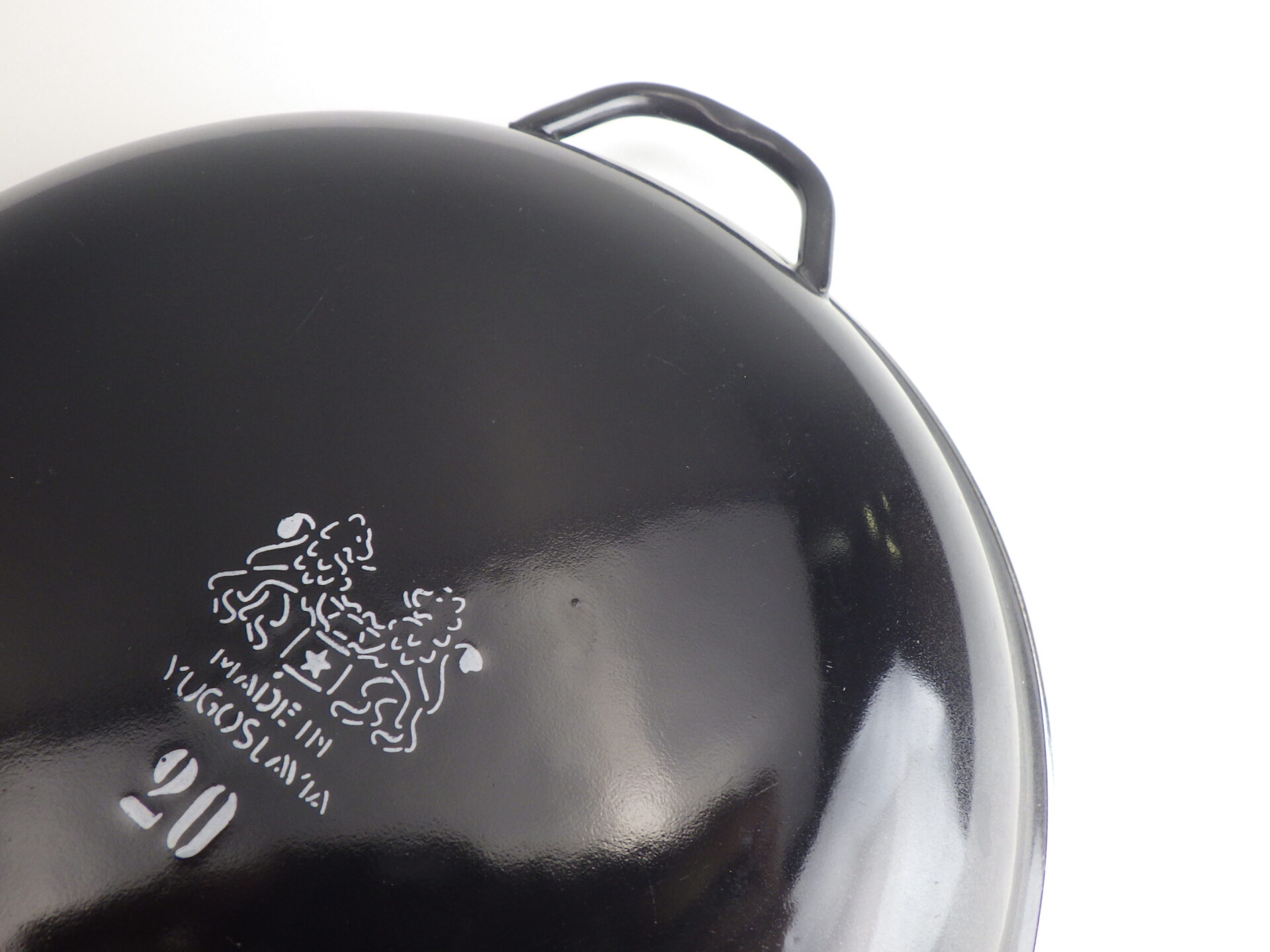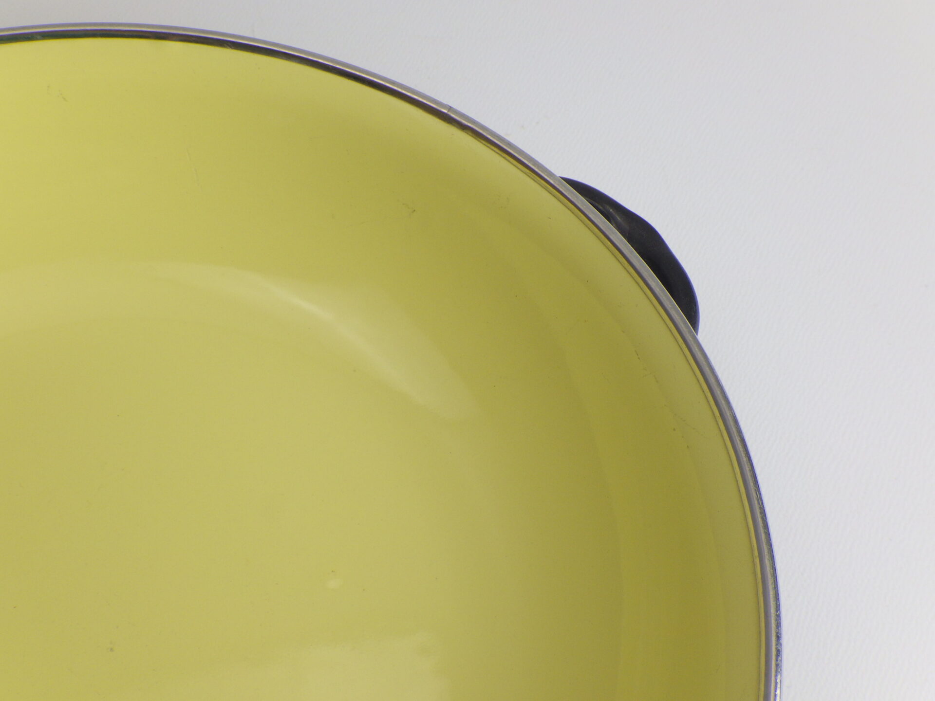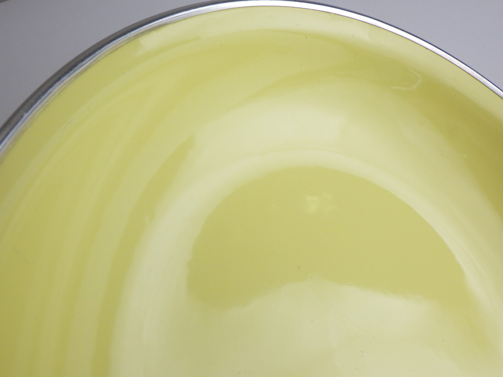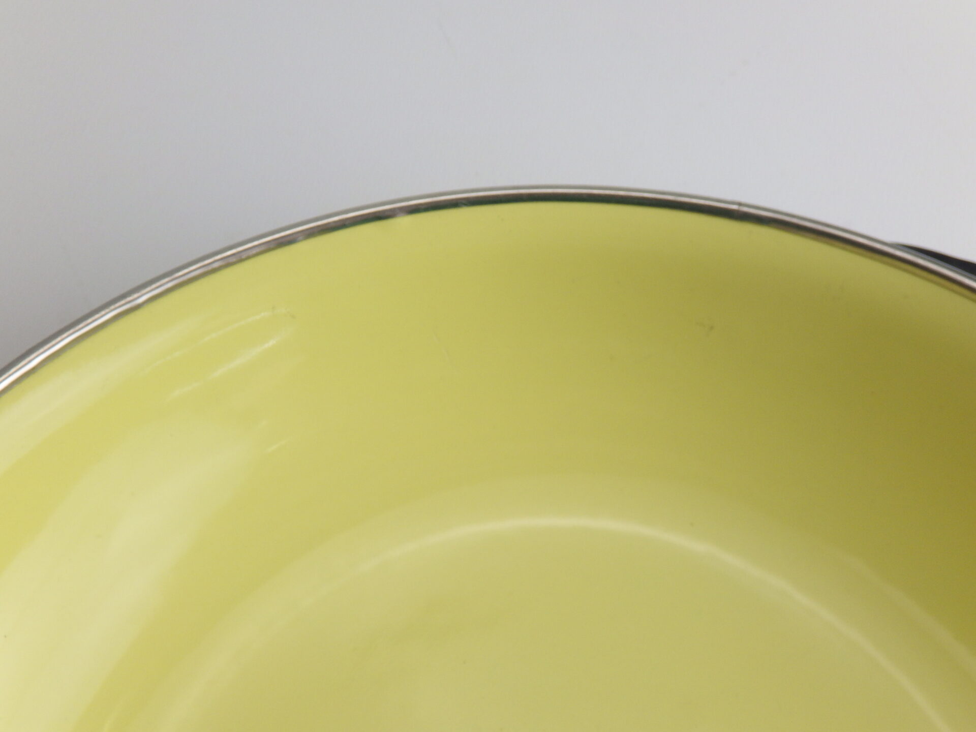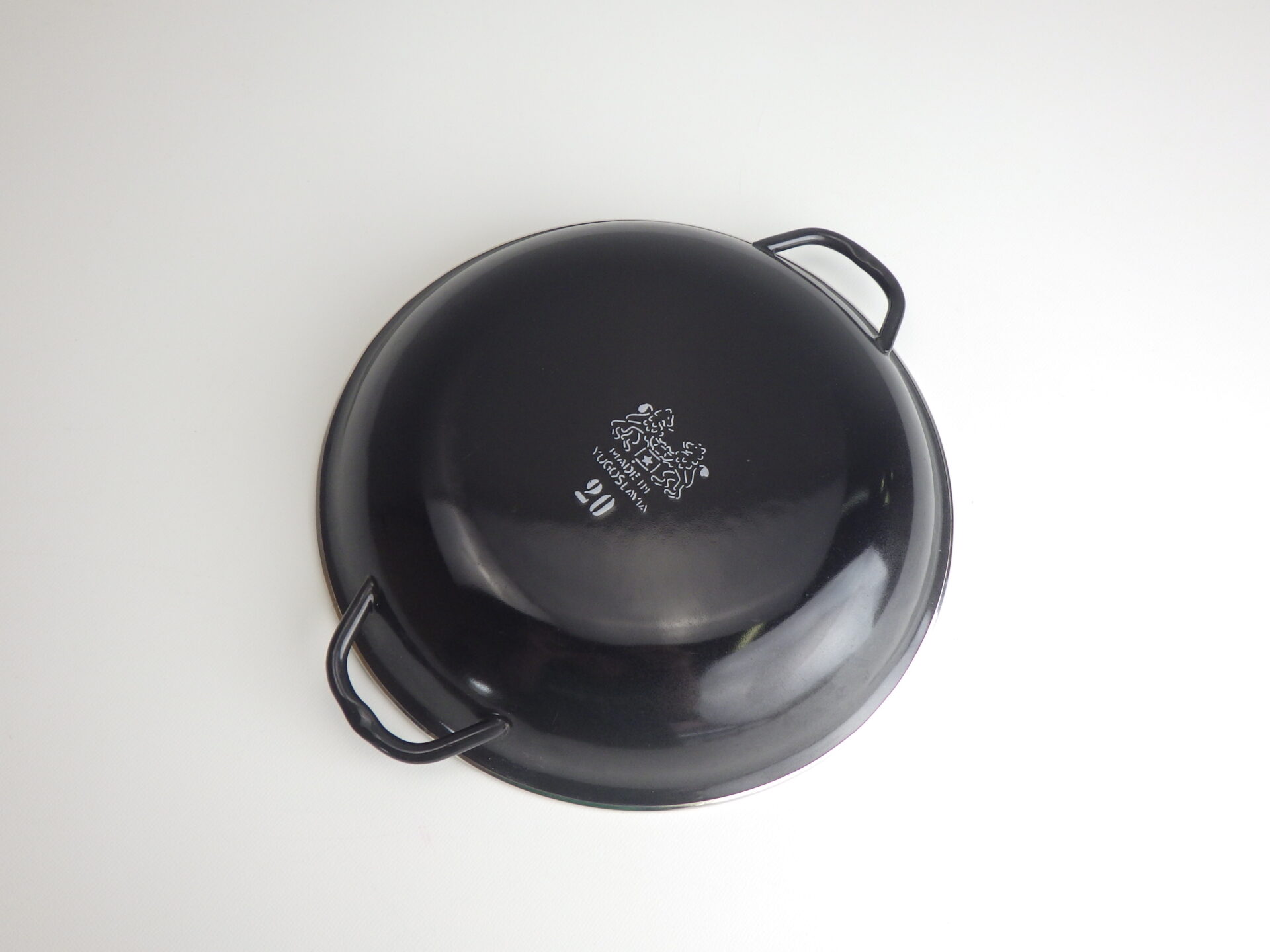| アメリカで買い付けました、ビンテージのエナメルプレート(スキレット)です。 元は取り外し可能の取っ手付きで販売されていたようです。 裏面に「MADE IN YUGOSLAVIA」の刻印があります。 ユーゴスラビアで作られてアメリカに輸出されていた製品のようです。 厚めのしっかりとしたエナメル素材で作られており、ハンドル付きなので、調理をしてそのまま食卓に並べられそうですね。 もちろんプレートとしてもご使用いただけます。 ビンテージらしいカラーリングで、食卓を明るくしてくれそうですね。 |