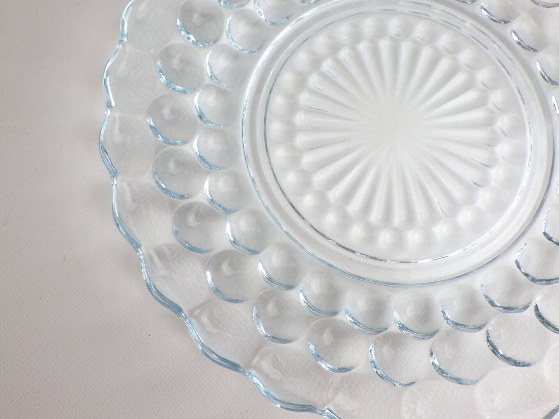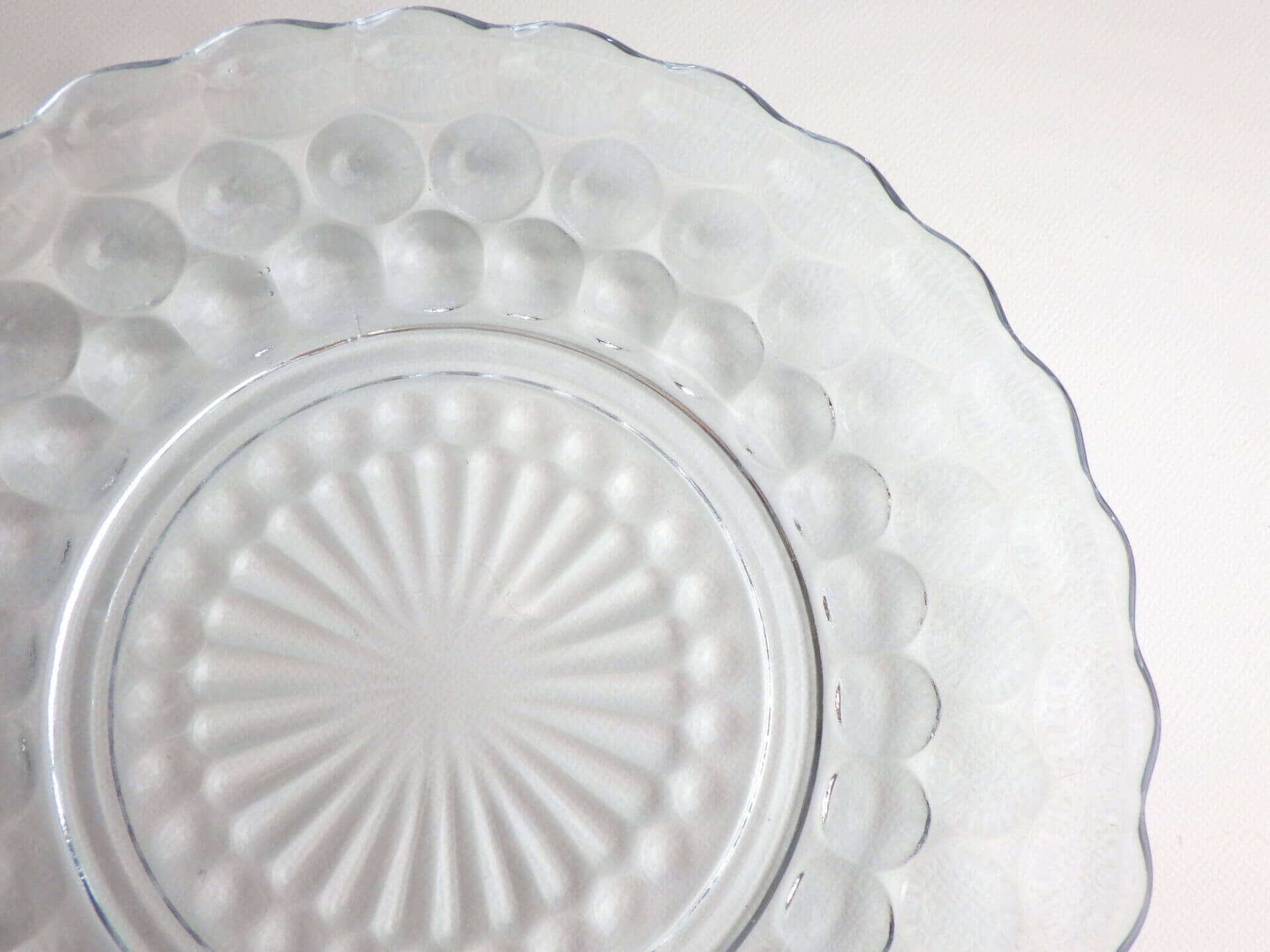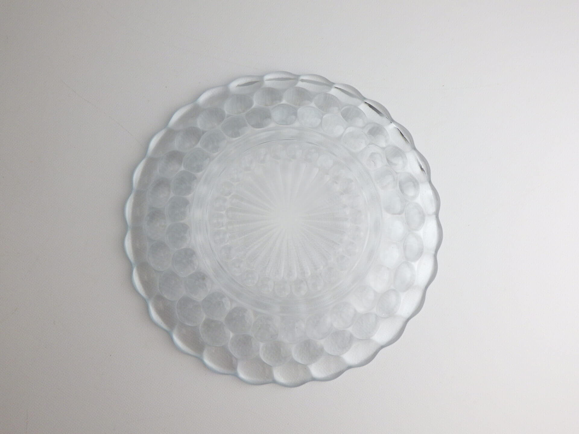 | エンボス加工が美しく、涼しげなバブルのプレートです。 ファイヤーキングの他のブレッド&バタープレートよりも大きめなので、ケーキなどのデザートやサラダの盛り付け、取り皿としても活躍してくれそうです。 来客時の使用にもおすすめしています。 |