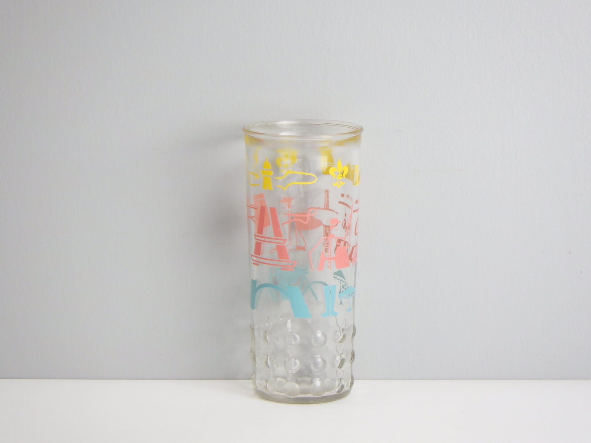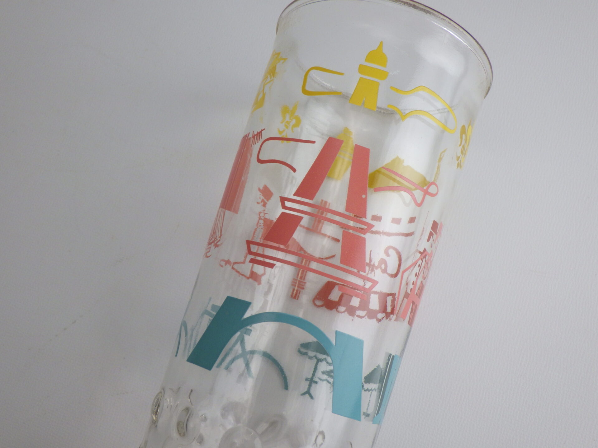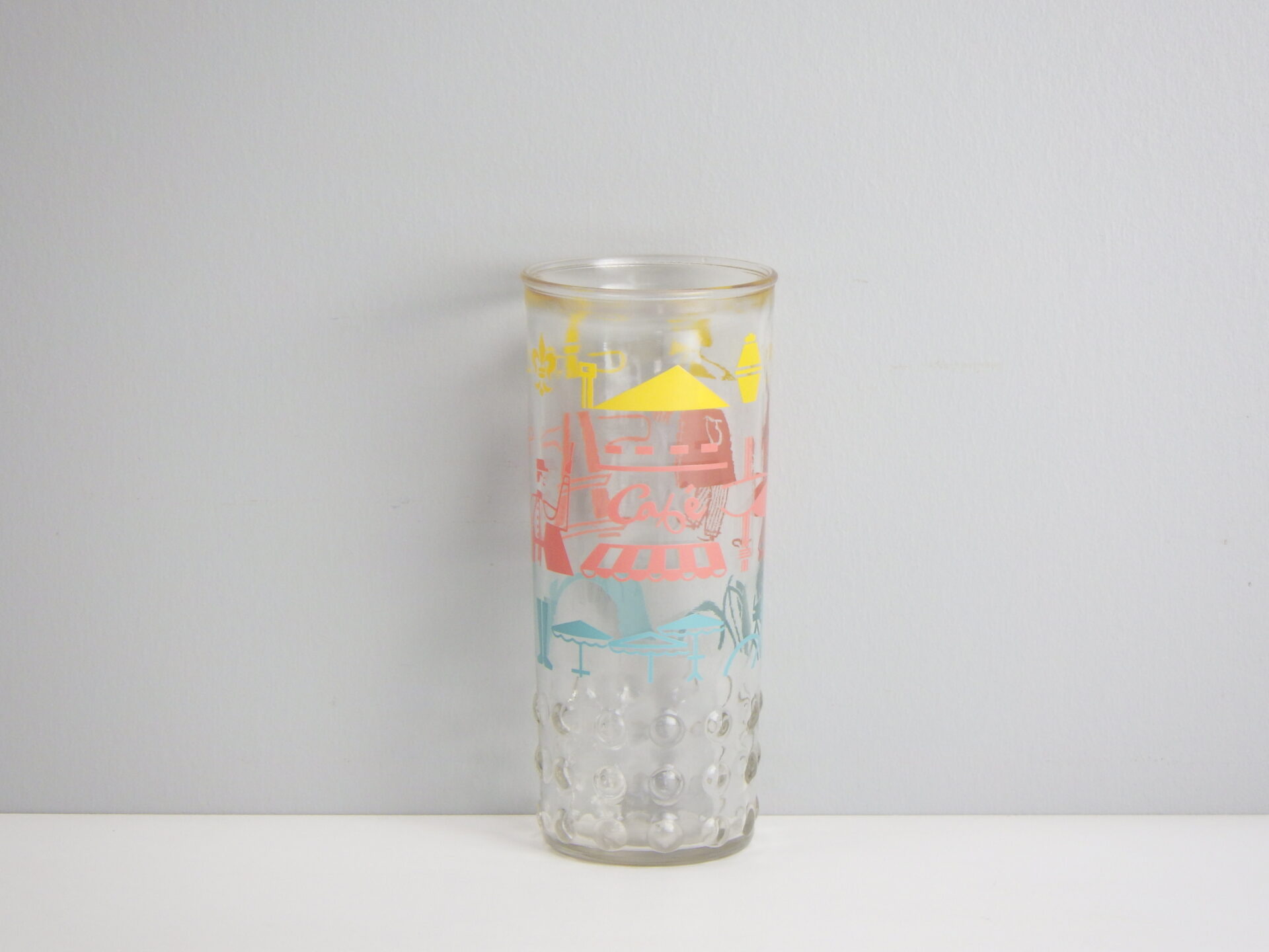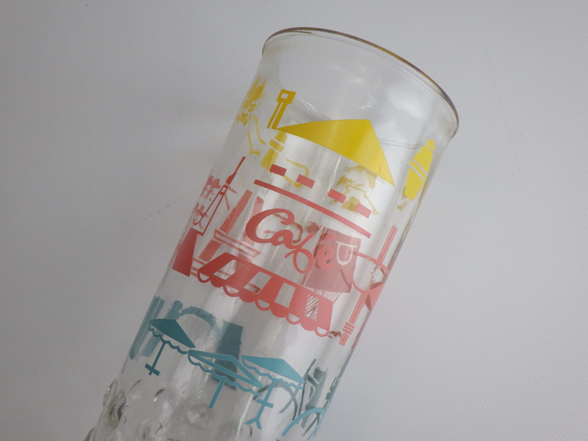 | アメリカで買い付けました。 パステルカラーで街並みがプリントされたビンテージグラスです。 下部がエンボス加工されており、滑り止めの意味合いもありますが、デザイン的にも非常に可愛い作りとなっています。 容量も大きいので、暑い時期は氷を沢山入れてアイスティーなど楽しまれてはいかがでしょうか? |