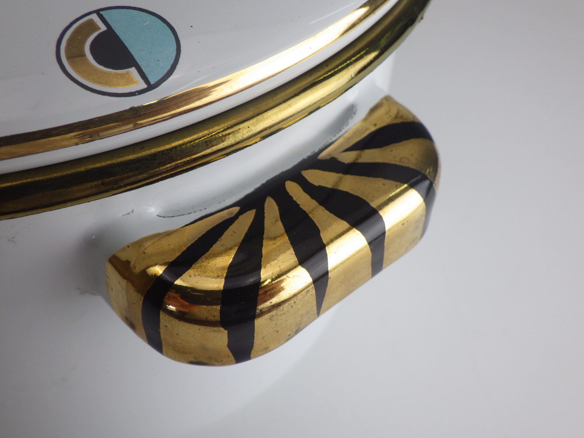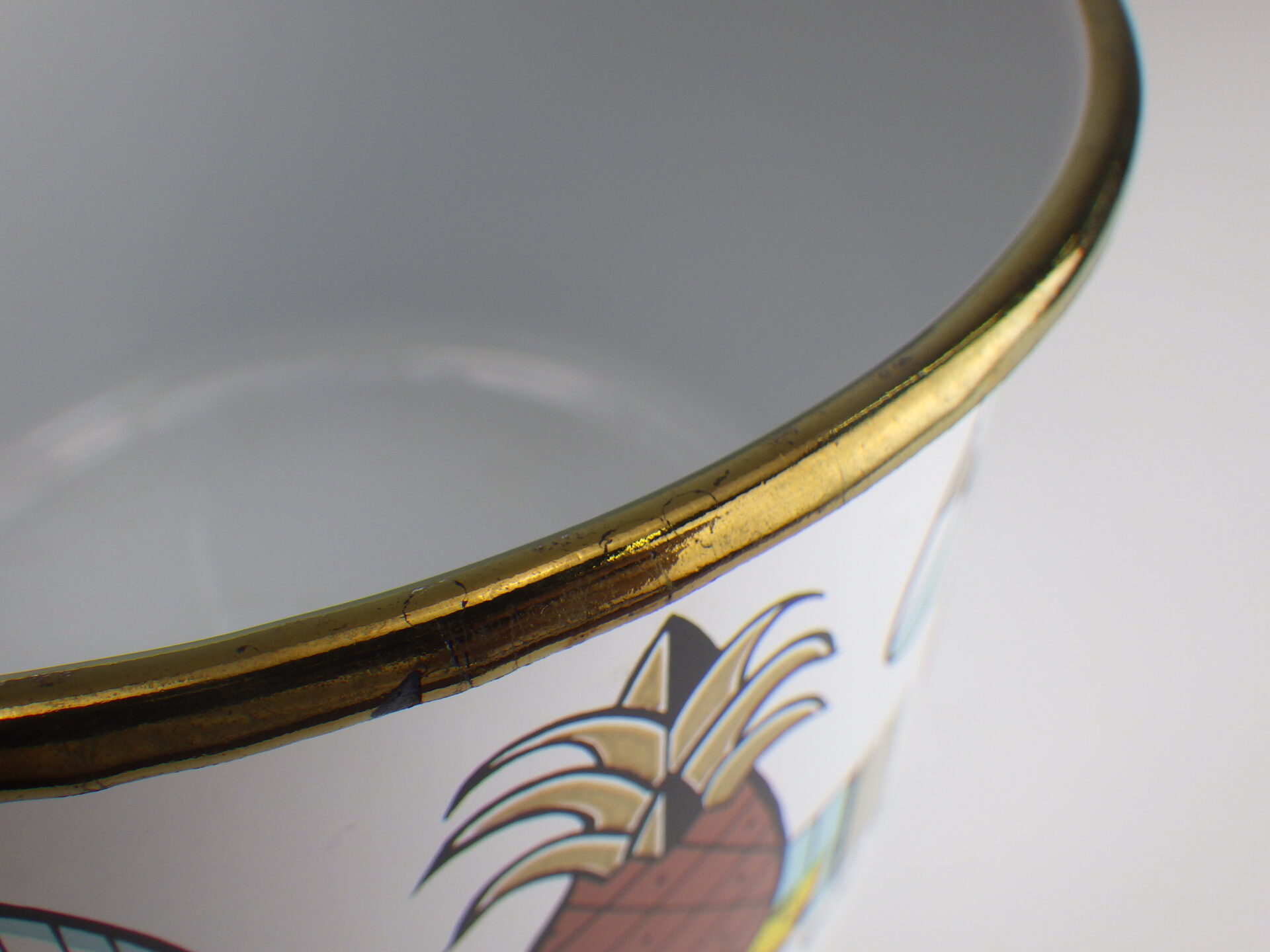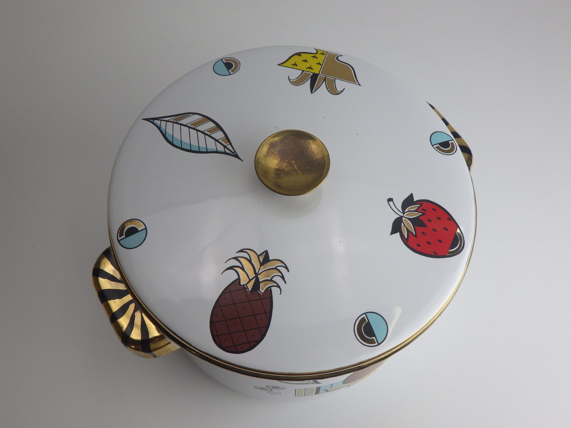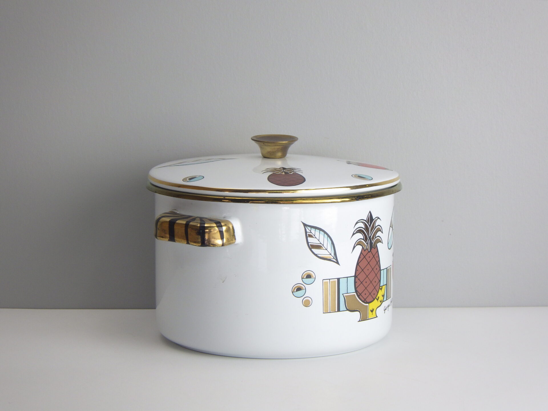 | 「Georges Briard」はウクライナ生まれ、アメリカ移民のミッドセンチュリーを代表するテーブルウェアデザイナーです。 特に金メッキ絵柄のアイテムが有名ですが、こちらは可愛いフルーツなどがモチーフとなった両手鍋です。 正面にはデザイナー本人のサイン、裏側には葉っぱがモチーフのプリントが施され、どの角度から見ても楽しめるデザインとなっています。 深めの作りとなっているので、たっぷり煮込み料理に使えそう。 キッチンを華やかにしてくれて、お料理の時間が楽しくなりそうですね。 |