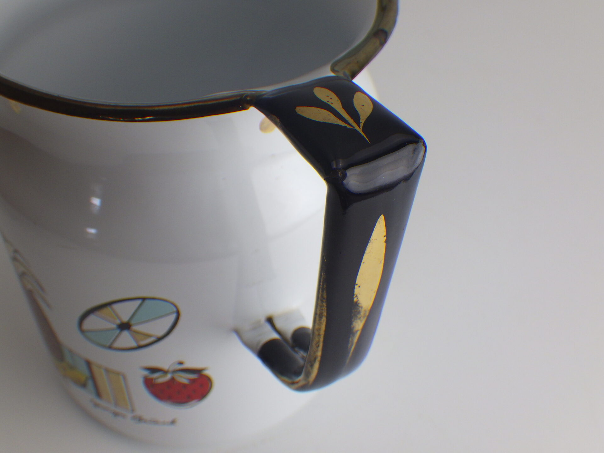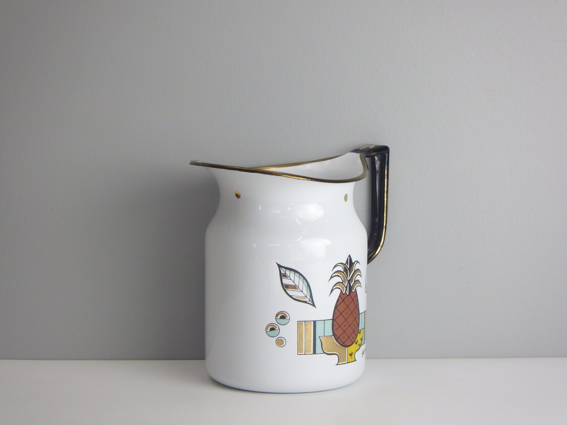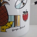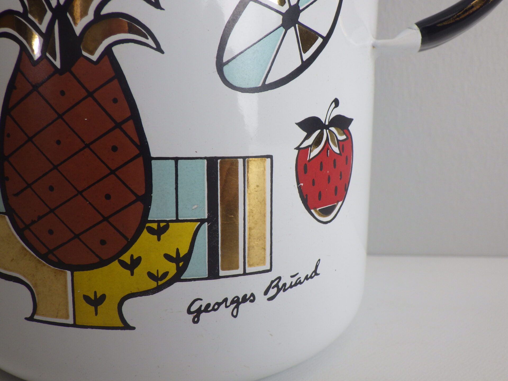 | 「Georges Briard」はウクライナ生まれ、アメリカ移民のミッドセンチュリーを代表するテーブルウェアデザイナーです。 特に金メッキ絵柄のアイテムが有名ですが、こちらは可愛いフルーツなどがモチーフとなった両手鍋です。 正面にはデザイナー本人のサイン、裏側には葉っぱがモチーフのプリントが施され、どの角度から見ても楽しめるデザインとなっています。 キッチン以外でも、植栽の際の水やりなどでも活躍してくれそうです。 |