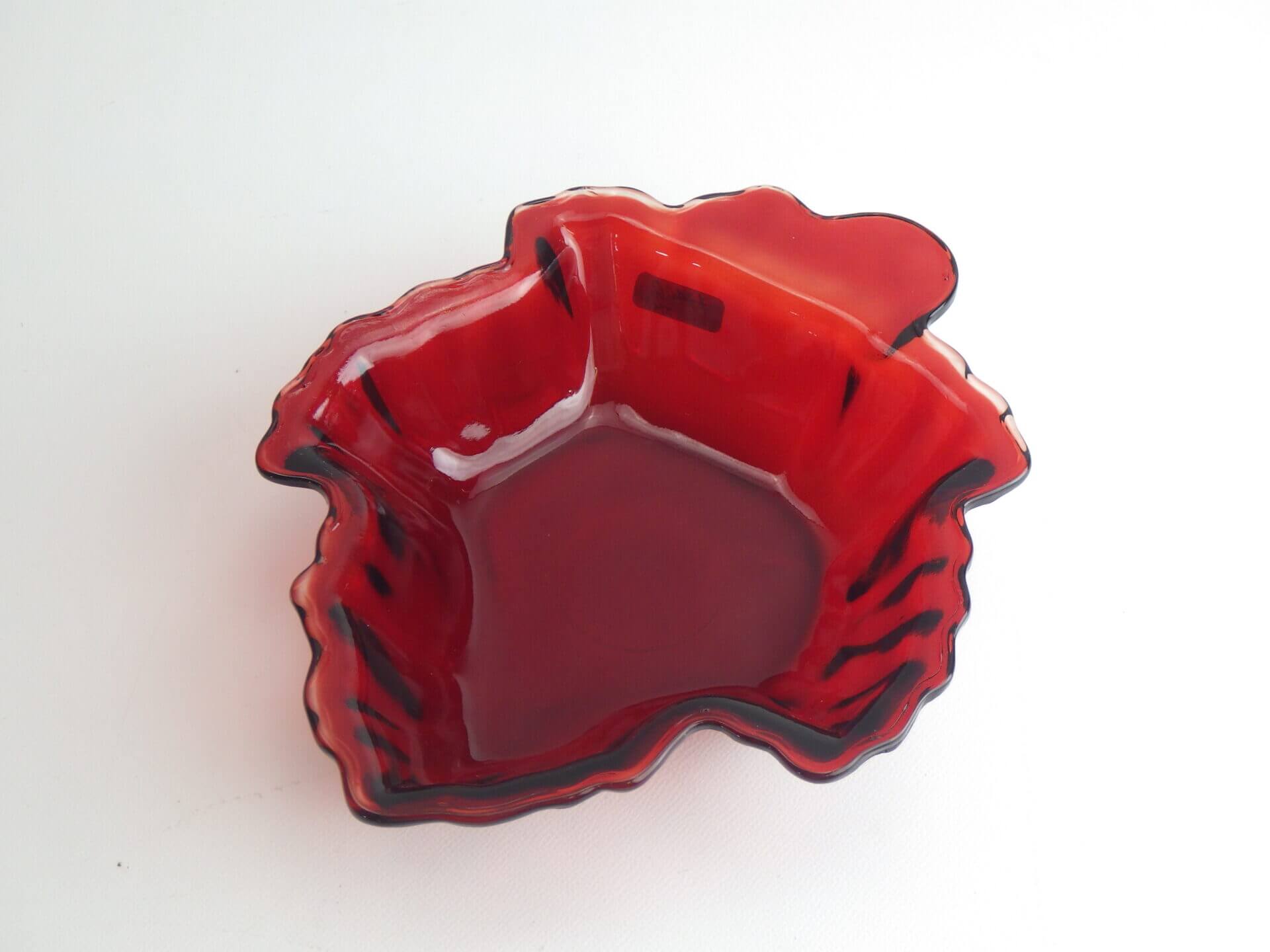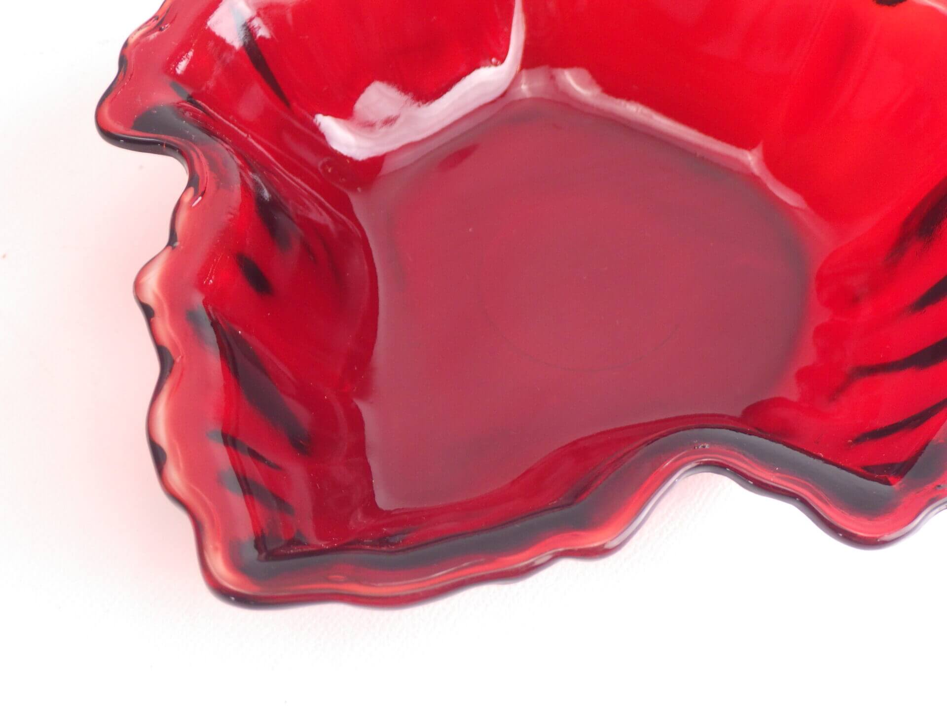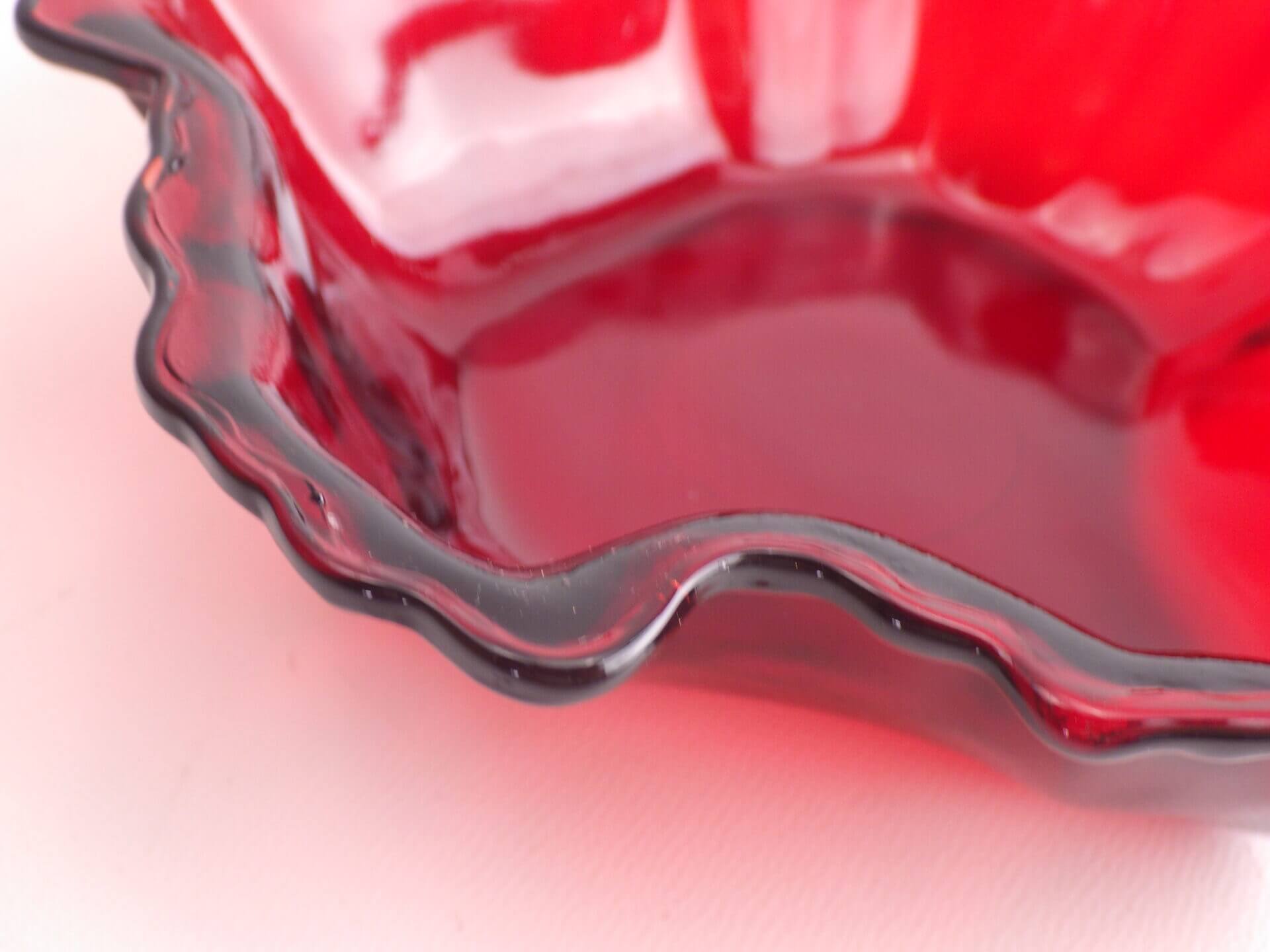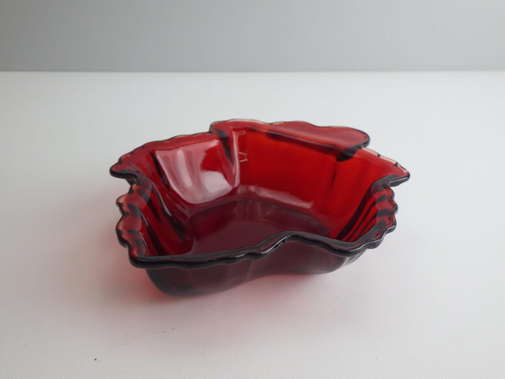 | ファイヤーキングでお馴染みの「アンカーホッキング社」のロイヤルルビー・キャンディディッシュです。 宝石の様に深い赤が美しいシリーズです。 アクセサリートレーや小物入れとしてお使いいただくのもおススメです。 |