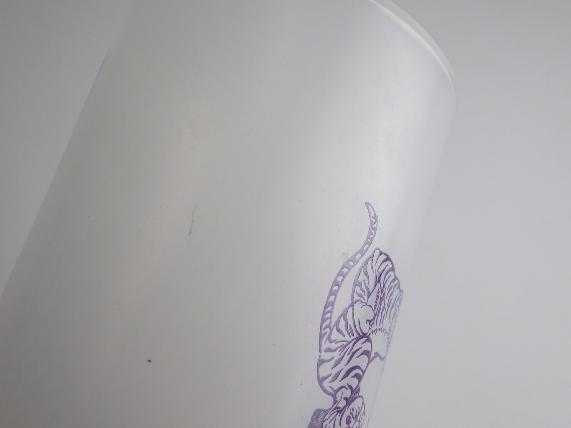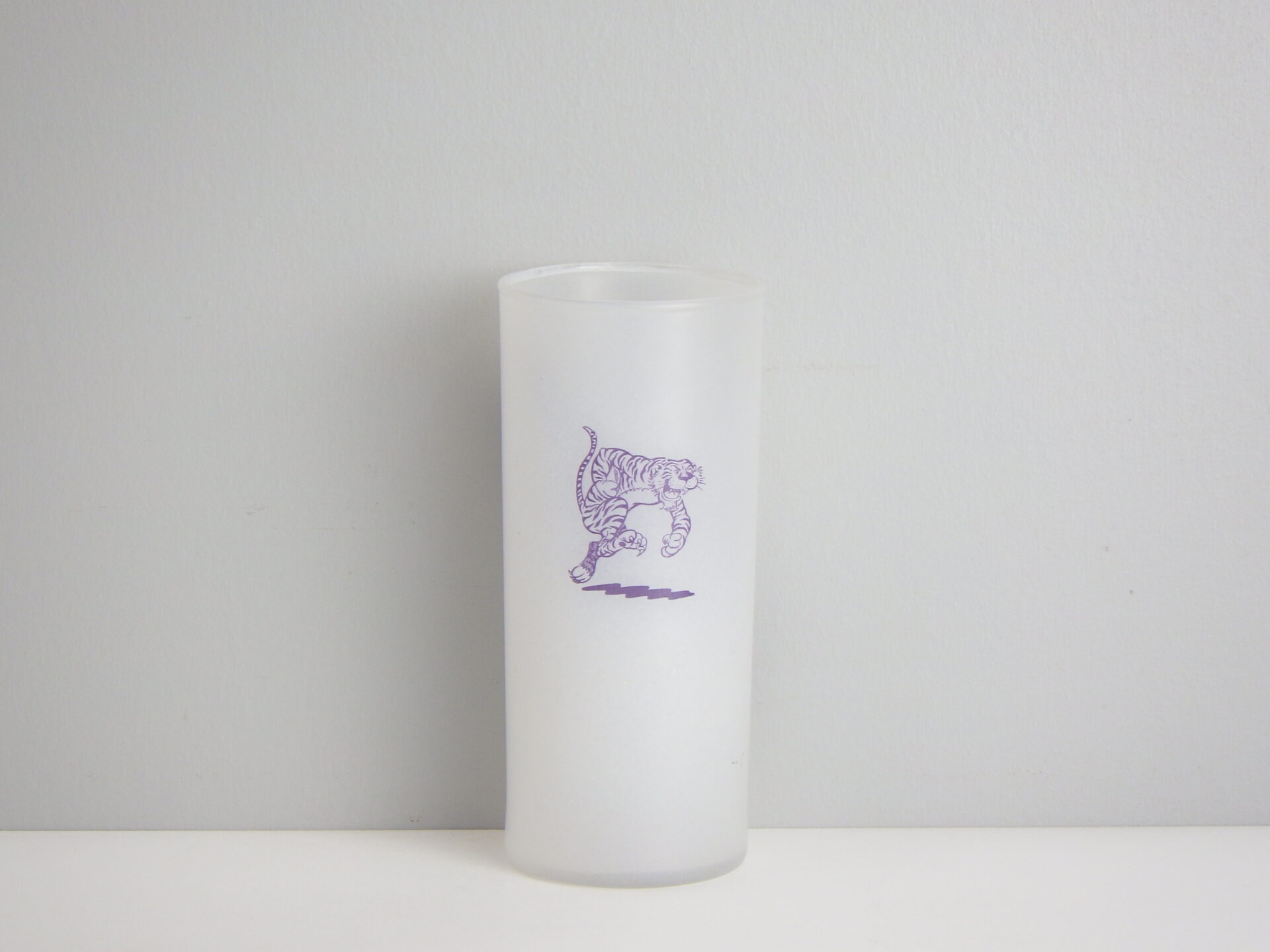 | アメリカで買い付けました。 大学のラグビーチームのペナントとキャラクターがプリントされたビンテージグラスです。 擦りガラス加工されており、滑り止めの意味合いもありますが、デザイン的にも非常に可愛い作りとなっています。 容量も大きいので、暑い時期は氷を沢山入れてアイスティーやジュースなど楽しまれてはいかがでしょうか? |
