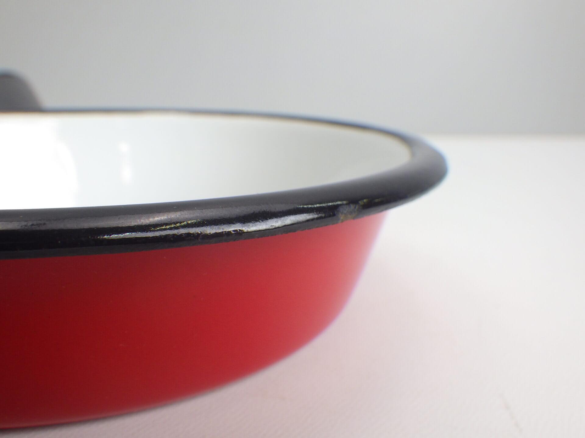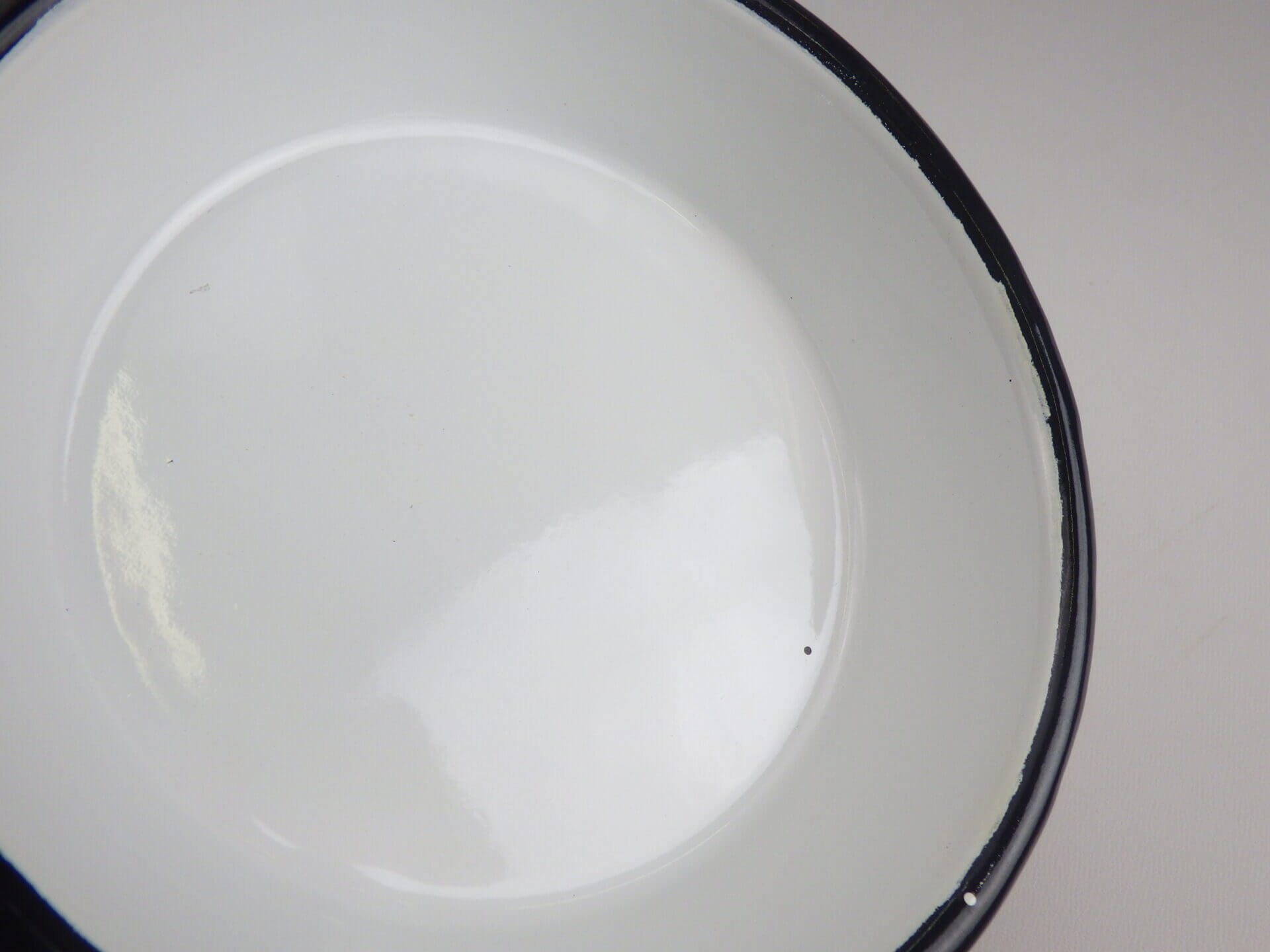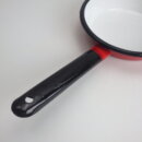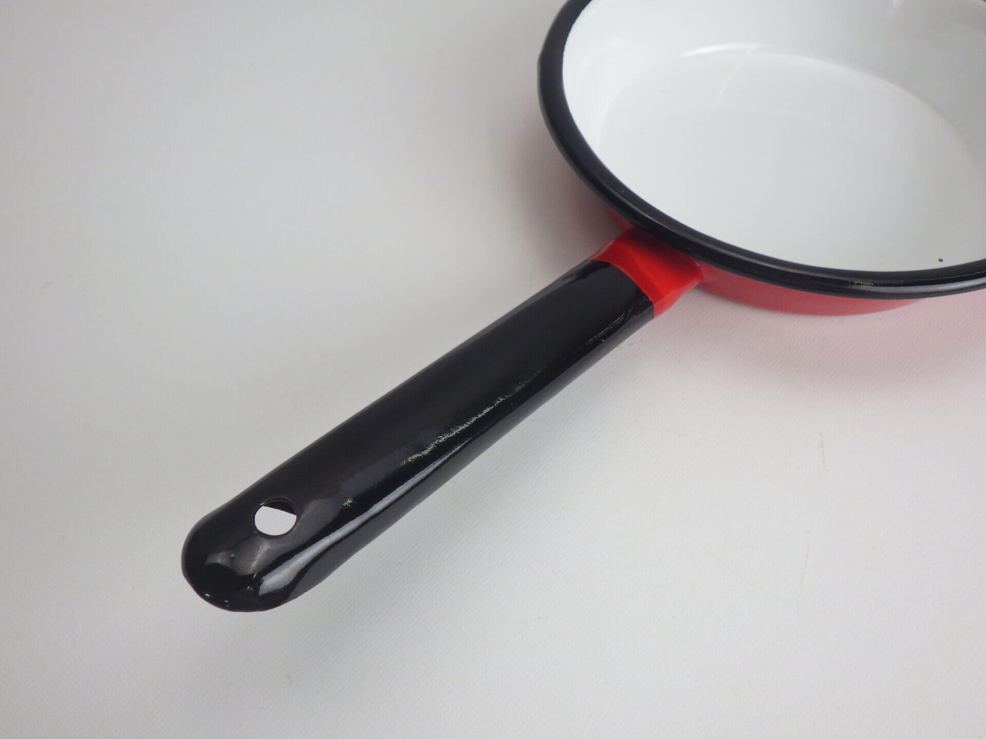 | 可愛らしいビンテージのエナメルパンです。 赤と黒と白の絶妙な色使いが、キッチンに吊るしているだけで何だか楽しい気分になるアイテムですね。 もちろんキャンプなどのアウトドアに持ち出すのにも、軽量かつコンパクトで、サイトのアクセントになりそう。 可愛いので料理を乗せたまま食卓へ運んでも良いですね。 |