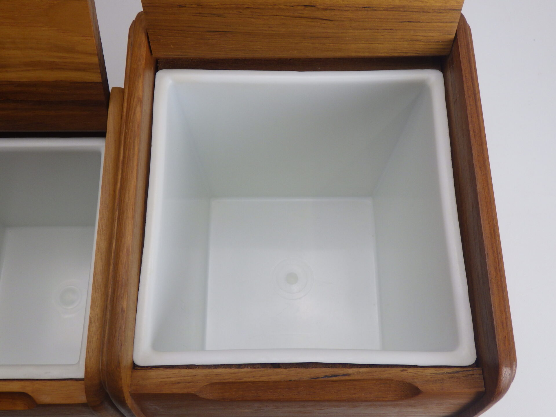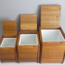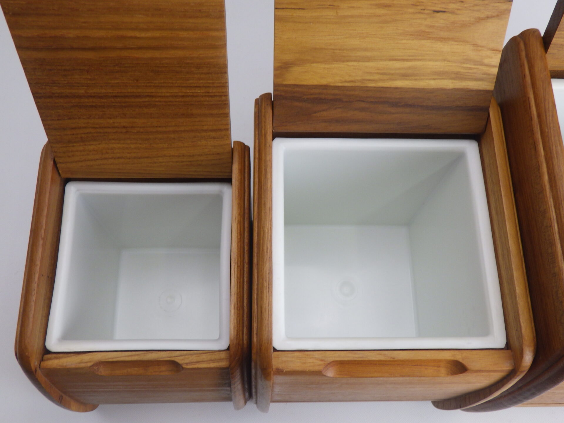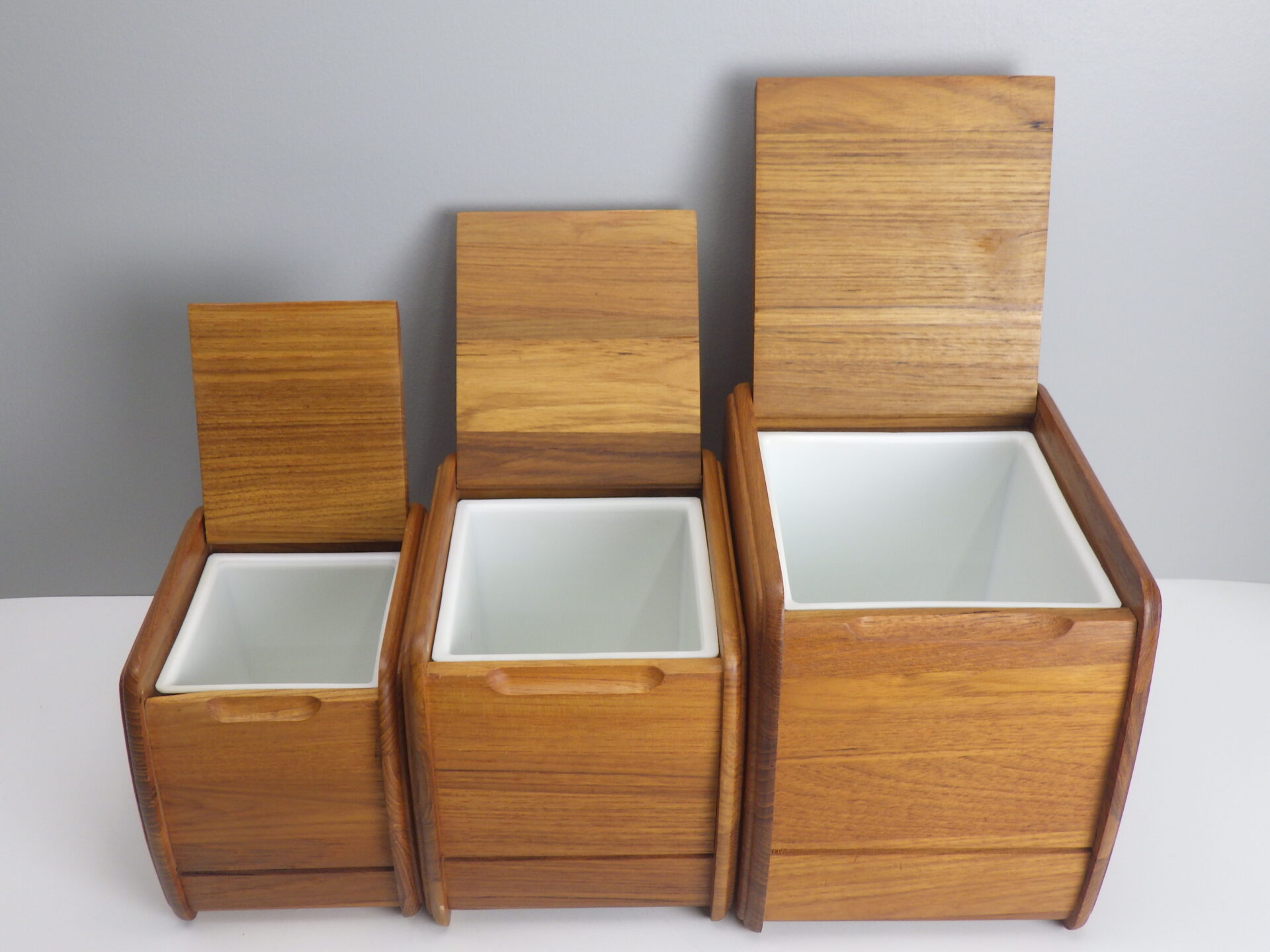| アメリカで買い付けました、木製のキャニスター3点セットです。 チーク材ならではの温かで上質な雰囲気が、キッチンを彩ってくれること間違いなしですね。 キッチン以外の場所でも物入として、オブジェとしても活躍してくれそうな佇まいです。 内部はプラスチック製で取り外し可能です。洗えるので清潔面でも安心ですね。 |