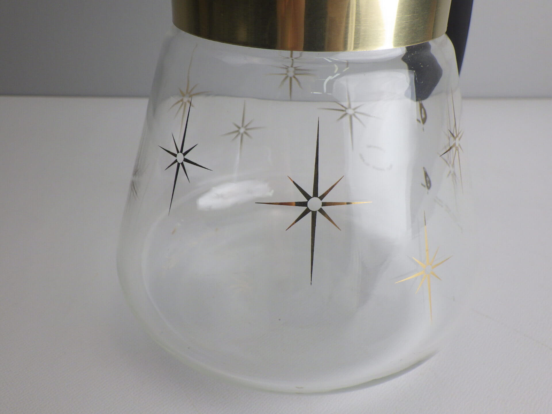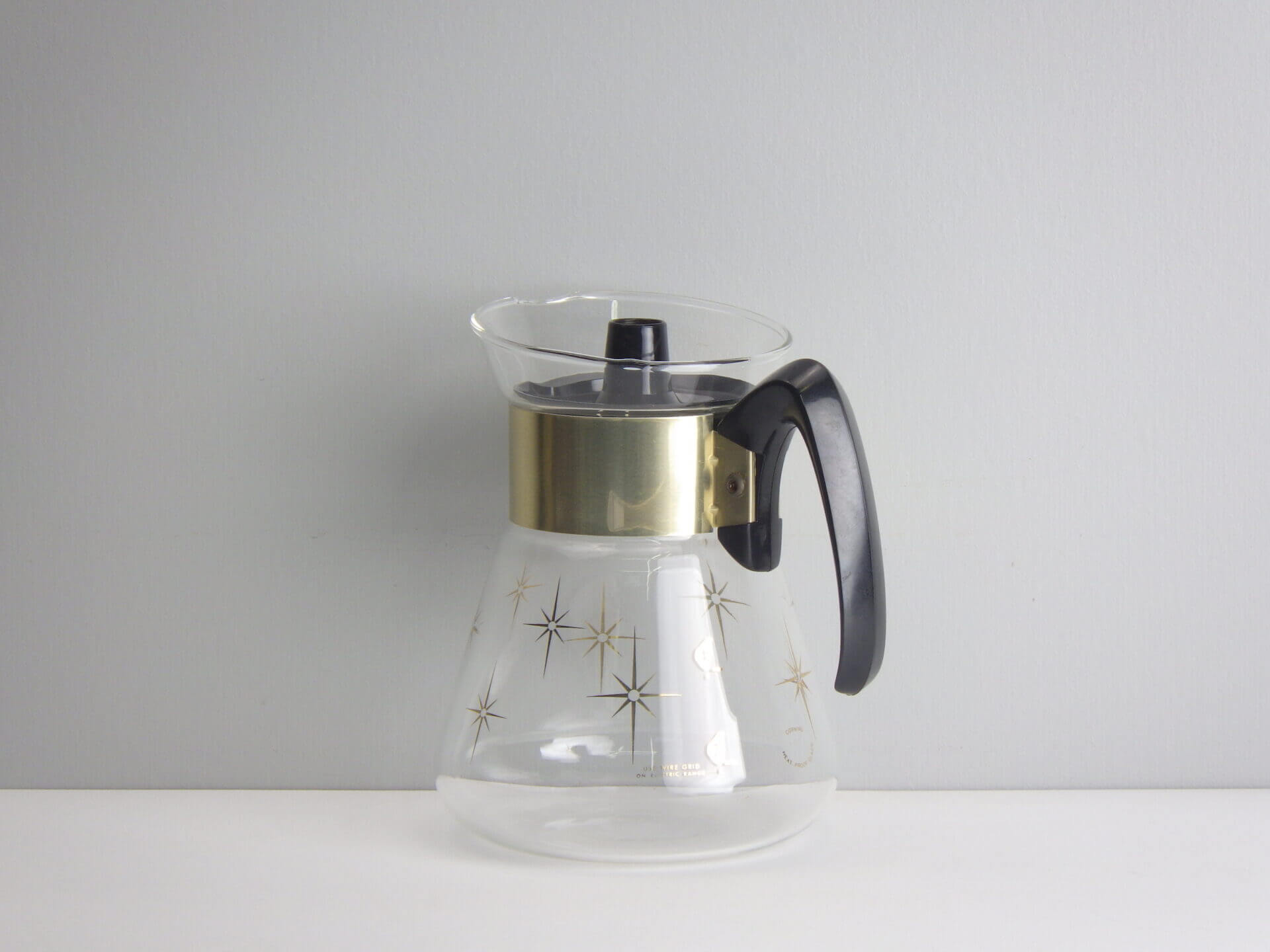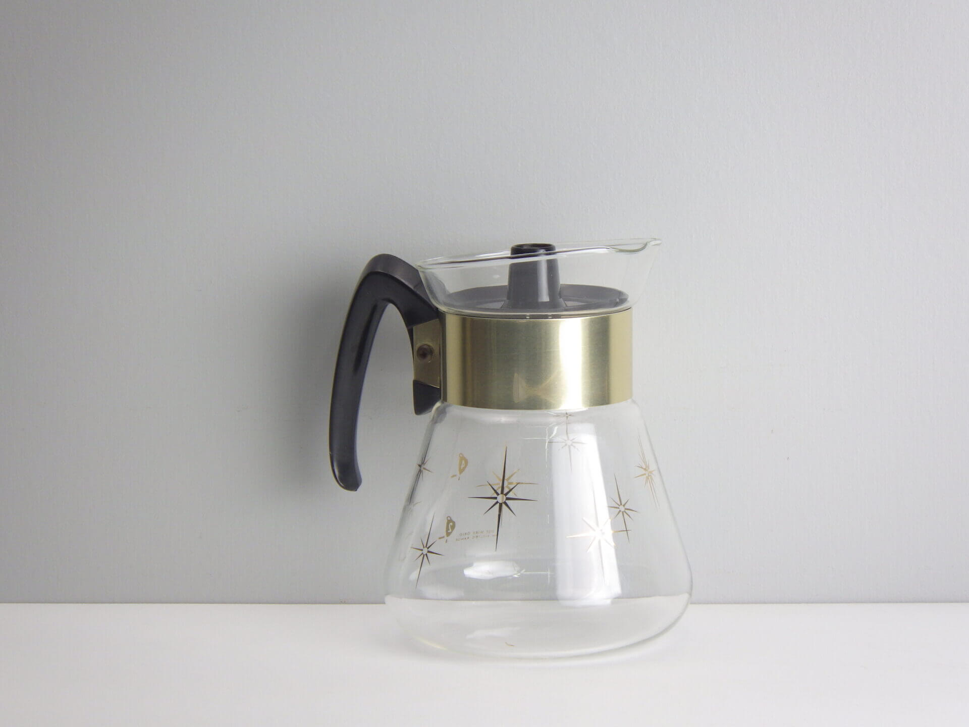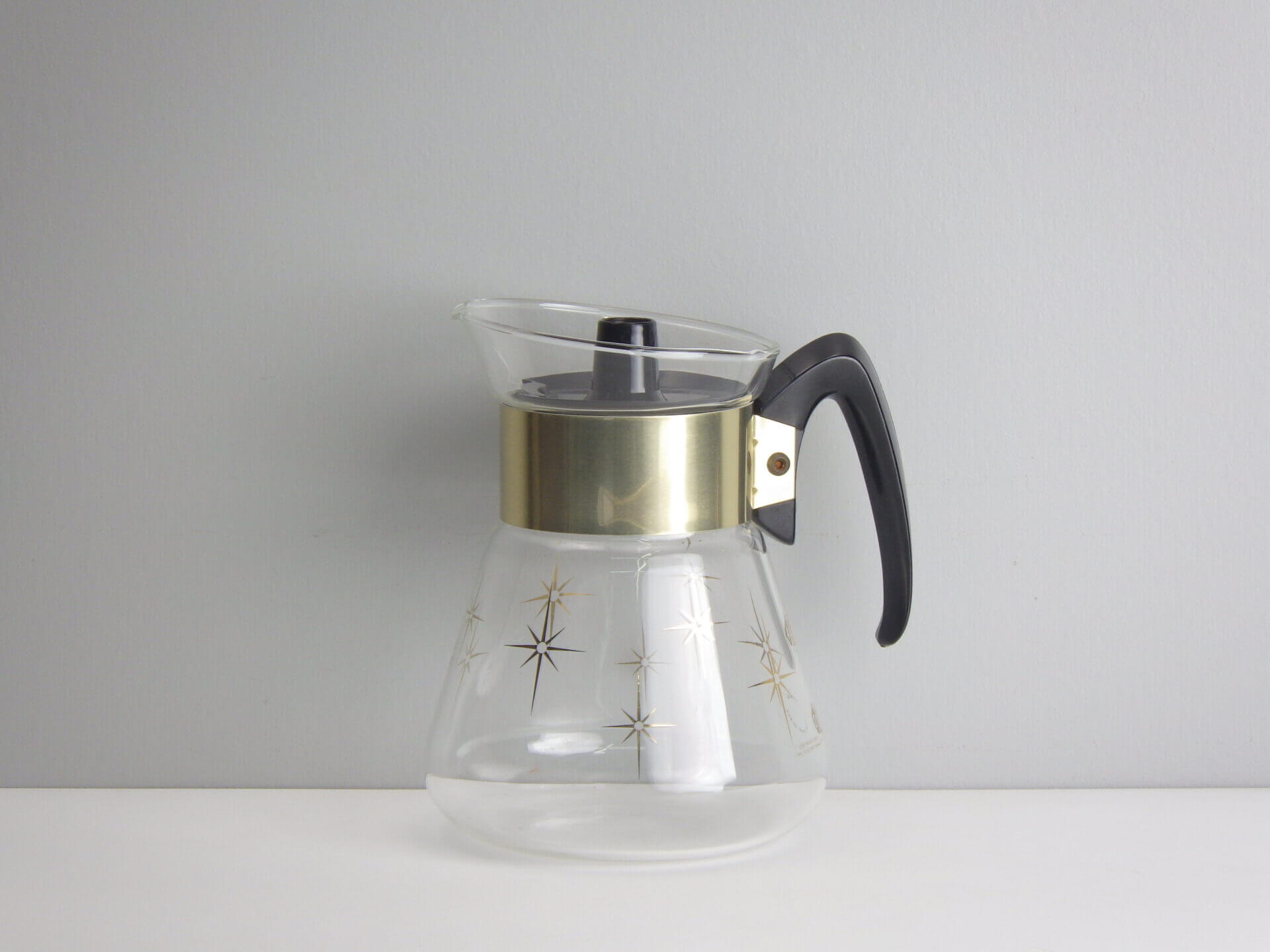 | パイレックスブランドでお馴染みのコーニング社製のビンテージカラフェです。 ゴールドの太めのバンドと星の光線を表現したスターバーストがゴージャスで、ちょっとしたティータイムを華やかにしてくれます。 また、水差しや花瓶などとしてご使用いただくのも良さそうです。 |
