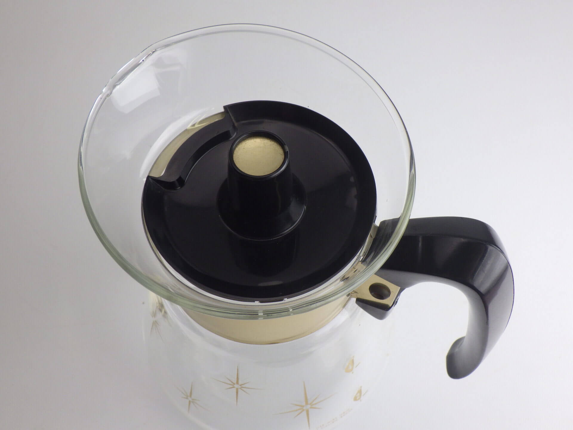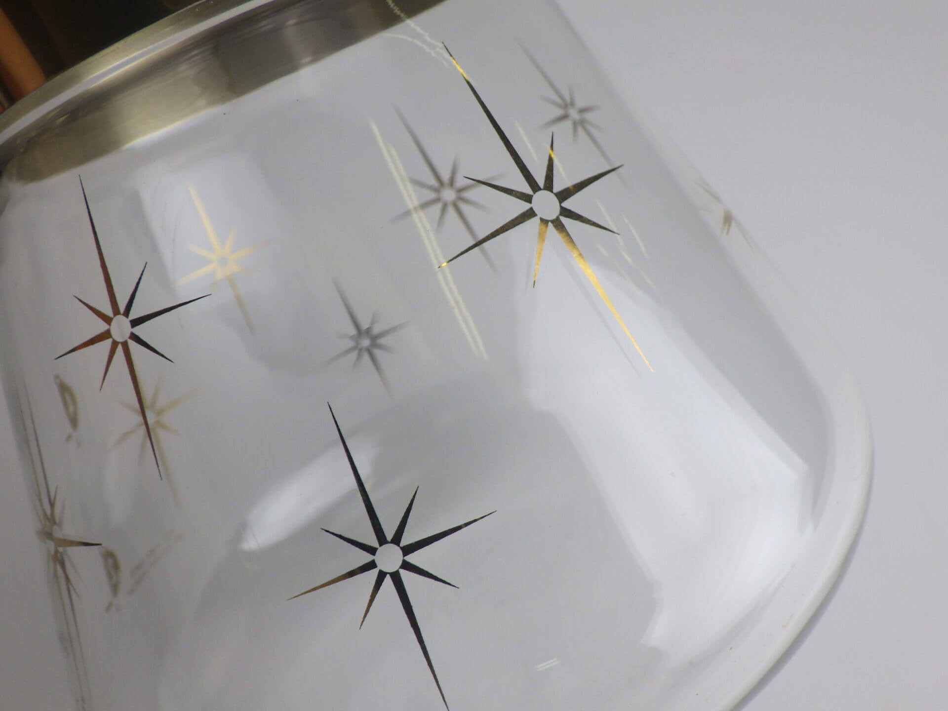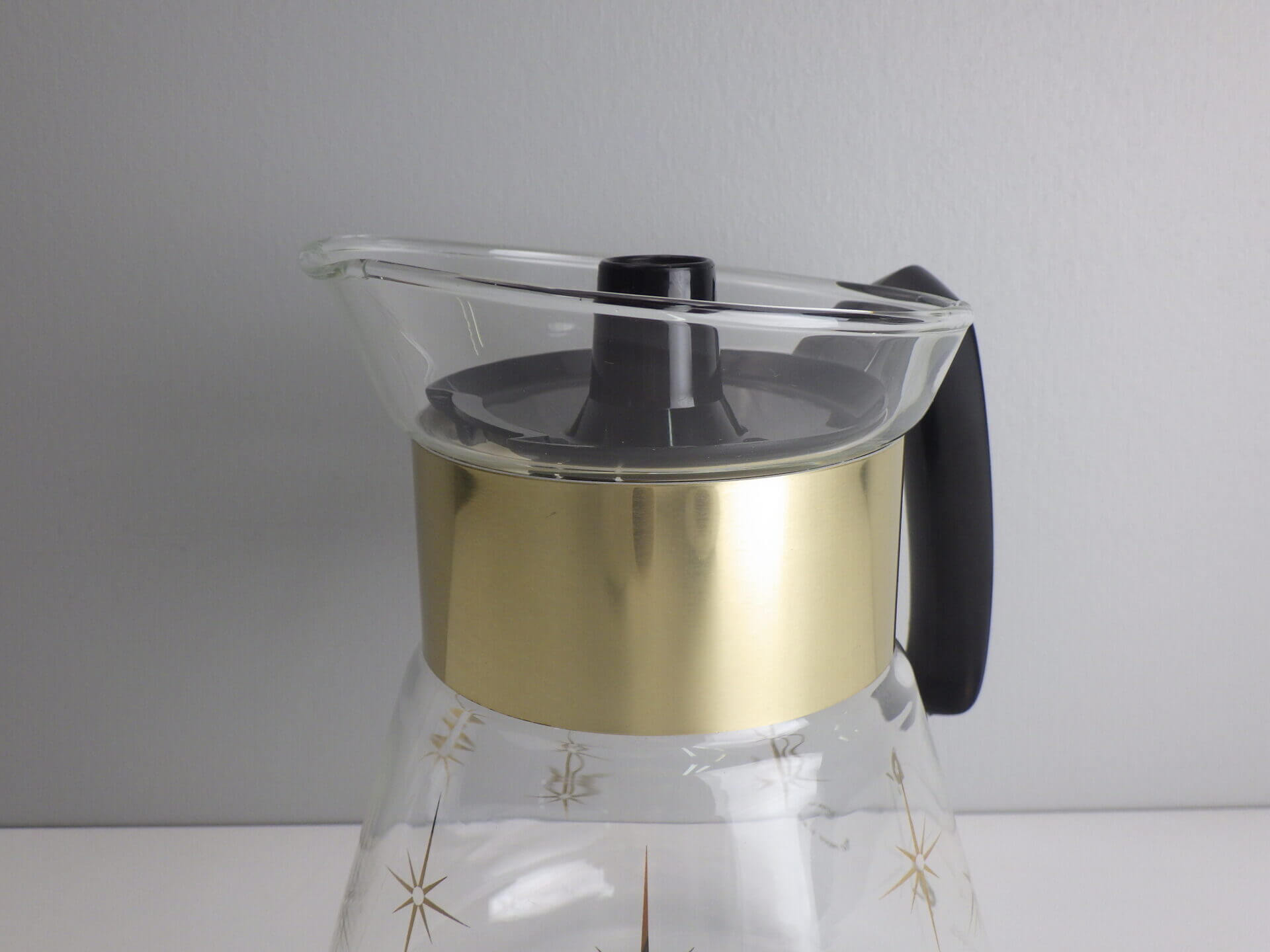| パイレックスブランドでお馴染みのコーニング社製のビンテージカラフェです。 ゴールドの太めのバンドと星の光線を表現したスターバーストがゴージャスで、ちょっとしたティータイムを華やかにしてくれます。 また、水差しや花瓶などとしてご使用いただくのも良さそうです。 |